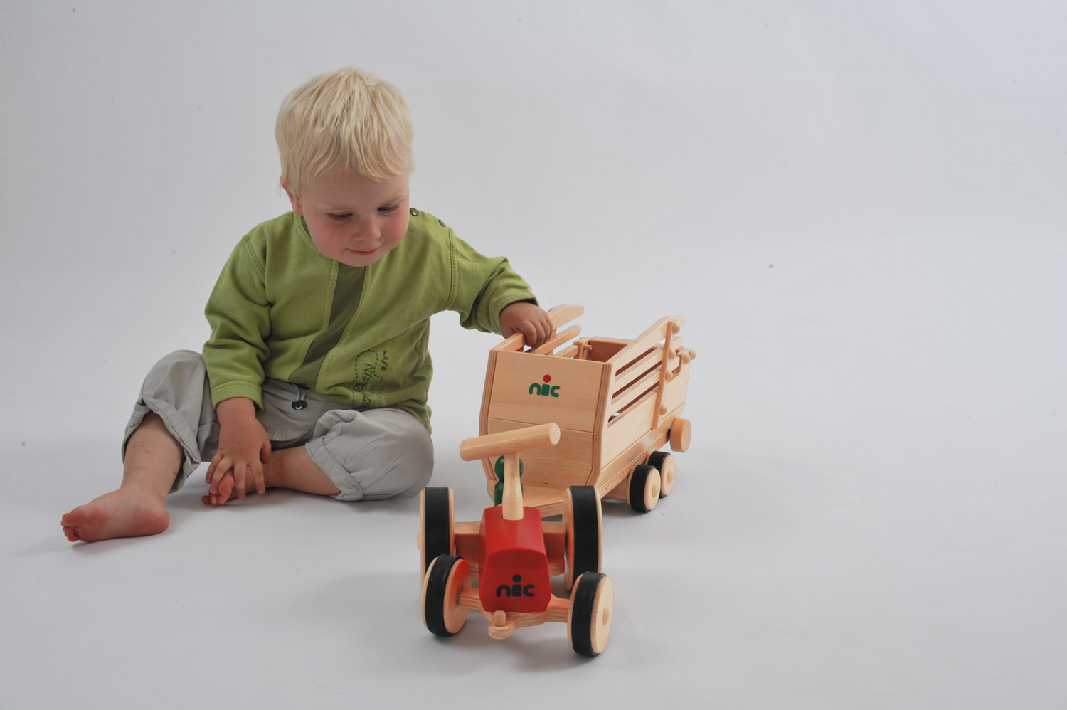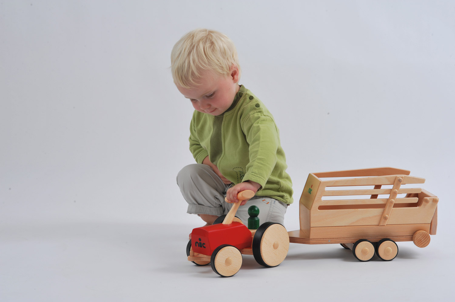 Der Ladewagen mit einem über Drehknöpfe beweglichem Transportband ist ein echter Alleskönner unter den Nutzfahrzeug-Zubehörteilen. Sowohl auf dem Kinder-Bauernhof zum Transport von Materialien oder Tieren als auch zu vielen anderen Arbeitseinsätzen ist der stabile Anhänger eine große Hilfe. Er passt zu allen creamobil-Fahrzeugen. Zu den Traktoren wie auch zu den Grundmodellen. Wie alle Holzfahrzeuge aus der creamobil-Serie wird auch unser Ladewagen aus wertigem Buchen-Massivholz mit Sorgfalt und viel Liebe zum Detail hergestellt. Wir begegnen hier einer zeitlosen Holzspielzeug-Welt, die Kindern einfach Freude bereitet. Die großen creamobil-Holzfahrzeuge kommen frei und kreativ im Spiel der Kinder zum Einsatz und sind dank ihrer Stabilität und der steten Erweiterungsmöglichkeiten Begleiter durch viele bunte Kinderjahre. Mit der wunderbaren creamobil-Spielewelt von nic entdecken und erleben Kinder spielerisch nachahmend ihre Welt. Da wird gemeinsam tüchtig geschafft – auf der Baustelle mit allen notwendigen Nutzfahrzeugen wie Baggern, Förderbändern oder einem Hochkran und am Bauernhof mit Traktoren und diversen Anhängern. Verschiedene Aufsätze, Anhängertypen und Umbaumöglichkeiten machen aus den hochwertigen, stabilen creamobil-Fahrzeugen aus massivem Buchenholz echte Alleskönner und sind im Spiel der Kinder sehr vielfältig einsetzbar. So geht es mit dem umgerüsteten creamobil-Grundmodell zum Beispiel auch zum Campingurlaub, auf einen Familienausflug oder eine gemeinsame Busfahrt. Kinder erleben die Welt um sich herum mit großer Neugier und Offenheit. Durch das nachahmende Spiel tasten sich Kinder fühlend und erlebend in diese Welt hinein, verarbeiten Eindrücke und ordnen so gleichsam das Erlebte in ihrem Inneren. Gute, hochwertige Holzspielzeuge, die den Kindern im Spiel möglichst viel Gestaltungsspielraum und Freiheit lassen, fördern so diesen Prozess spielerischen Begreifens. Neben der hochwertigen Verarbeitung und der wertvollen Naturwerkstoffe ist es dieser pädagogische Sinn, der die nic Holzspielzeuge so besonders macht.