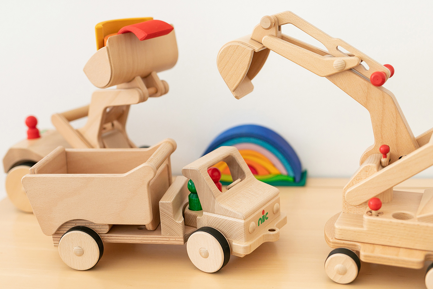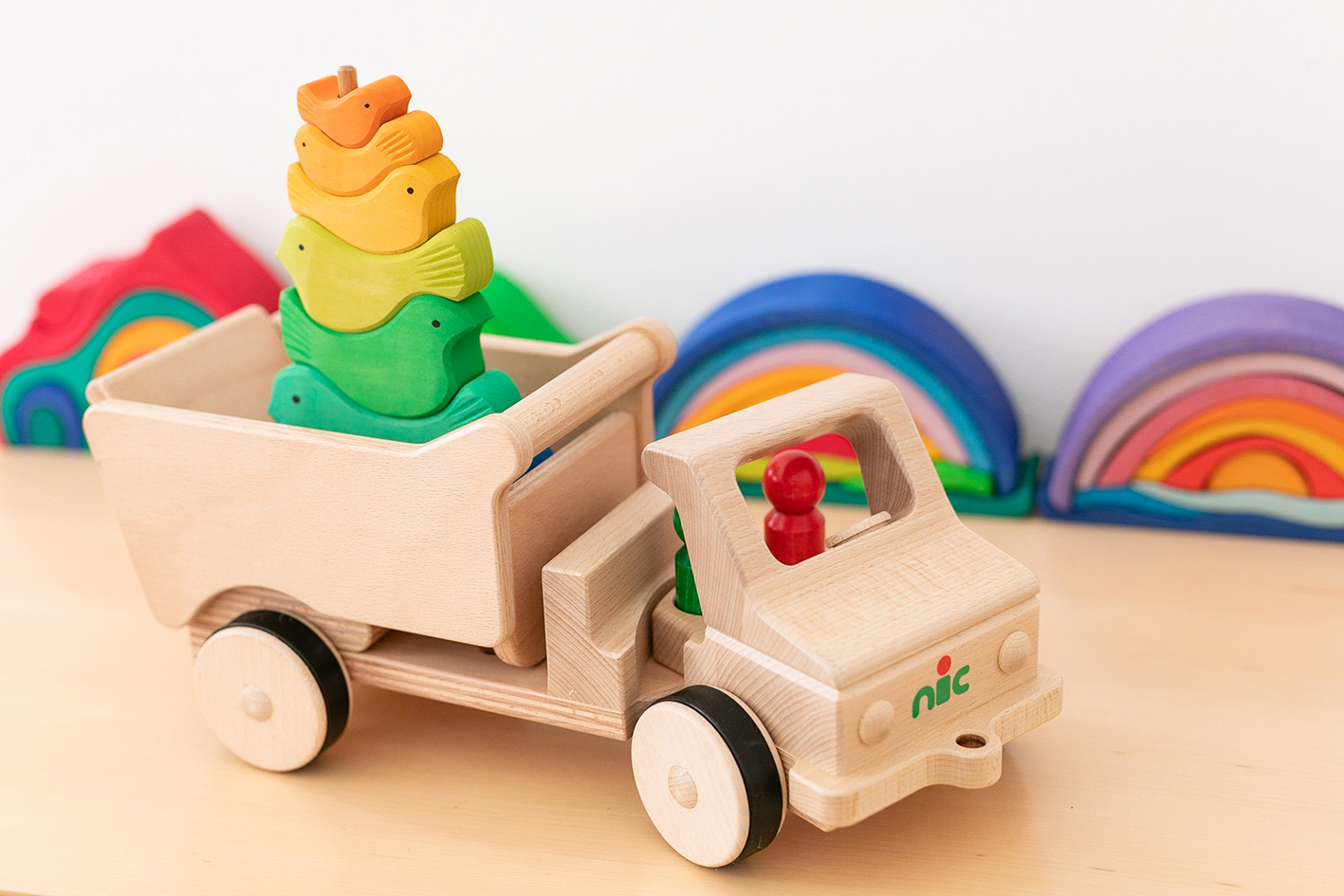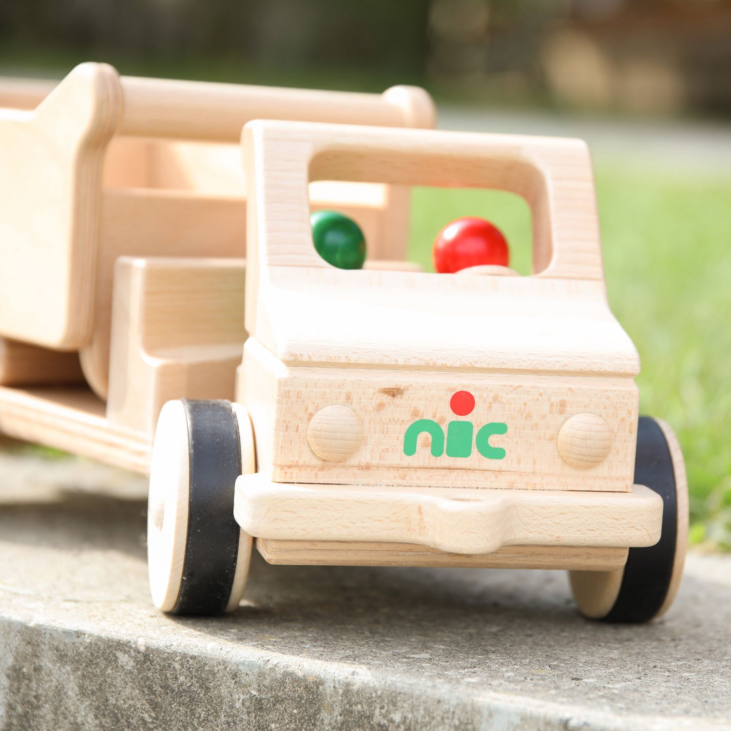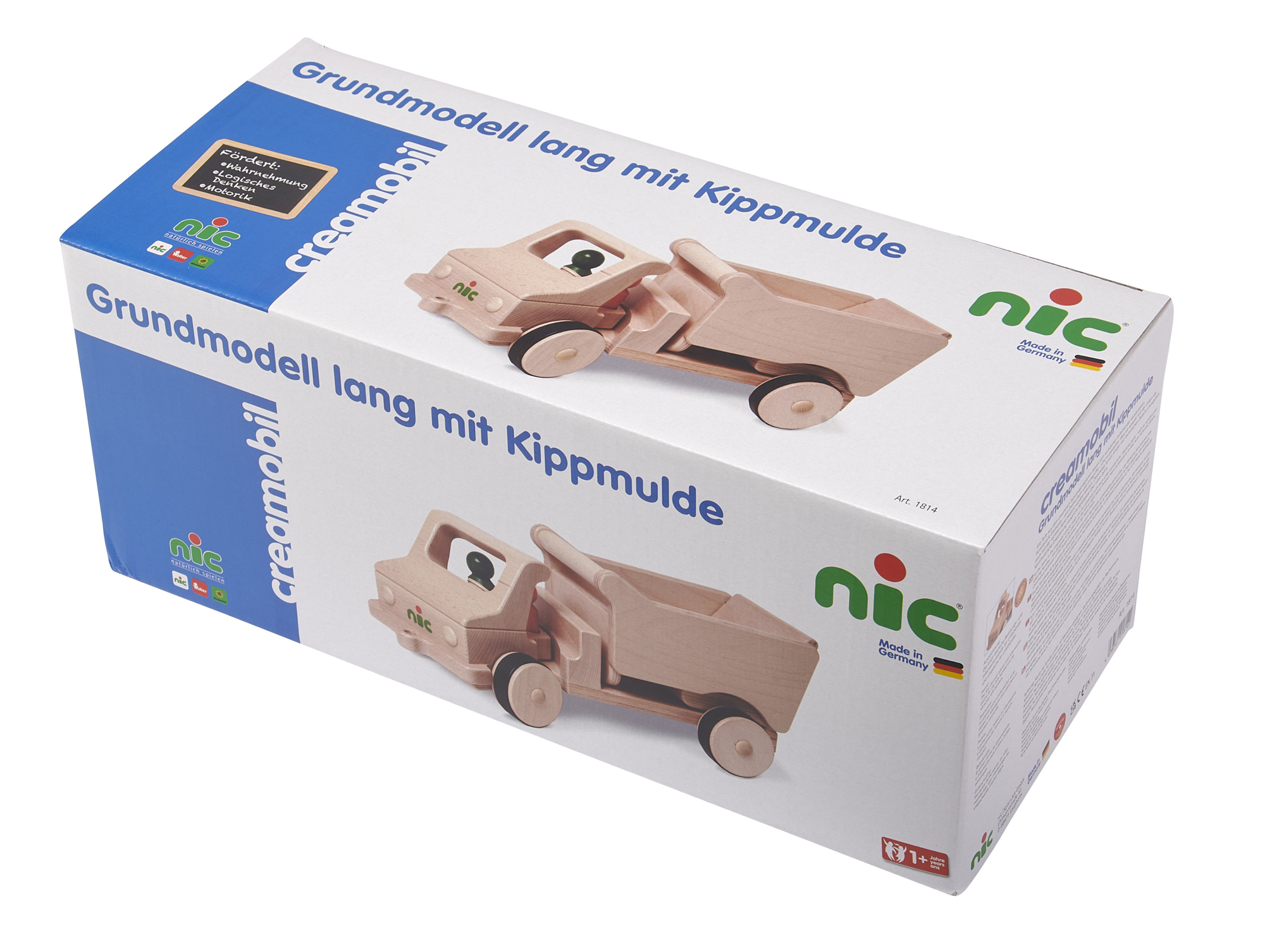 Ein tolles Einstiegsmodell in die wunderbare Welt der nic creamobile. Das lange Grundmodell kombiniert mit der Kippmulde wird hier zum stabilen und voll funktionsfähigen Lastwagen mit Kippfunktion für das zu transportierende Schüttgut. So kann – zum Beispiel in Zusammenarbeit mit Bagger und Kran – tüchtig auf der Kinderbaustelle geschafft werden. Die Kippmulde selber ist abnehmbar, sodass das stabile Holzfahrzeug im Handumdrehen und entsprechend des Spielverlaufes „verwandelt“ werden kann. Das lange Grundmodell ist ca. 42 cm lang und aus massivem Buchenholz in sorgfältiger Handarbeit gefertigt. Es kann mit allen Zubehör-Teilen – den Aufsätzen, Anhängern, Sitzbänken und Holzfiguren – beliebig und individuell erweitert werden. Der seit Jahrzehnten bewährte Lenkgriff der creamobil-Grundmodelle erlaubt bereits einjährigen Kindern ein kippsicheres Abstützen. Das robuste Buchen-Massivholz und die eingebauten Stahlachsen lassen ein Gewicht von mindestens 70 kg zu. Die großen creamobil-Holzfahrzeuge kommen frei und kreativ in vielen Spielwelten zu Einsatz und sind dank ihrer Stabilität und der steten Erweiterungsmöglichkeiten Begleiter durch viele bunte Kinderjahre. Mit der wunderbaren creamobil-Spielewelt von nic entdecken und erleben Kinder spielerisch nachahmend ihre Welt. Da wird gemeinsam tüchtig geschafft – auf der Baustelle mit allen notwendigen Nutzfahrzeugen wie Baggern, Förderbändern oder einem Hochkran und am Bauernhof mit Traktoren und diversen Anhängern. Verschiedene Aufsätze, Anhängertypen und Umbaumöglichkeiten machen aus den hochwertigen, stabilen creamobil-Fahrzeugen aus massivem Buchenholz echte Alleskönner und sind im Spiel der Kinder sehr vielfältig einsetzbar. So geht es mit dem umgerüsteten creamobil-Grundmodell zum Beispiel auch zum Campingurlaub, auf einen Familienausflug oder eine gemeinsame Busfahrt. Kinder erleben die Welt um sich herum mit großer Neugier und Offenheit. Durch das nachahmende Spiel tasten sich Kinder fühlend und erlebend in diese Welt hinein, verarbeiten Eindrücke und ordnen so gleichsam das Erlebte in ihrem Inneren. Gute, hochwertige Holzspielzeuge, die den Kindern im Spiel möglichst viel Gestaltungsspielraum und Freiheit lassen, fördern so diesen Prozess spielerischen Begreifens. Neben der hochwertigen Verarbeitung und der wertvollen Naturwerkstoffe ist es dieser pädagogische Sinn, der die nic Holzspielzeuge so besonders macht.