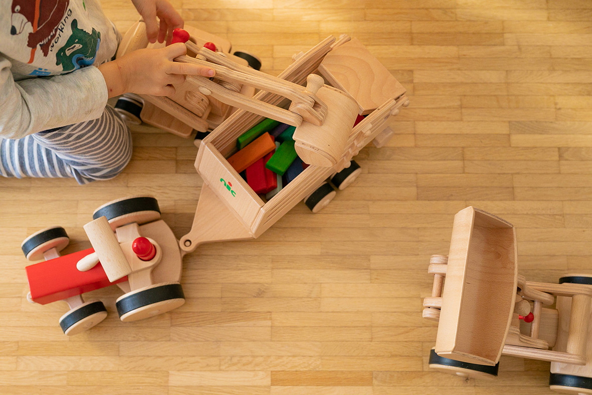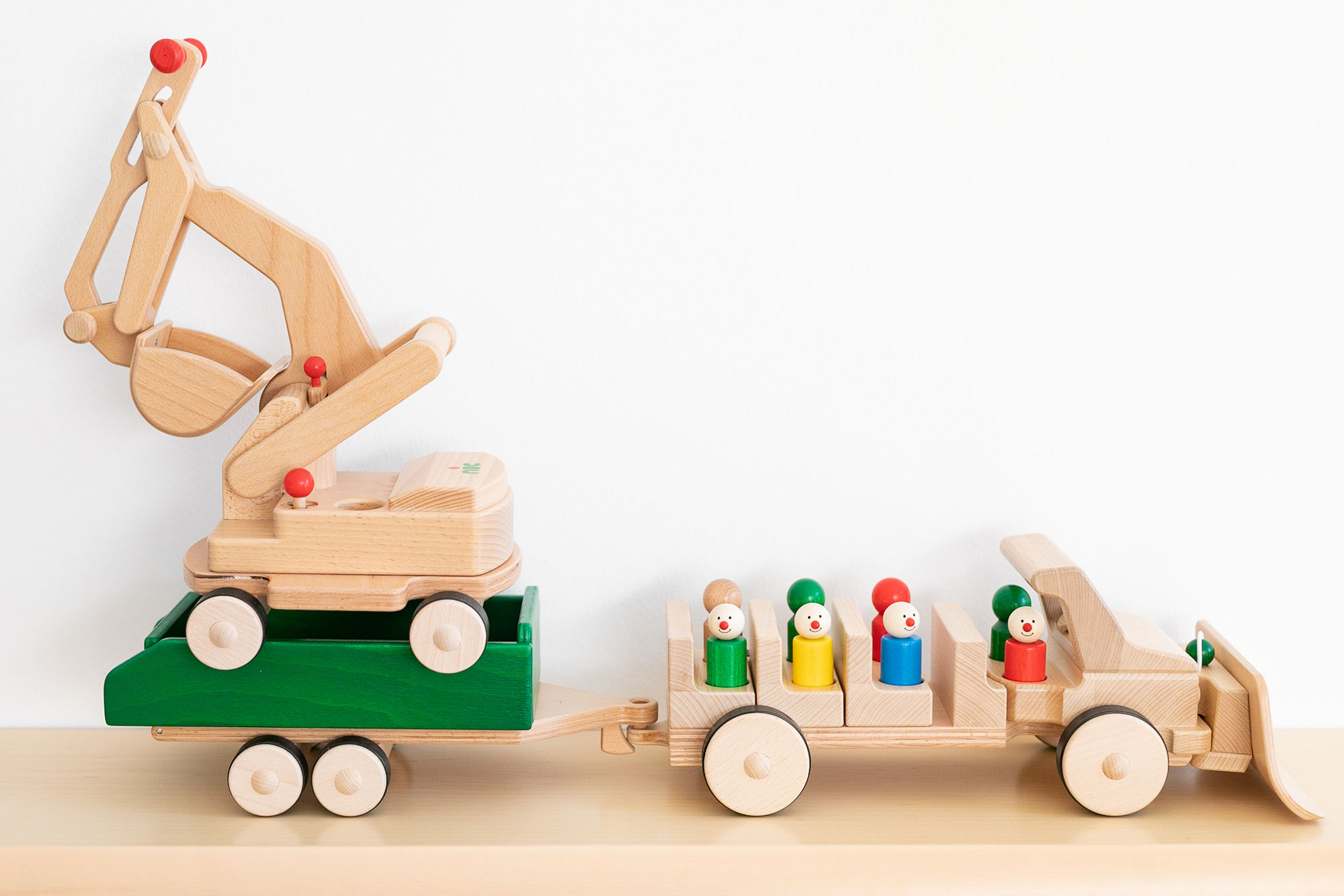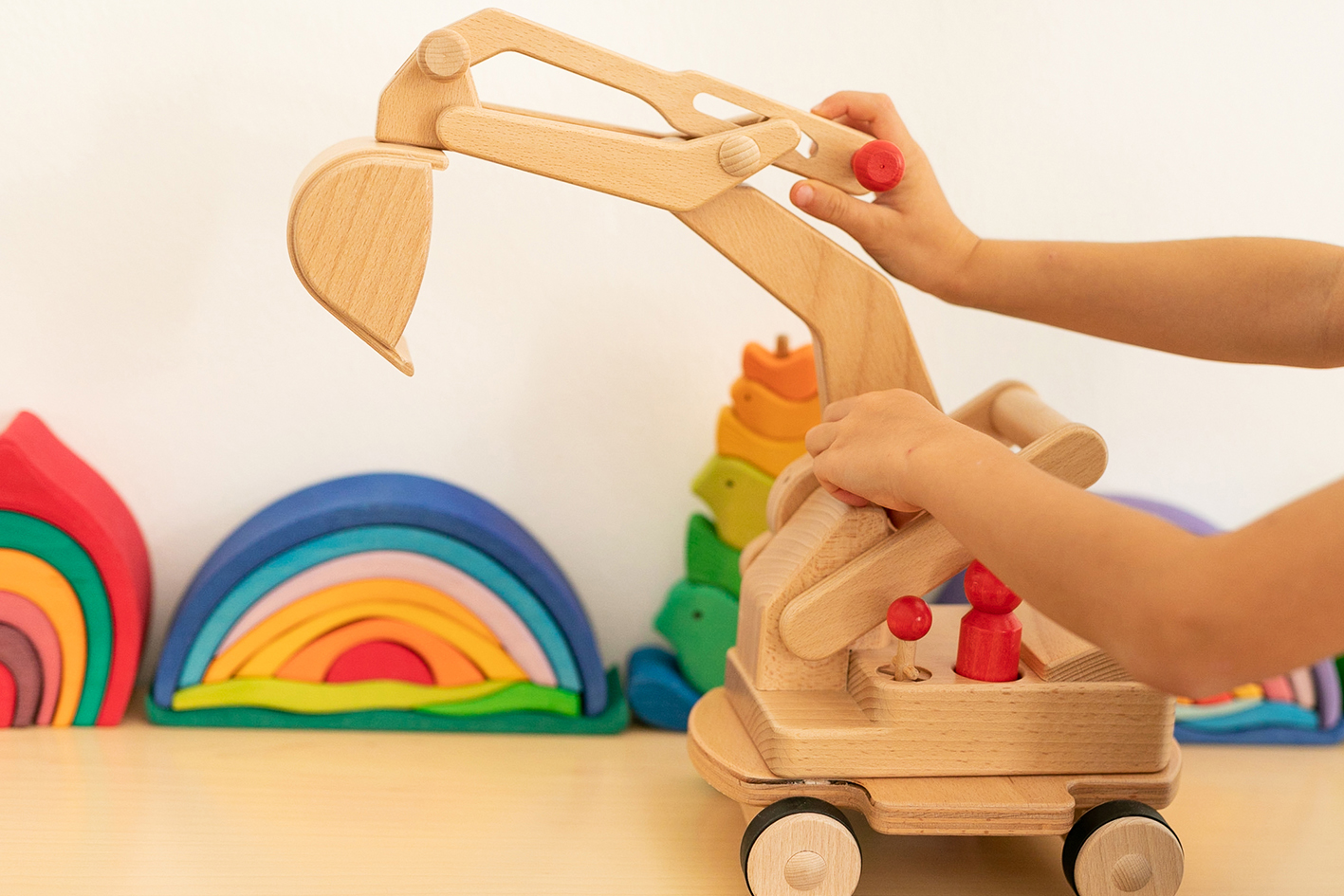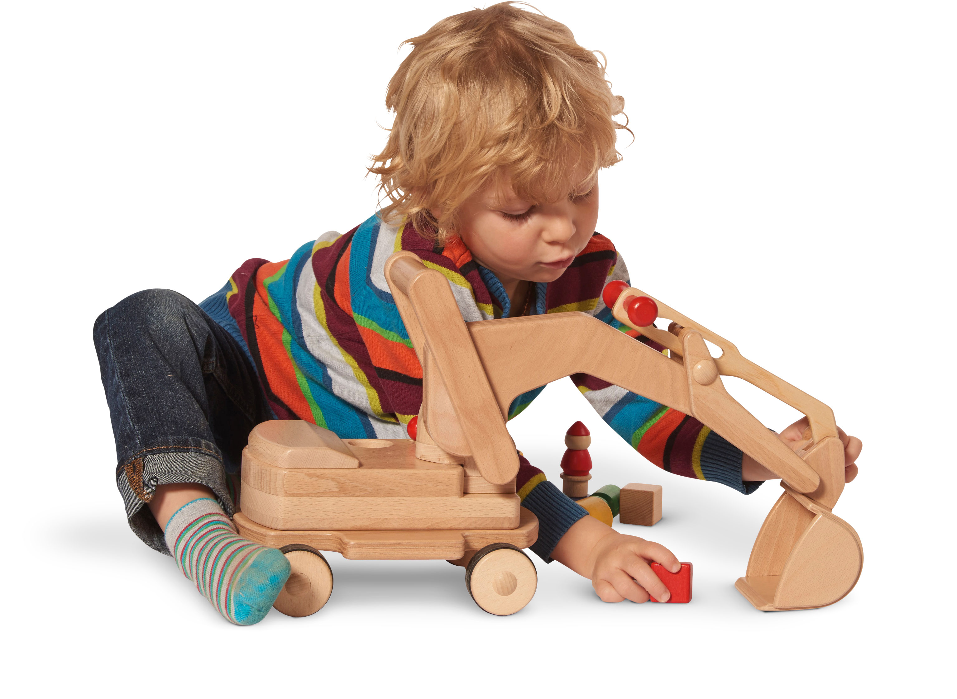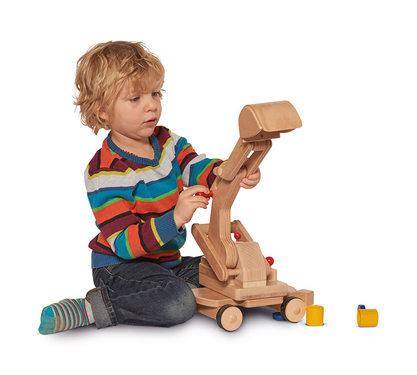Der große, massive und robuste Schaufelbagger mit vielen Funktionen und stabilem, seit vielen Jahren bewährtem Lenkgriff, ist ein echtes Lieblingsstück. Er lässt sich in seinen Klapp- und Dreh-Funktionen einfach bedienen. Gleichzeitig stecken für Kinder geeignete, spannende technische Details darin. Spielerisch kann so nach Lust und Laune ausprobiert und entdeckt werden. Zusammen mit den anderen Baustellen- und Nutzfahrzeugen kann um den ca. 2,5 kg schweren Schaufelbagger nach und nach eine ganze Baustellenwelt entstehen. Mit Hochkran, Radlader, Kipplaster, Förderband und vielen anderen großen und kleinen Helfern. Unser Schaufelbagger aus Buchen-Massivholz ist wie alle creamobil-Fahrzeuge mit großer Sorgfalt und Liebe zum Detail hergestellt worden. Das Holz ist fein abgeschliffen, die Ecken abgerundet. Die vier Räder des Baggers sind mit Stahlachsen solide und stabil befestigt. Wir begegnen hier einer zeitlosen Holzspielzeug-Welt, die Kindern einfach Freude bereitet. Die großen creamobil-Holzfahrzeuge kommen frei und kreativ im Spiel der Kinder zum Einsatz. Sie sind dank ihrer Stabilität und der steten Erweiterungsmöglichkeiten Begleiter durch viele bunte Kinderjahre. Mit der wunderbaren creamobil-Spielewelt von nic entdecken und erleben Kinder spielerisch nachahmend ihre Welt. Da wird gemeinsam tüchtig geschafft – auf der Baustelle mit allen notwendigen Nutzfahrzeugen wie Baggern, Förderbändern oder einem Hochkran und am Bauernhof mit Traktoren und diversen Anhängern. Verschiedene Aufsätze, Anhängertypen und Umbaumöglichkeiten machen aus den hochwertigen, stabilen creamobil-Fahrzeugen aus massivem Buchenholz echte Alleskönner und sind im Spiel der Kinder sehr vielfältig einsetzbar. So geht es mit dem umgerüsteten creamobil-Grundmodell zum Beispiel auch zum Campingurlaub, auf einen Familienausflug oder eine gemeinsame Busfahrt. Kinder erleben die Welt um sich herum mit großer Neugier und Offenheit. Durch das nachahmende Spiel tasten sich Kinder fühlend und erlebend in diese Welt hinein, verarbeiten Eindrücke und ordnen so gleichsam das Erlebte in ihrem Inneren. Gute, hochwertige Holzspielzeuge, die den Kindern im Spiel möglichst viel Gestaltungsspielraum und Freiheit lassen, fördern so diesen Prozess spielerischen Begreifens. Neben der hochwertigen Verarbeitung und der wertvollen Naturwerkstoffe ist es dieser pädagogische Sinn, der die nic Holzspielzeuge so besonders macht.