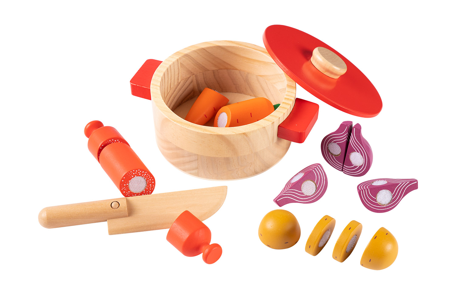 Mit Klett verbundene Lebensmittel aus Holz sind ein wunderbares Vergnügen für Kinder ab ca. 1,5 Jahren. In der Spielküche und im Kinder-Restaurant werden im Spiel mit den Schneide-Holzspielzeugen allerlei Köstlichkeiten zubereitet bzw. fachgerecht geschnitten. Eintopf ist ein ganz klassisches Gericht, das stärkt und wohlig an Großmutters Küche erinnert. Die einzelnen Zutaten – Zwiebel, Karotte, Kartoffel und Wurst – sind mit Klett verbunden und können so mühelos entzwei geschnitten und wieder miteinander verbunden werden. Dabei werden nicht nur die motorischen Fähigkeiten der Kinder spielerisch geschult, es darf auch der erste Umgang mit einem Messer ganz ohne Gefahr geübt werden. Und am Schluss wandern alle Zutaten in den Eintopf-Topf aus Holz und dürfen entweder in der Kinderküche auf dem Herd gegart werden – oder sofort den lieben und vor allem hungrigen Reastaurant-Gästen serviert werden. Die Oberflächen der einzelnen Holz-Elemente sind mit Farben auf Wasserbasis gestaltet und speichelecht.