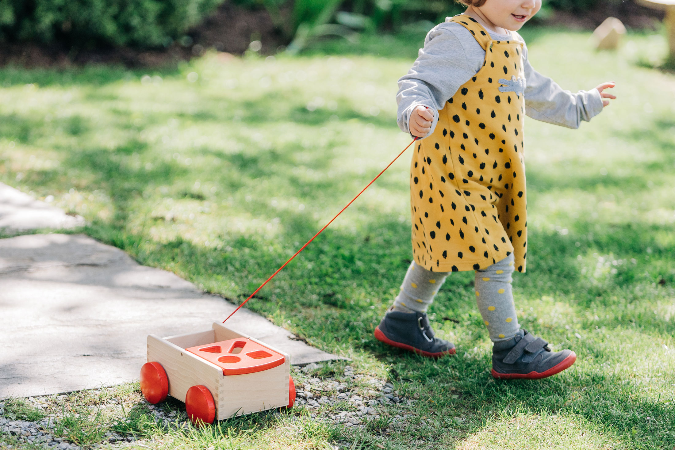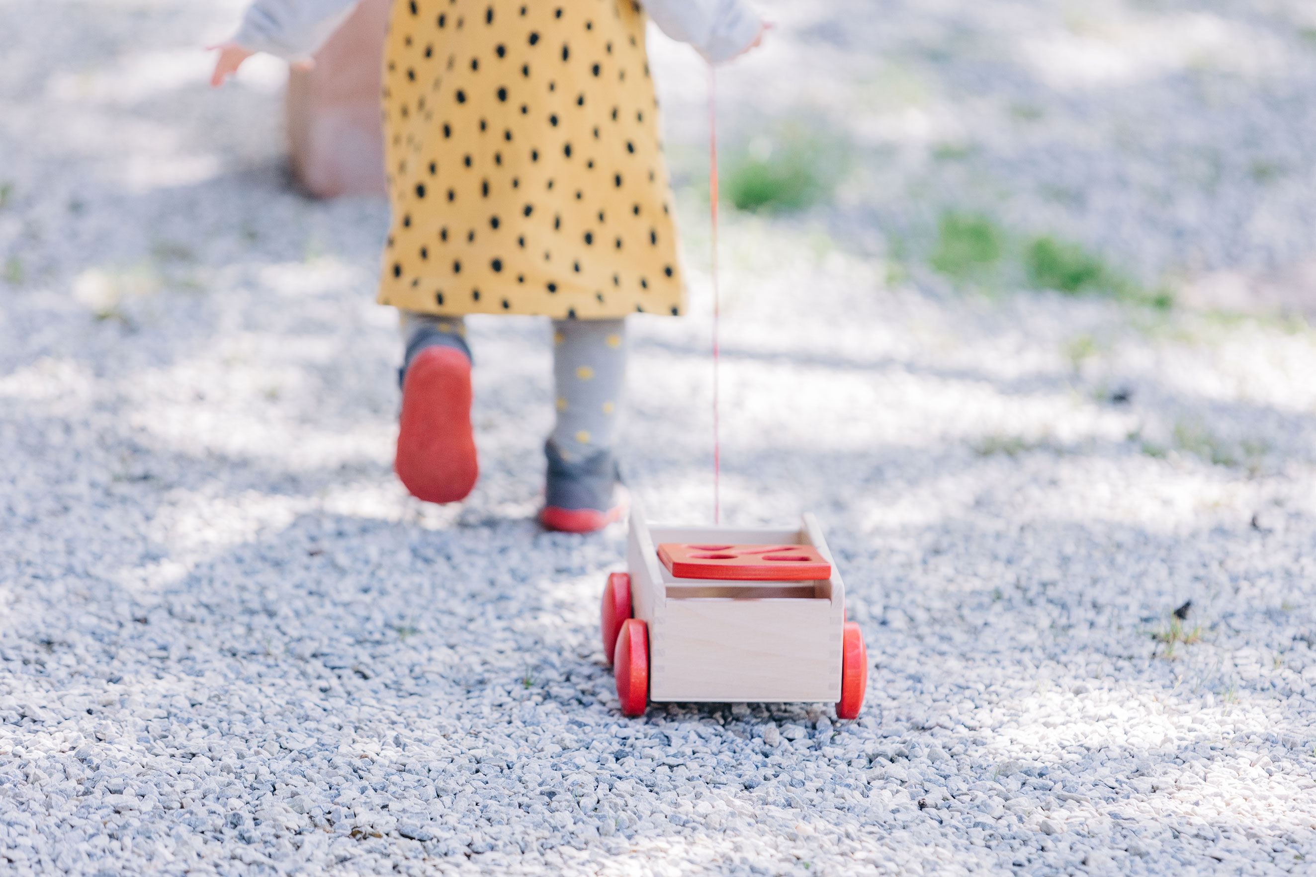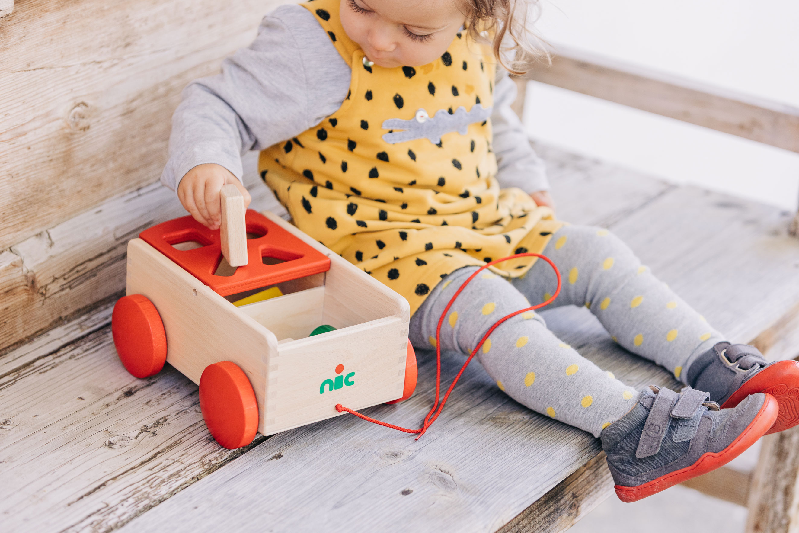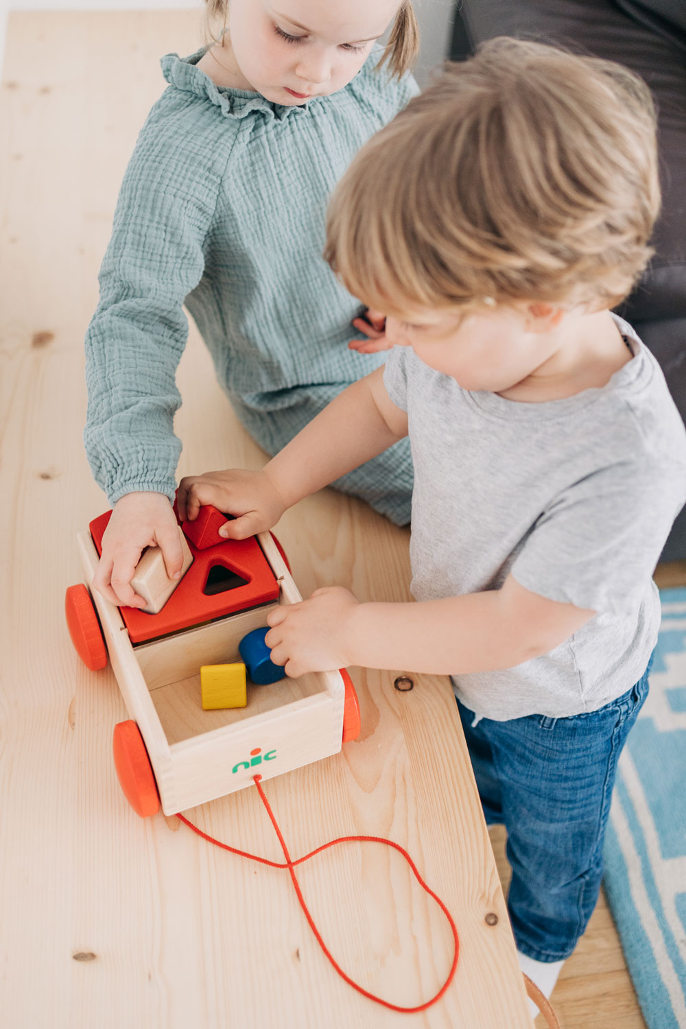 Eine Sortierbox der ganz besonderen Art: verschiedene Formen aus wertigem Buchenholz lassen sich von der einen Wagenseite zur anderen sortieren. In der Regel sind die Formen somit immer spielerisch aufgeräumt und selbst das Kuscheltier kann noch mitfahren. Unser hochwertiger, stabiler Holzspielzeug-Ziehwagen ist mit viel Liebe zum Detail und aus massivem Buchenholz gefertigt. Die Seiten sind fingergezinkt. Acht Formenklötzchen in Grundfarben sind beinhaltet. Holzspielzeug, das sich bewegen kann. Formen und Farben, die entdeckt, erkundet, zugeordnet werden. Alle Sinne des kleinen Kindes werden durch hochwertiges, pädagogisch wertvolles Holzspielzeug angeregt – und gleichzeitig ist es wunderbar, wenn der wertvolle Naturwerkstoff Holz als Erfahrung im Spiel der Kinder mitlebt. Beim Spielen ist der Formenwagen aus massivem Holz sehr vielfältig und kreativ einsetzbar und eignet sich für Babys ab etwa einem Jahr. Durch den zu beiden Seiten klappbaren Aufsatz können die Formenteile aus Holz immer wieder durch die Öffnungen im Deckel auf die andere Seite einsortiert werden. Spielerisch und sanft werden so motorische Fähigkeiten gefördert und die Wahrnehmung für passende Formen geübt. So dürfen die kleinen Kinder selber nach und nach entdecken, welche Formen sich in welche Öffnungen zuordnen und einsortieren lassen. Das Gefühl, es selber ganz alleine und ohne Hilfe geschafft zu haben, ist ein an Glück, Staunen und Freude kaum zu übertreffendes. Außerdem dient der massive Holzwagen mit der kleinen Nachzieh-Schnur auch zuverlässig dem Transport von Bausteinen, kleinen Kuscheltieren oder Püppchen.