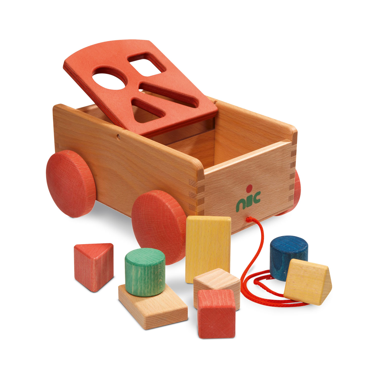 Holzspielzeug, das sich bewegen kann. Formen und Farben, die entdeckt, erkundet, zugeordnet werden. Alle Sinne des kleinen Kindes werden durch hochwertiges, pädagogisch wertvolles Holzspielzeug angeregt – und gleichzeitig ist es wunderbar, wenn der wertvolle Naturwerkstoff Holz als Erfahrung im Spiel der Kinder mitlebt. Beim Spielen ist der Formenwagen aus massivem Holz sehr vielfältig und kreativ einsetzbar und eignet sich für Babys ab etwa einem Jahr. Durch den zu beiden Seiten klappbaren Aufsatz können die Formenteile aus Holz immer wieder durch die Öffnungen im Deckel auf die andere Seite einsortiert werden. Spielerisch und sanft werden so motorische Fähigkeiten gefördert und die Wahrnehmung für passende Formen geübt. So dürfen die kleinen Kinder selber nach und nach entdecken, welche Formen sich in welche Öffnungen zuordnen und einsortieren lassen. Das Gefühl, es selber ganz alleine und ohne Hilfe geschafft zu haben, ist ein an Glück, Staunen und Freude kaum zu übertreffendes. Außerdem dient der massive Holzwagen mit der kleinen Nachzieh-Schnur auch zuverlässig dem Transport von Bausteinen, kleinen Kuscheltieren oder Püppchen. Der wunderschöne, hochwertige Formenwagen aus dem nicBio-Sortiment ist nur mit Naturölen (Leinöl und Ricinenöl) und Pflanzen- sowie Naturfarben auf Naturölbasis behandelt. So kommen etwa Pigmente aus der Zitronenschale im Gelbton zum Einsatz. Der Wagen ist komplett unlackiert. Die Farben sind zart und pastellig und die Haptik ist sehr authentisch und unmittelbar.