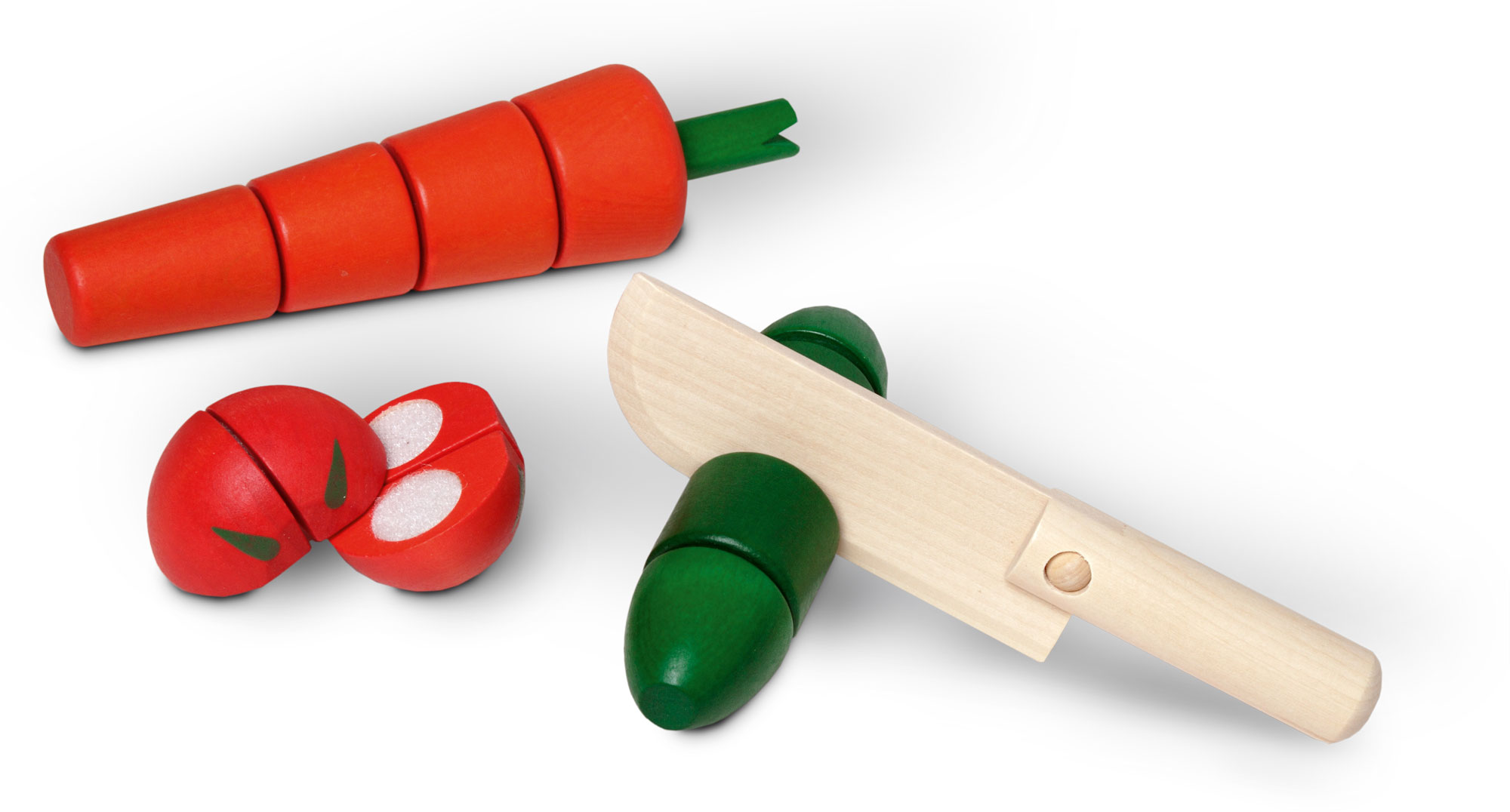 Mit Klett verbundene Lebensmittel aus Holz sind ein wunderbares Vergnügen für Kinder im Alter zwischen 1,5 und 3 Jahren. In der Spielküche und im Kinder-Restaurant werden im Spiel mit den Schneide-Holzspielzeugen allerlei Köstlichkeiten zubereitet bzw. fachgerecht geschnitten. Gemüse als frische Rohkost oder aber als leckeres Gericht mit Liebe zubereitet bedarf vor dem Verzehr immer eines fachgerechten Schnitts. Die einzelnen Teile der Karotte, Gurke und Tomate aus Holz sind mit Klett miteinander verbunden und können so mühelos entzwei geschnitten und wieder zusammen geklettet werden. Im Spiel mit dem Schneide-Spielzeug werden nicht nur die motorischen Fähigkeiten der Kinder sanft geschult, es darf auch der erste Umgang mit einem Messer ganz ohne Gefahr geübt werden. Die Oberflächen der einzelnen Holz-Elemente sind mit Farben auf Wasserbasis gestaltet und speichelecht.