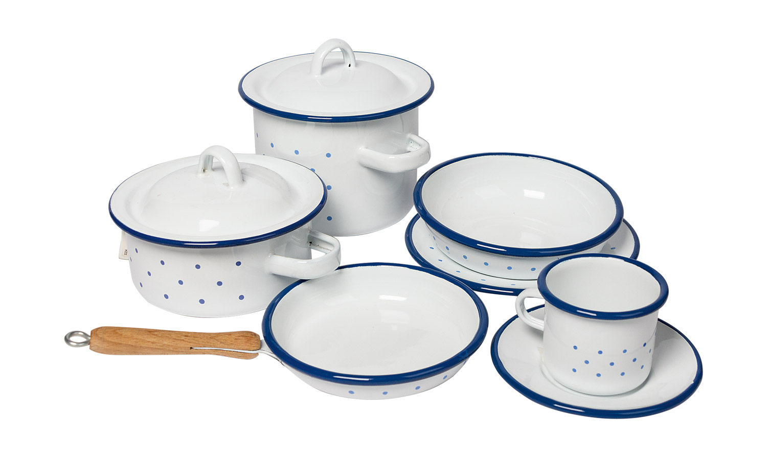 So macht Kochen Spaß! Hübsches, kindgerechtes Geschirr für kleine Puppenmütter und -väter, ansprechendes Dekor. Weißes Email mit blauen Punkten. Hinweis: Bitte beachten Sie, dass Emailgeschirr mit der Zeit aufplatzen kann.