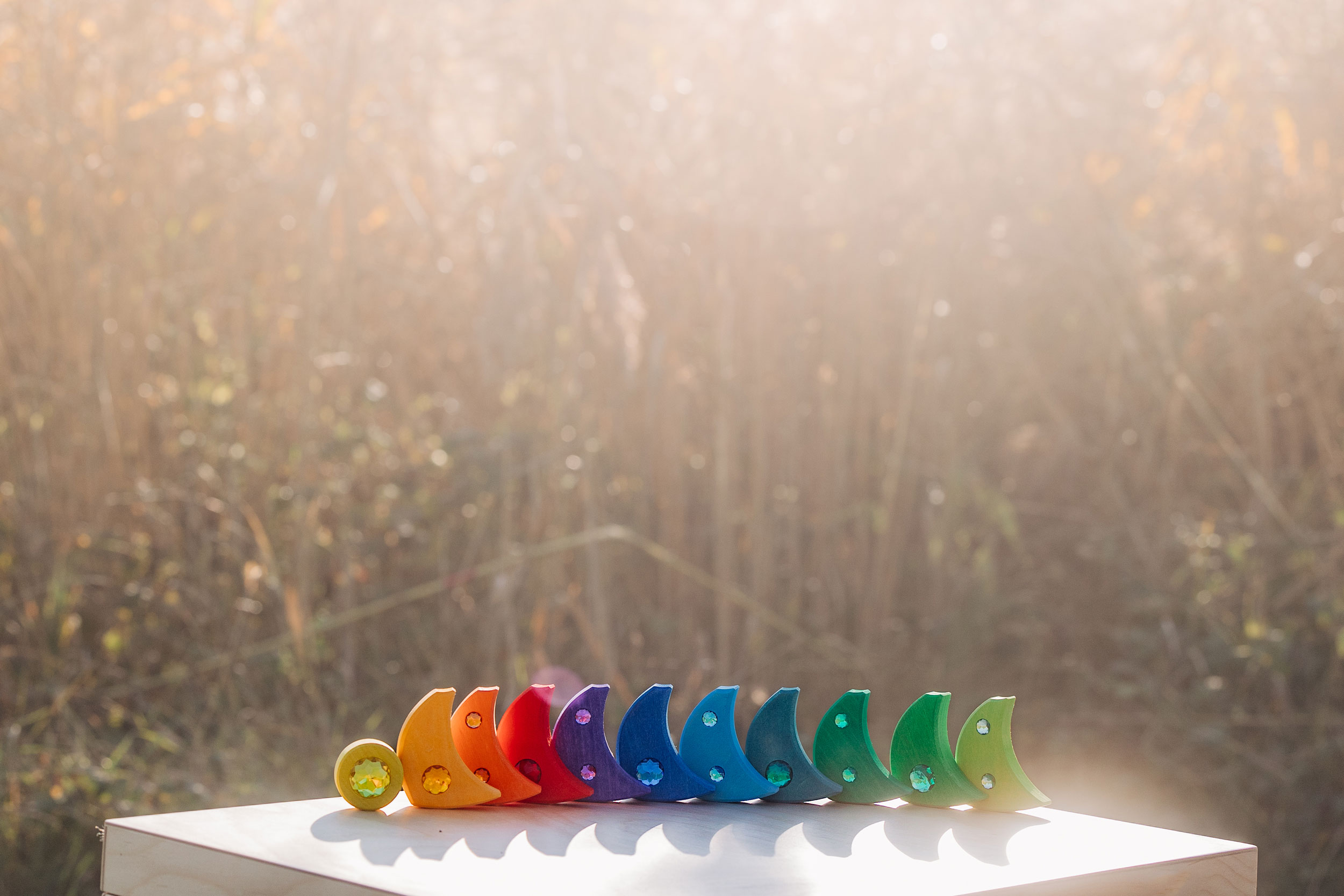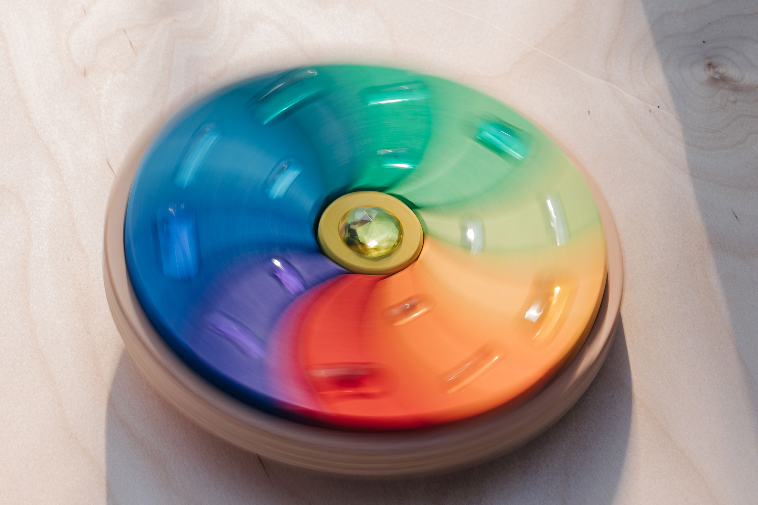 Dieser große, wunderschön gearbeitete Holzkreisel ist ein echter Schatz. Komplett aus Lindenholz und mit liebevoller Sorgfalt hergestellt, besteht er insgesamt aus 12 einzelnen Teilen. Die 11 regenbogenfarbenen Holzteile mit den herrlich glitzernden Acrylsteinen erzeugen beim Drehen des Kreisels ein wunderschönes Farbenspiel. Dieses wird bei direktem Sonnenlicht noch eindrucksvoll verstärkt. Wie ein kleines, erstes Holzpuzzle lassen sich die 12 Holzbauteile aus der kreiselrunden Holzschale herausnehmen und wieder einsetzen. So ist das wunderschöne, pädagogisch wertvolle Holzspielzeug-Kleinod vielseitig, freilassend und kreativ im Spiel unserer Kinder. Als Geschenk eignet es sich wunderbar für Kleinkinder ab ca. eineinhalb Jahren. Kreisel sind aus einer Kindheit eigentlich kaum wegzudenken und faszinieren kleine und große Kinder in ihren verschiedenen Ausprägungen und Formen seit jeher. Da gibt es zum Beispiel Kreisel, die sich umdrehen können. Kreisel, die wunderschöne optische Muster in der Drehbewegung hervorrufen. Schwierig in Drehung zu versetzende und ganz leicht zu drehende Kreisel. Unterschiedlich große Kreisel vom winzigen Zwergenkreisel bis hin zum riesengroßen Riesenkreisel. Und dann ganz spannende Kreisel wie den Peitschenkreisel, der spielerisch mittels einer Peitsche angetrieben wird. Ach, und dann gibt es da noch viele andere mehr. Die Geschicklichkeit und Kunstfertigkeit im Umgang mit dem Kreisel ist eine Frage der Übung und der Konzentration. Bereits Kleinkinder können ihre motorischen Fähigkeiten im Spiel mit großen, griffigen Holzkreiseln üben. Und es ist eine große Freude, wenn sich der Kreisel nach einiger Zeit durch das Geschick der eigenen Hände in eine drehende Bewegung versetzt.