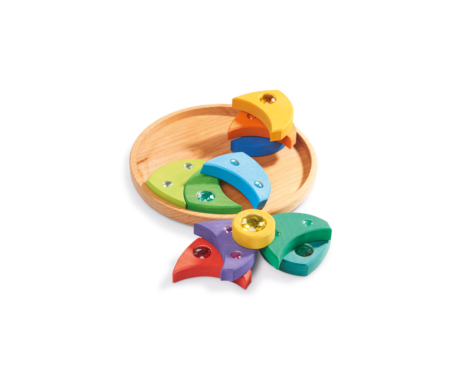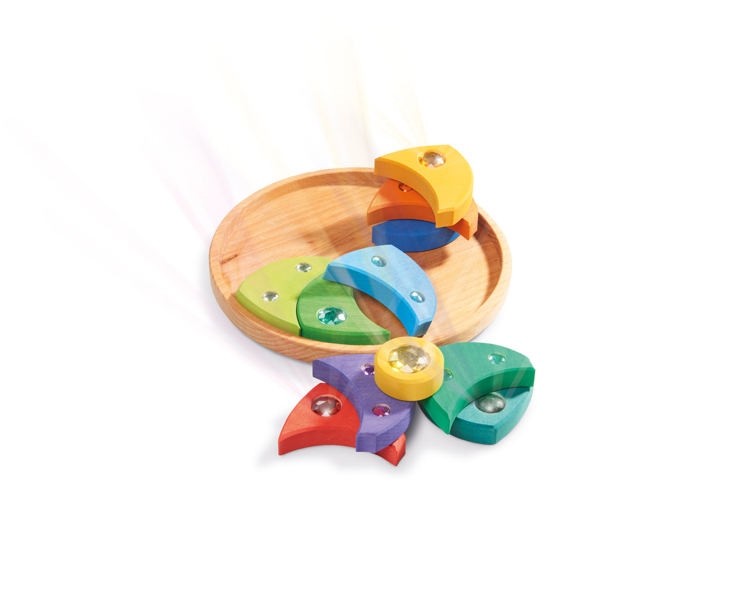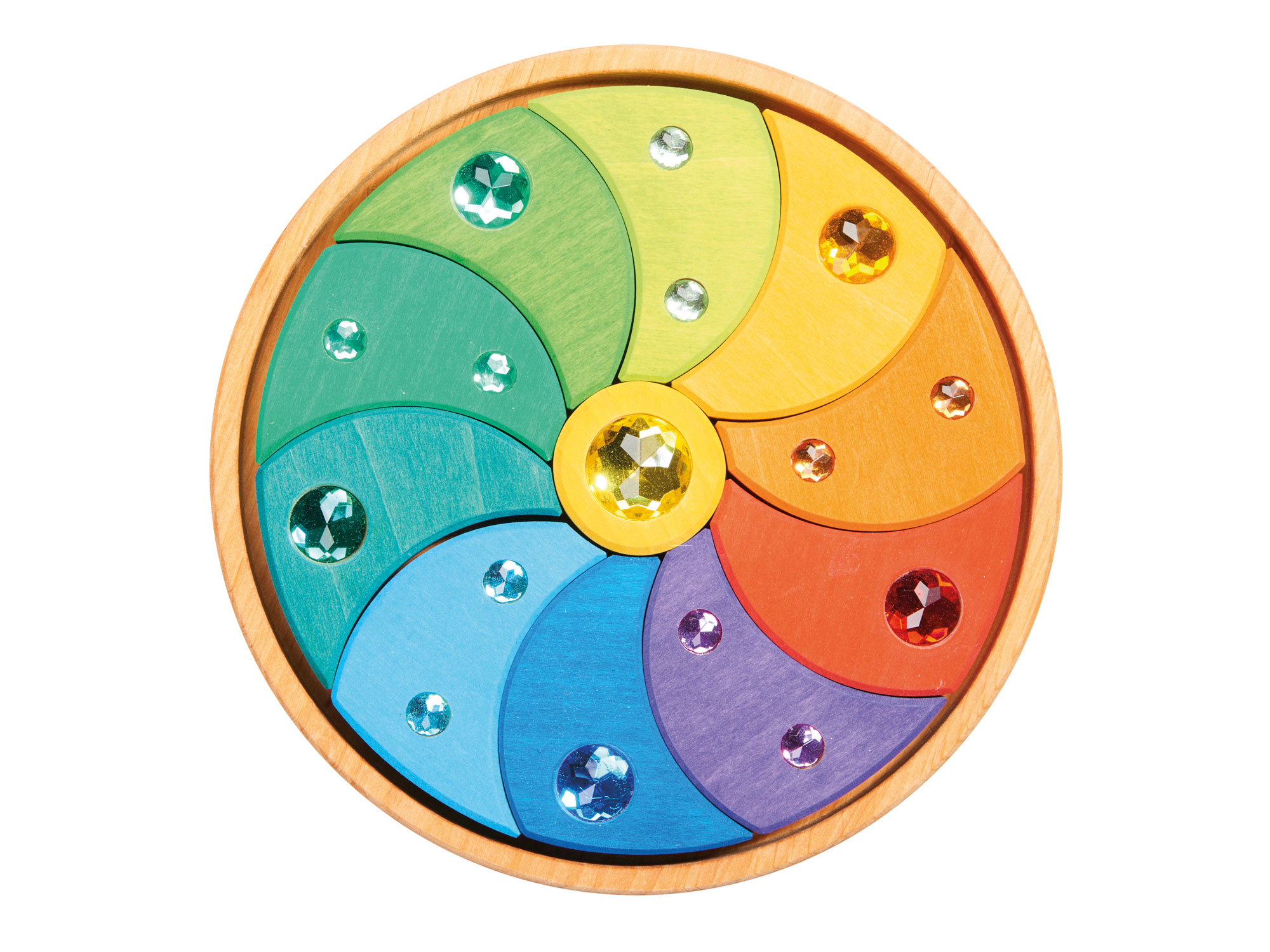 | Inhalt: | 1 Kreisel, (mit 11 herausnehmbaren Holzteilen und glitzernden Acrylsteinen) |