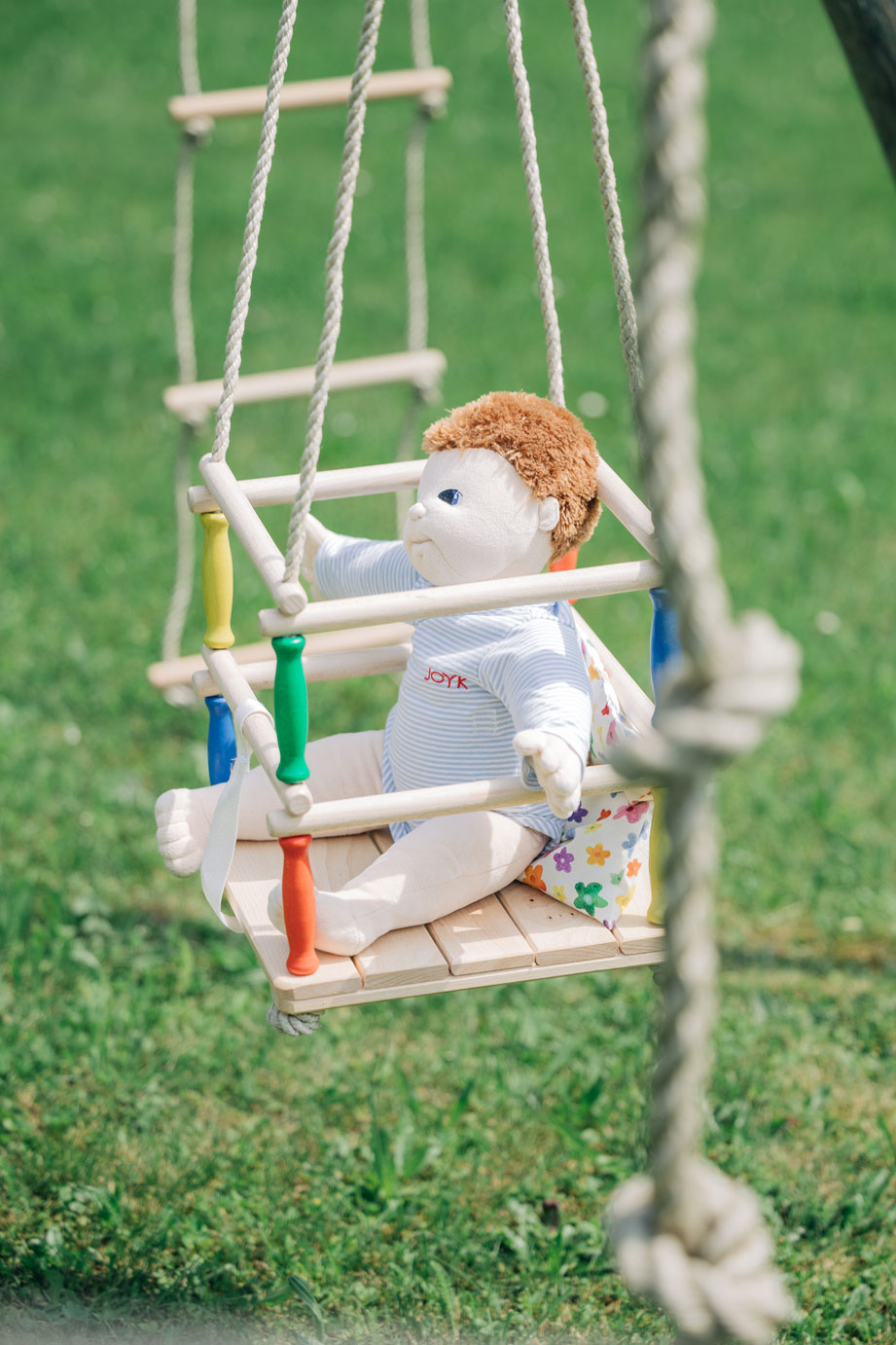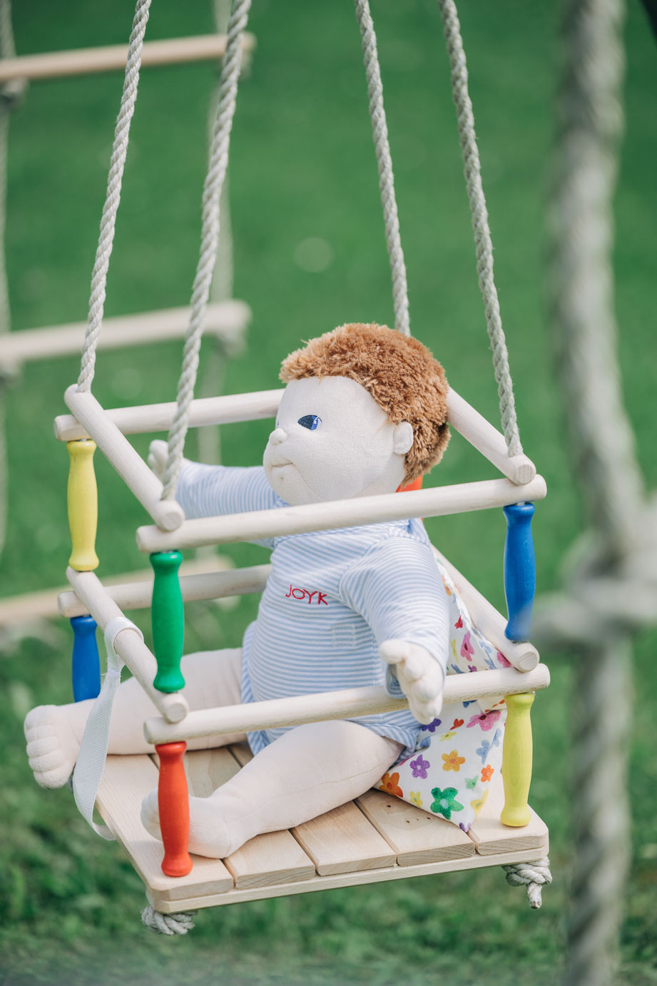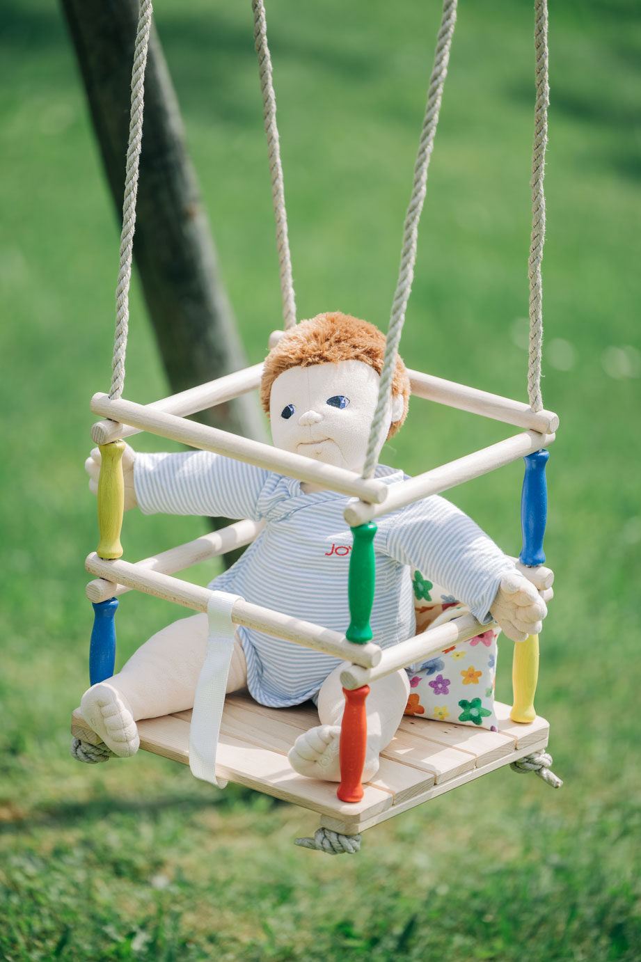 Schaukeln schenkt ein freudiges, leichtes und herrlich rhythmisches Gefühl von Freiheit. Wer sich noch daran erinnert, mit welcher Ausdauer und Fröhlichkeit man selber als Kind überall dort geschaukelt hat, wo sich die Gelegenheit dazu bot, der erinnert sich vielleicht noch an diesen wunderschönen Zustand. Da weht einem der Wind durch die Haare, man fliegt gleichsam dem Himmel entgegen, immer höher und höher ins Blaue hinein, mit frischem Schwung – und dabei entlocken sich dem Herzen ganz spontan die schönsten Kinderlieder. Bereits unsere Allerkleinsten lieben das rhythmische Schaukeln, von den Eltern in Schwung versetzt und von glucksendem Lachen begleitet. Wer eine eigene Kleinkindschaukel im Innenraum oder Draußen anbringen möchte und dabei auf eine solide, robuste und sichere Qualität achtet, der wird mit diesem vom TÜV auf Sicherheit geprüften und in Deutschland hergestellten Modell eine sehr gute Wahl treffen. Die Kinderschaukel ist aus massivem Buchenholz hergestellt und hat rundherum – etwa bis Brusthöhe – Querstreben sowie einen Sicherheitsgurt zwischen den Beinen, die ein Herausfallen verhindern. Durch das Tauchen der Holzteile in hochwertigem Öl und die sehr robusten, haltbaren und dadurch nachhaltigen Seile aus Polypropylen ist die Schaukel witterungsbeständig und auch für den Außenbereich einsetzbar. Wir empfehlen aber, die Schaukel abzunehmen, wenn die Witterung anhaltend zu feucht wird und dann an einem trockenen Ort zu lagern. Die Kleinkindschaukel ist bis maximal 25 kg belastbar und hat eine Sitzfläche von ca. 30 x 30 cm.