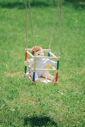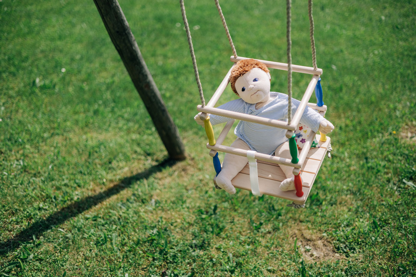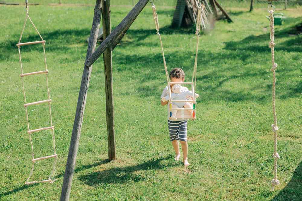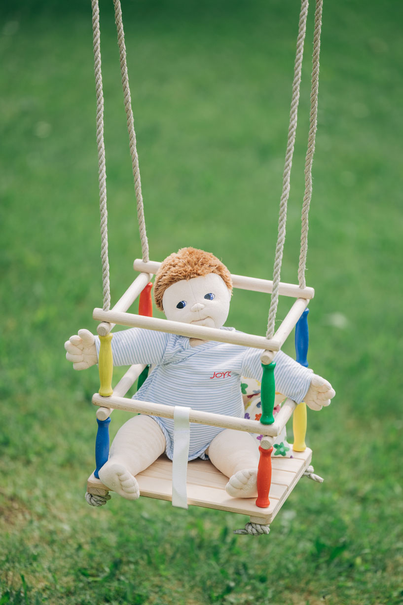 Schaukeln schenkt ein freudiges, leichtes und herrlich rhythmisches Gefühl von Freiheit. Wer sich noch daran erinnert, mit welcher Ausdauer und Fröhlichkeit man selber als Kind überall dort geschaukelt hat, wo sich die Gelegenheit dazu bot, der erinnert sich vielleicht noch an diesen wunderschönen Zustand. Da weht einem der Wind durch die Haare, man fliegt gleichsam dem Himmel entgegen, immer höher und höher ins Blaue hinein, mit frischem Schwung – und dabei entlocken sich dem Herzen ganz spontan die schönsten Kinderlieder. Bereits unsere Allerkleinsten lieben das rhythmische Schaukeln, von den Eltern in Schwung versetzt und von glucksendem Lachen begleitet. Wer eine eigene Kleinkindschaukel im Innenraum oder Draußen anbringen möchte und dabei auf eine solide, robuste und sichere Qualität achtet, der wird mit diesem vom TÜV auf Sicherheit geprüften und in Deutschland hergestellten Modell eine sehr gute Wahl treffen. Die Kinderschaukel ist aus massivem Buchenholz hergestellt und hat rundherum – etwa bis Brusthöhe – Querstreben sowie einen Sicherheitsgurt zwischen den Beinen, die ein Herausfallen verhindern. Durch das Tauchen der Holzteile in hochwertigem Öl und die sehr robusten, haltbaren und dadurch nachhaltigen Seile aus Polypropylen ist die Schaukel witterungsbeständig und auch für den Außenbereich einsetzbar. Wir empfehlen aber, die Schaukel abzunehmen, wenn die Witterung anhaltend zu feucht wird und dann an einem trockenen Ort zu lagern. Die Kleinkindschaukel ist bis maximal 25 kg belastbar und hat eine Sitzfläche von ca. 30 x 30 cm.