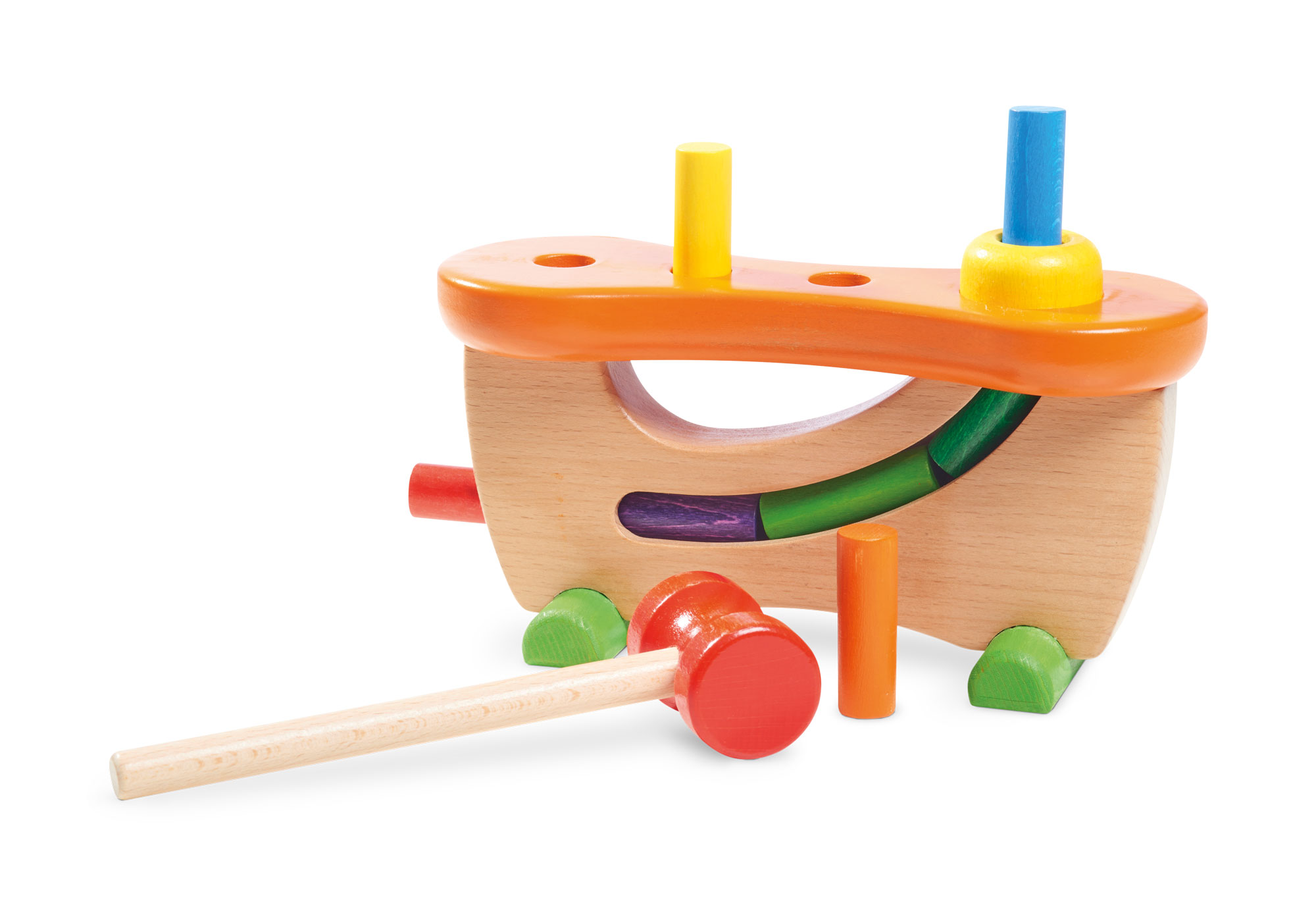 | Inhalt: | 1 Grundgerüst, 7 bunte Rundhölzer (4,5 cm lang), 1 Hammer (17 cm lang) |