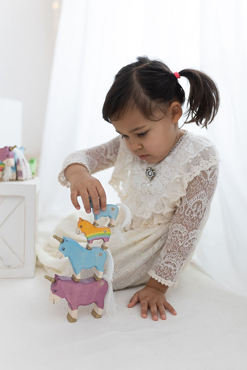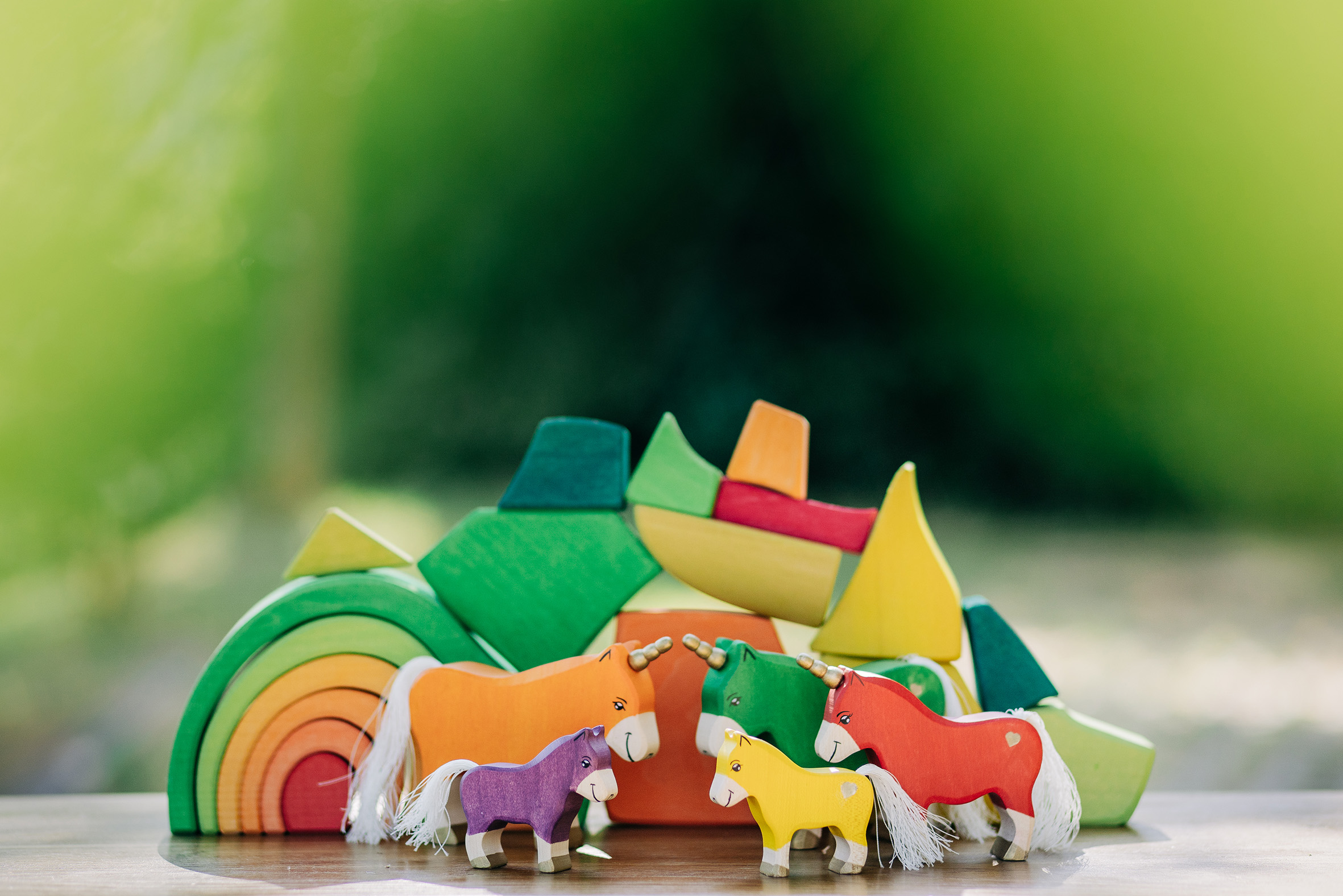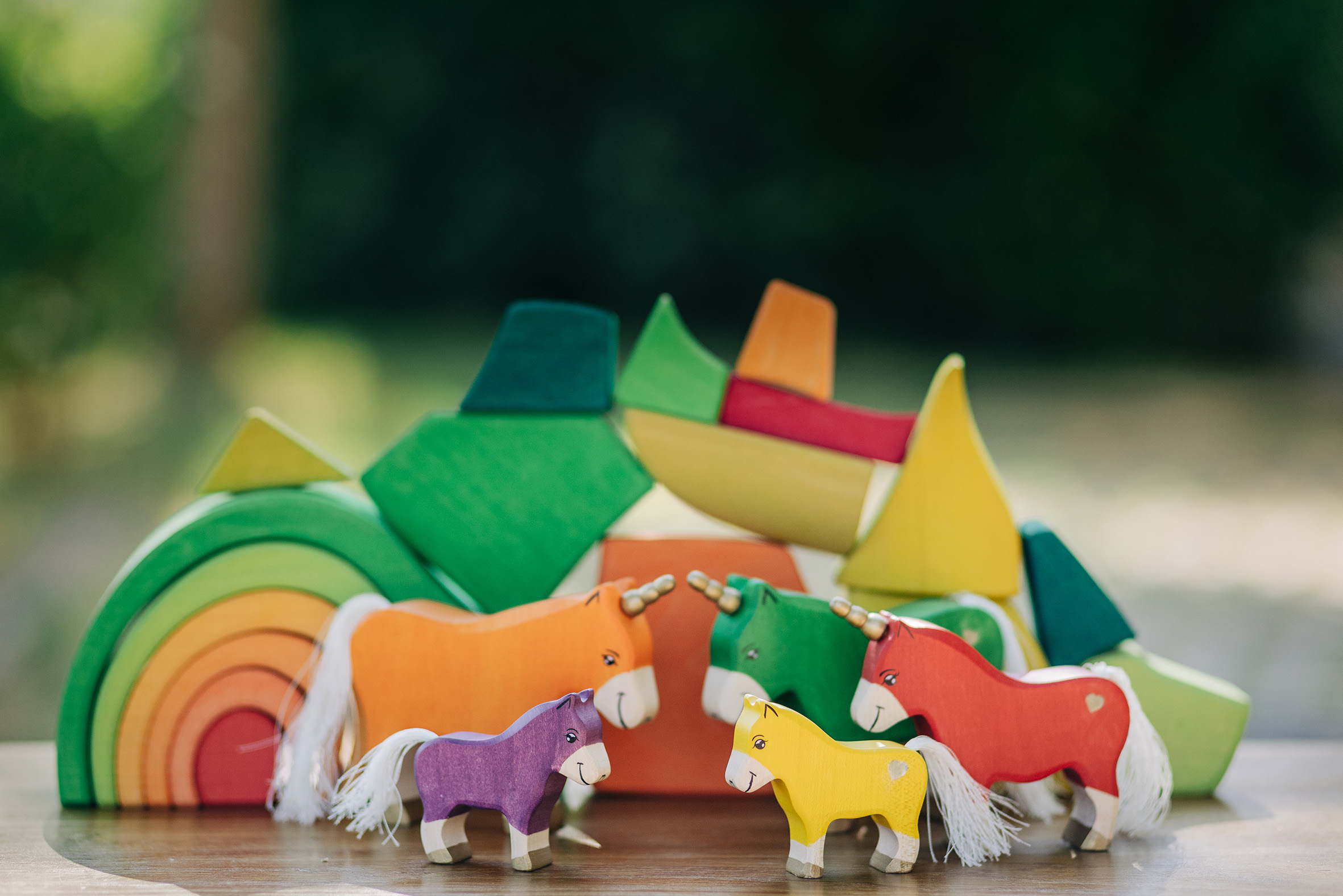Willkommen in einer Welt voller Farben, Magie und unendlicher Fantasie! Unsere liebevoll handgefertigten Einhörner aus Holz laden Kinder dazu ein, in eine bunte Traumwelt einzutauchen, funkelnde Edelsteine und geheimnisvolle Abenteuer auf sie warten. Das stolze blaue Einhorn bewacht den Regenbogenpalast, während das goldene Einhorn neugierig durch die farbenfrohe Landschaft galoppiert. Und das zarte rosafarbene Einhorn bringt mit seiner Sanftheit eine Prise Zauber und Freundlichkeit in jede Geschichte. Begleitet werden die Fabelwesen von leuchtenden Holzbausteinen, die wie funkelnde Regenbogenkristalle wirken. Ob Türme, Regenbogenbrücken oder magische Höhlen – die bunten Elemente lassen sich immer wieder neu kombinieren und eröffnen unendliche Spielmöglichkeiten. Lass die Magie einziehen – entdecke jetzt unsere zauberhafte Einhorn-Welt!