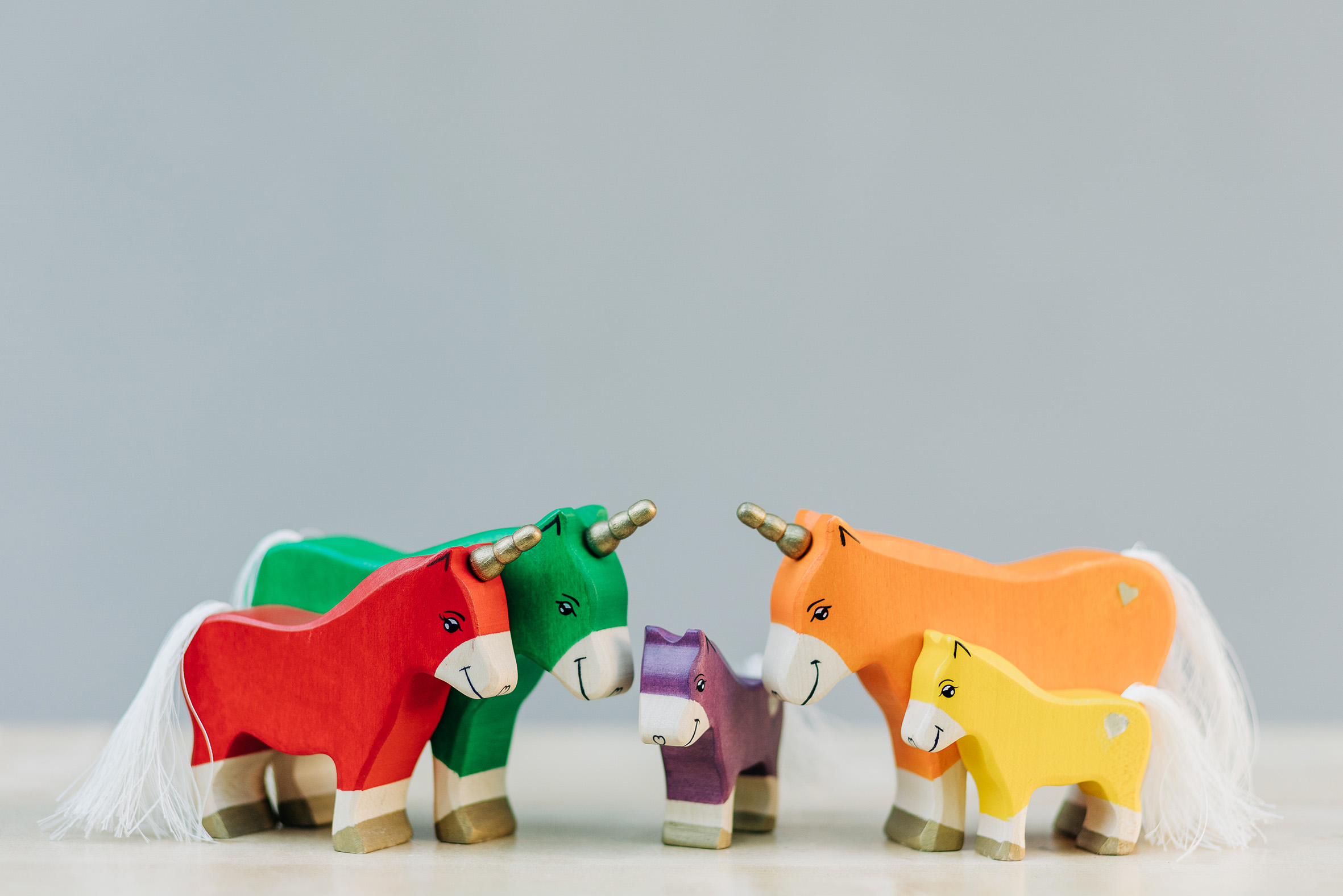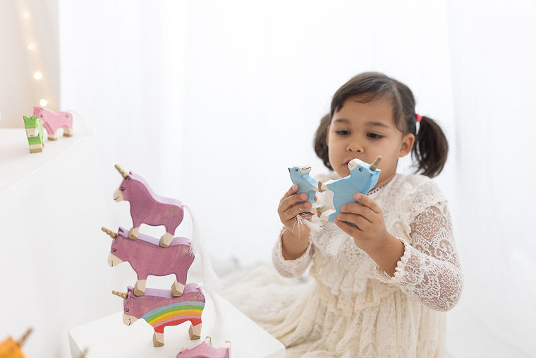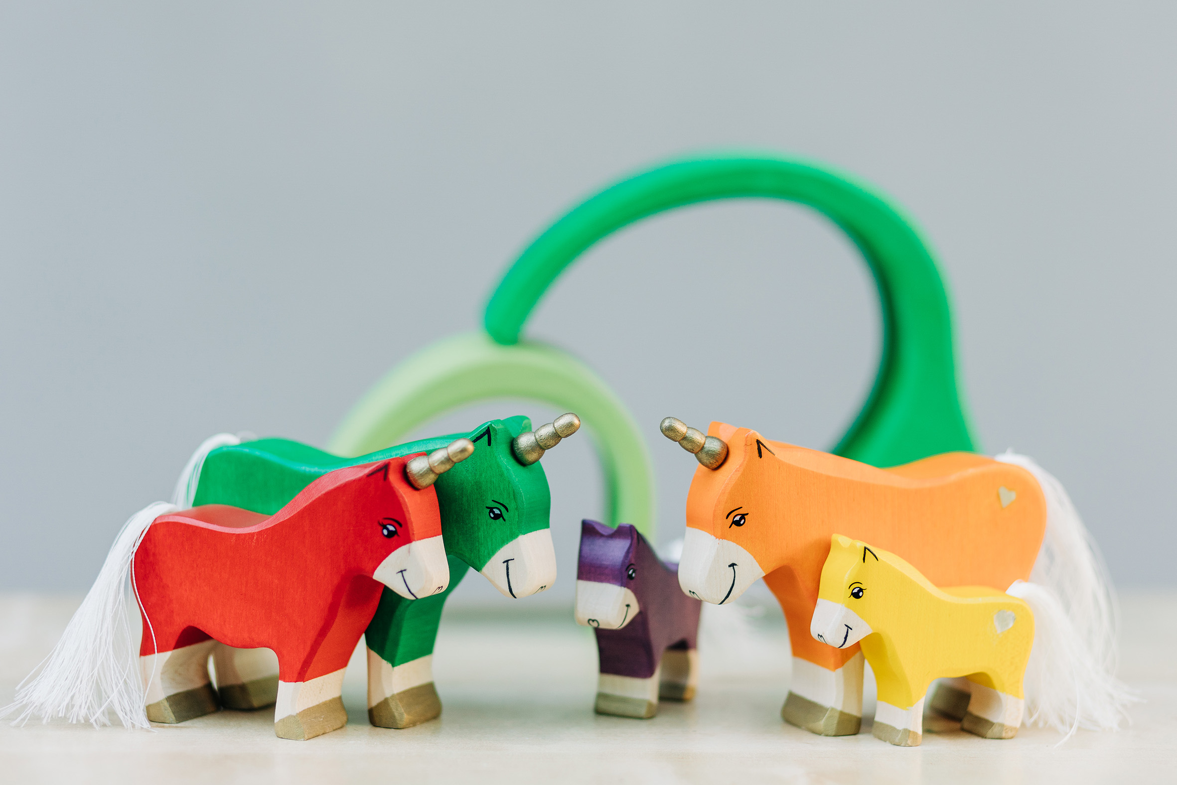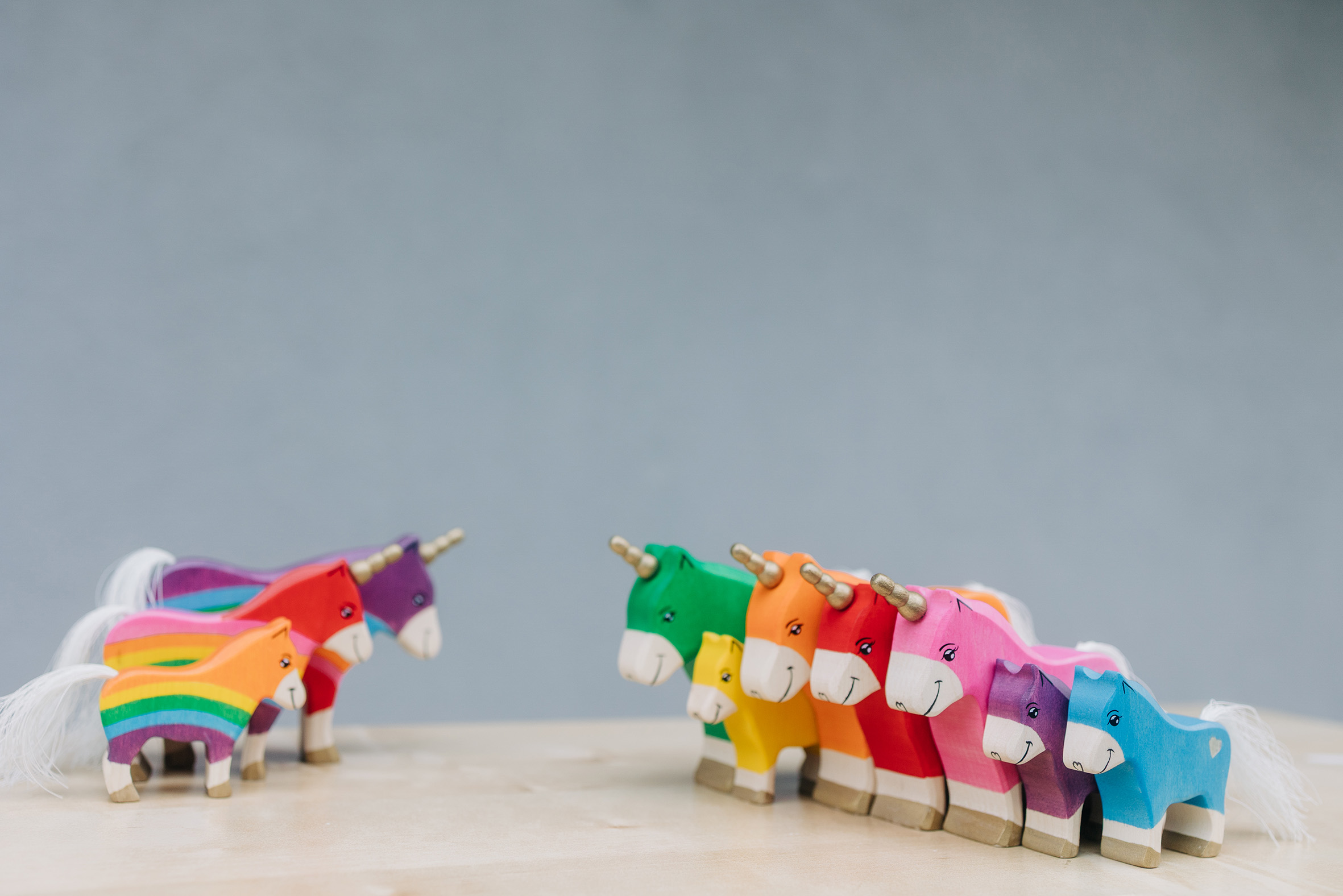 Willkommen in einer Welt voller Farben, Magie und unendlicher Fantasie! Unsere liebevoll handgefertigten Einhörner aus Holz laden Kinder dazu ein, in eine bunte Traumwelt einzutauchen, funkelnde Edelsteine und geheimnisvolle Abenteuer auf sie warten. Das stolze blaue Einhorn bewacht den Regenbogenpalast, während das goldene Einhorn neugierig durch die farbenfrohe Landschaft galoppiert. Und das zarte rosafarbene Einhorn bringt mit seiner Sanftheit eine Prise Zauber und Freundlichkeit in jede Geschichte. Begleitet werden die Fabelwesen von leuchtenden Holzbausteinen, die wie funkelnde Regenbogenkristalle wirken. Ob Türme, Regenbogenbrücken oder magische Höhlen – die bunten Elemente lassen sich immer wieder neu kombinieren und eröffnen unendliche Spielmöglichkeiten. Lass die Magie einziehen – entdecke jetzt unsere zauberhafte Einhorn-Welt!