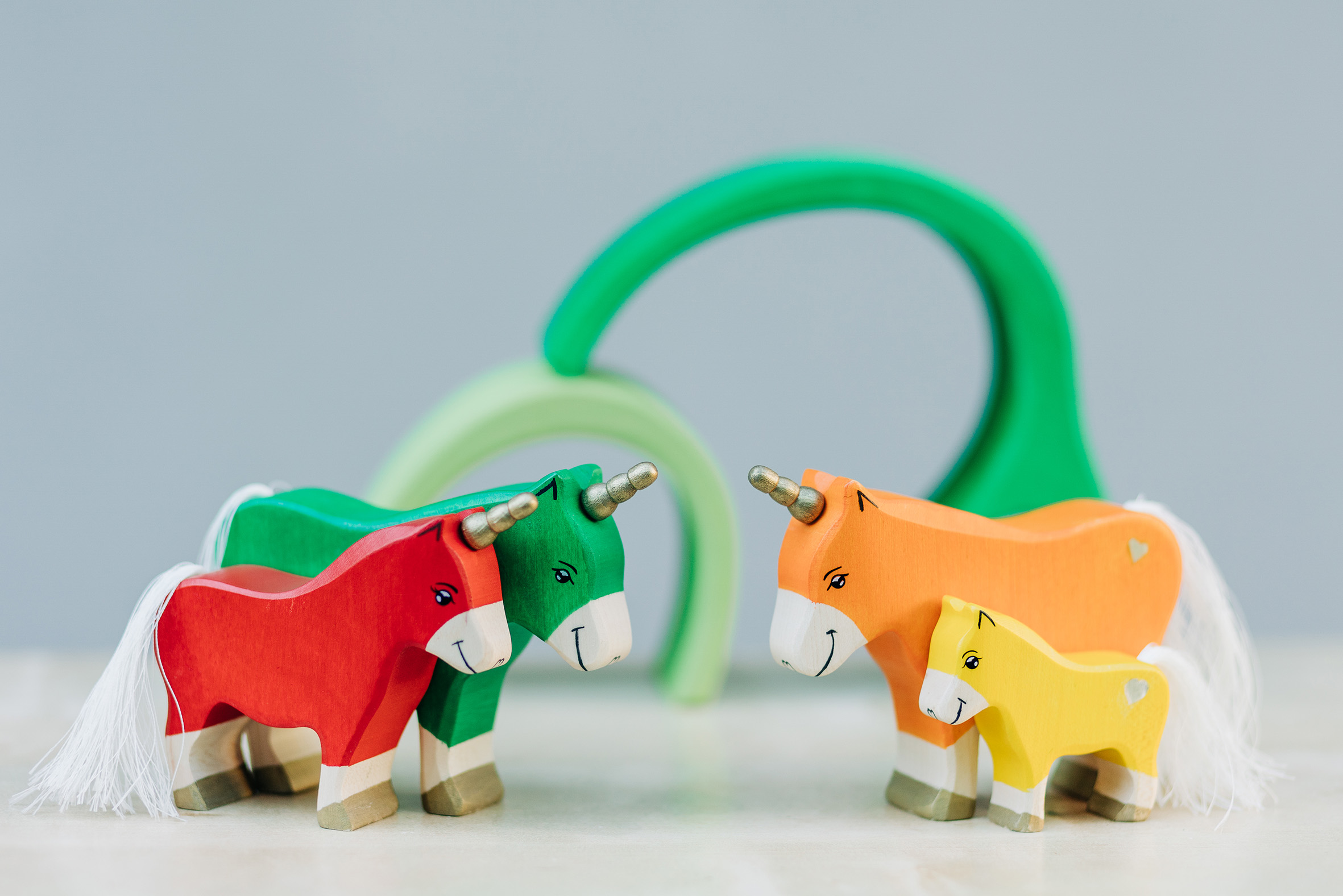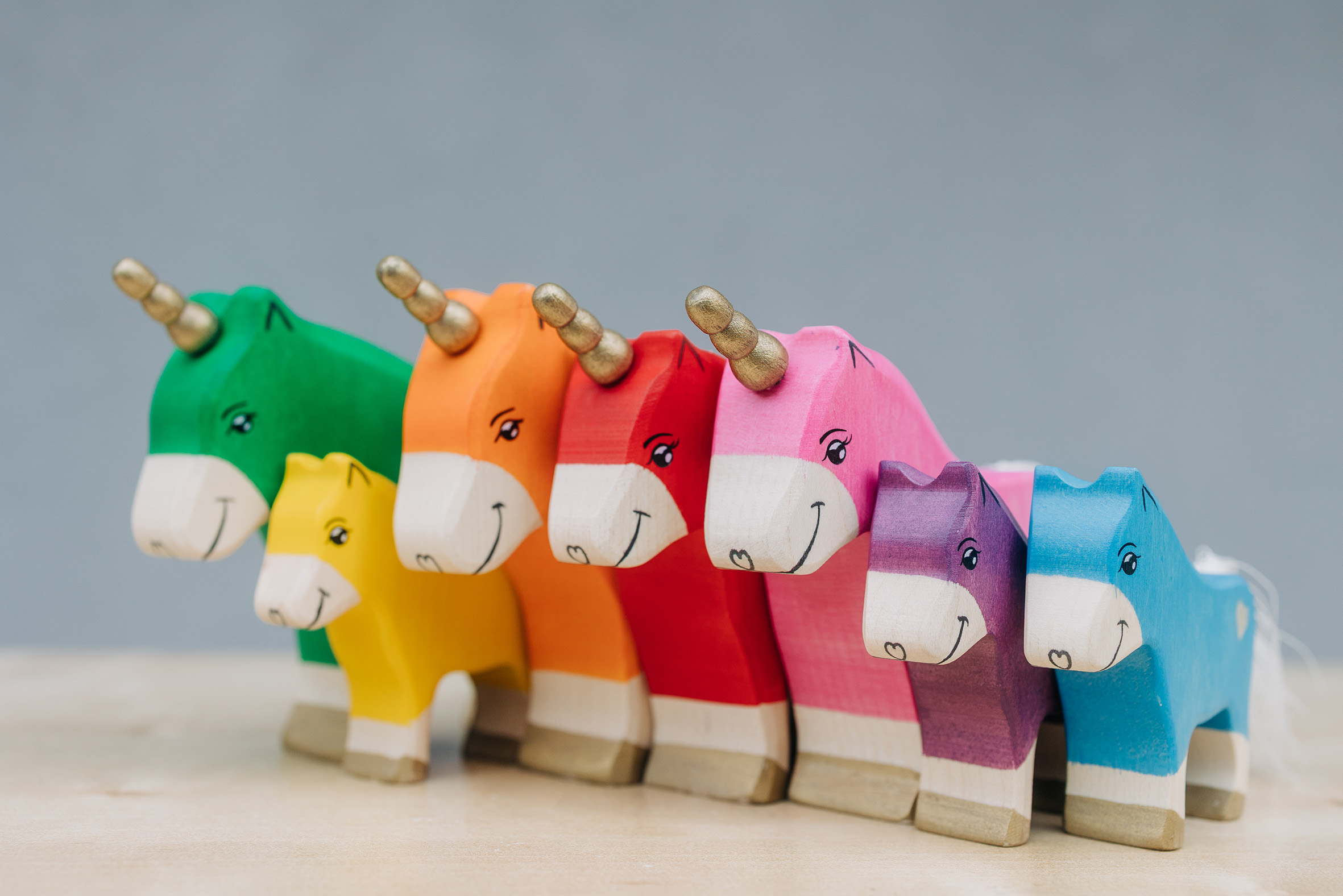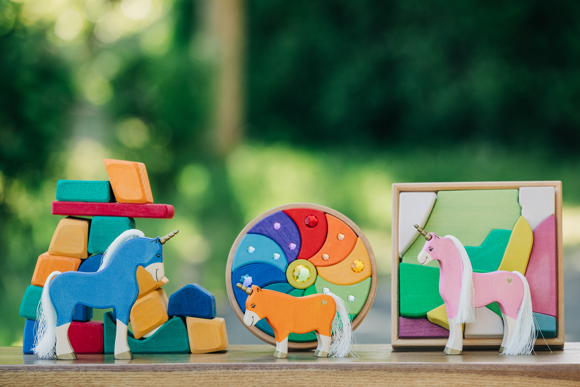 Willkommen in einer Welt voller Farben, Magie und unendlicher Fantasie! Unsere liebevoll handgefertigten Einhörner aus Holz laden Kinder dazu ein, in eine bunte Traumwelt einzutauchen, funkelnde Edelsteine und geheimnisvolle Abenteuer auf sie warten. Das stolze blaue Einhorn bewacht den Regenbogenpalast, während das goldene Einhorn neugierig durch die farbenfrohe Landschaft galoppiert. Und das zarte rosafarbene Einhorn bringt mit seiner Sanftheit eine Prise Zauber und Freundlichkeit in jede Geschichte. Begleitet werden die Fabelwesen von leuchtenden Holzbausteinen, die wie funkelnde Regenbogenkristalle wirken. Ob Türme, Regenbogenbrücken oder magische Höhlen – die bunten Elemente lassen sich immer wieder neu kombinieren und eröffnen unendliche Spielmöglichkeiten. Lass die Magie einziehen – entdecke jetzt unsere zauberhafte Einhorn-Welt!