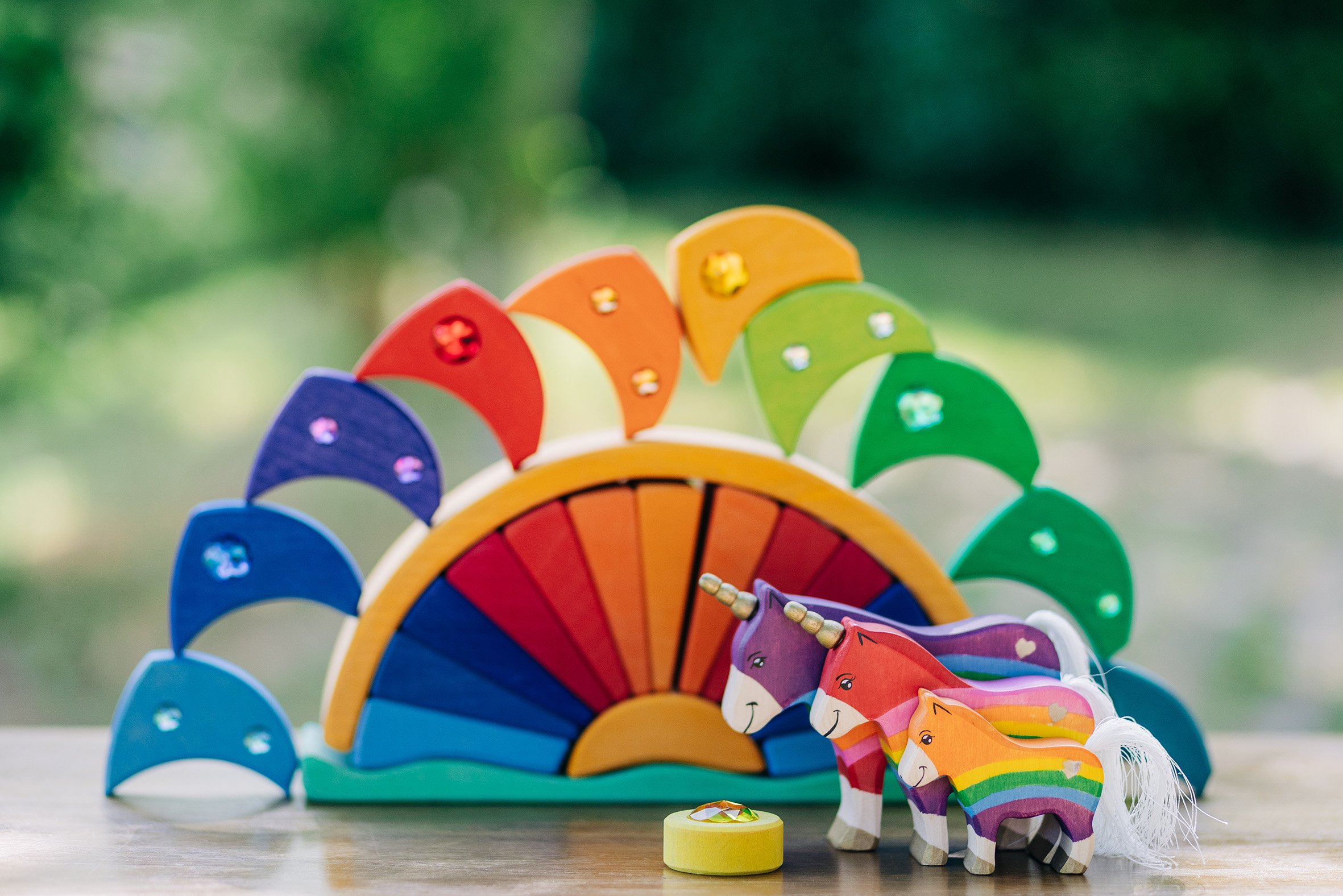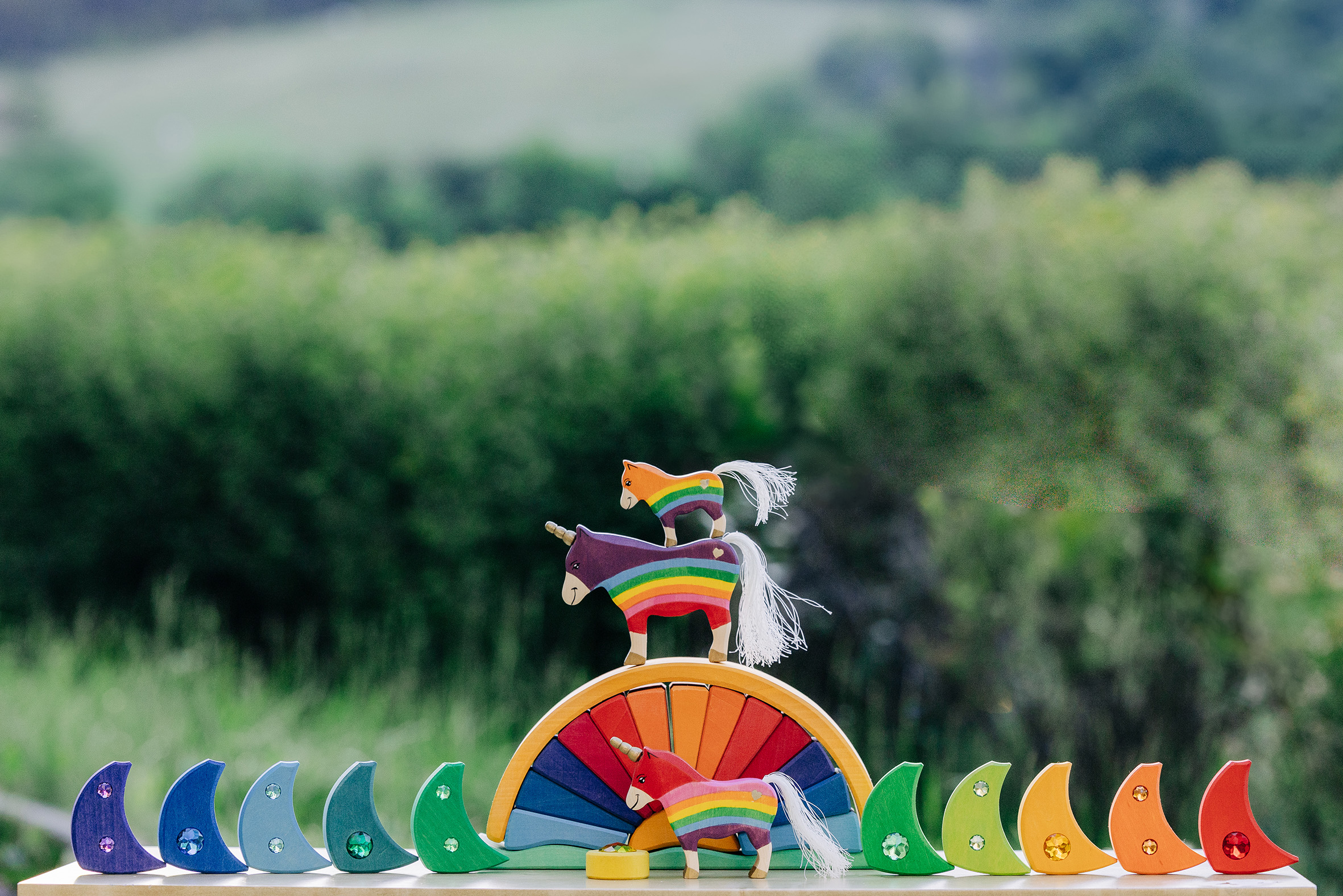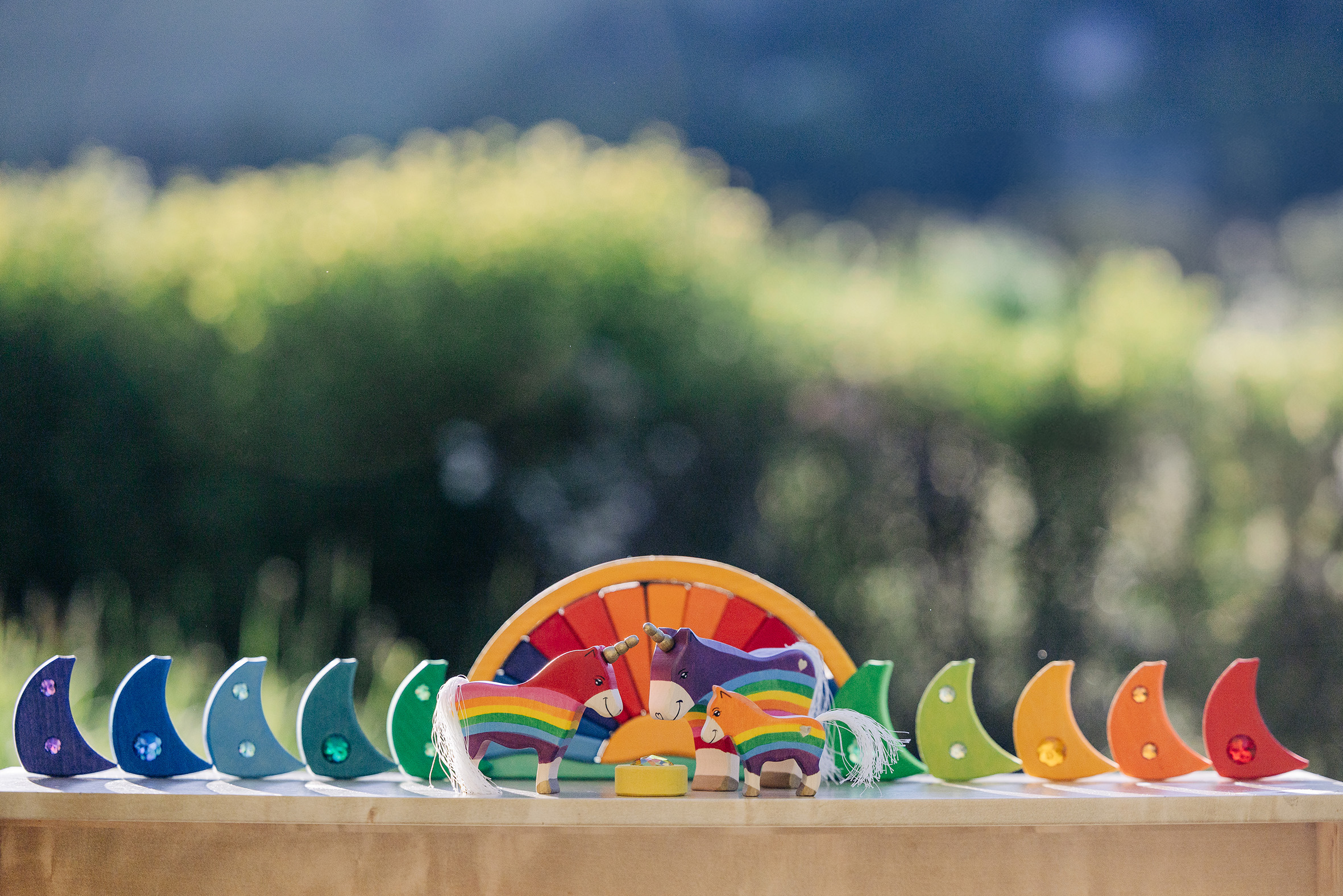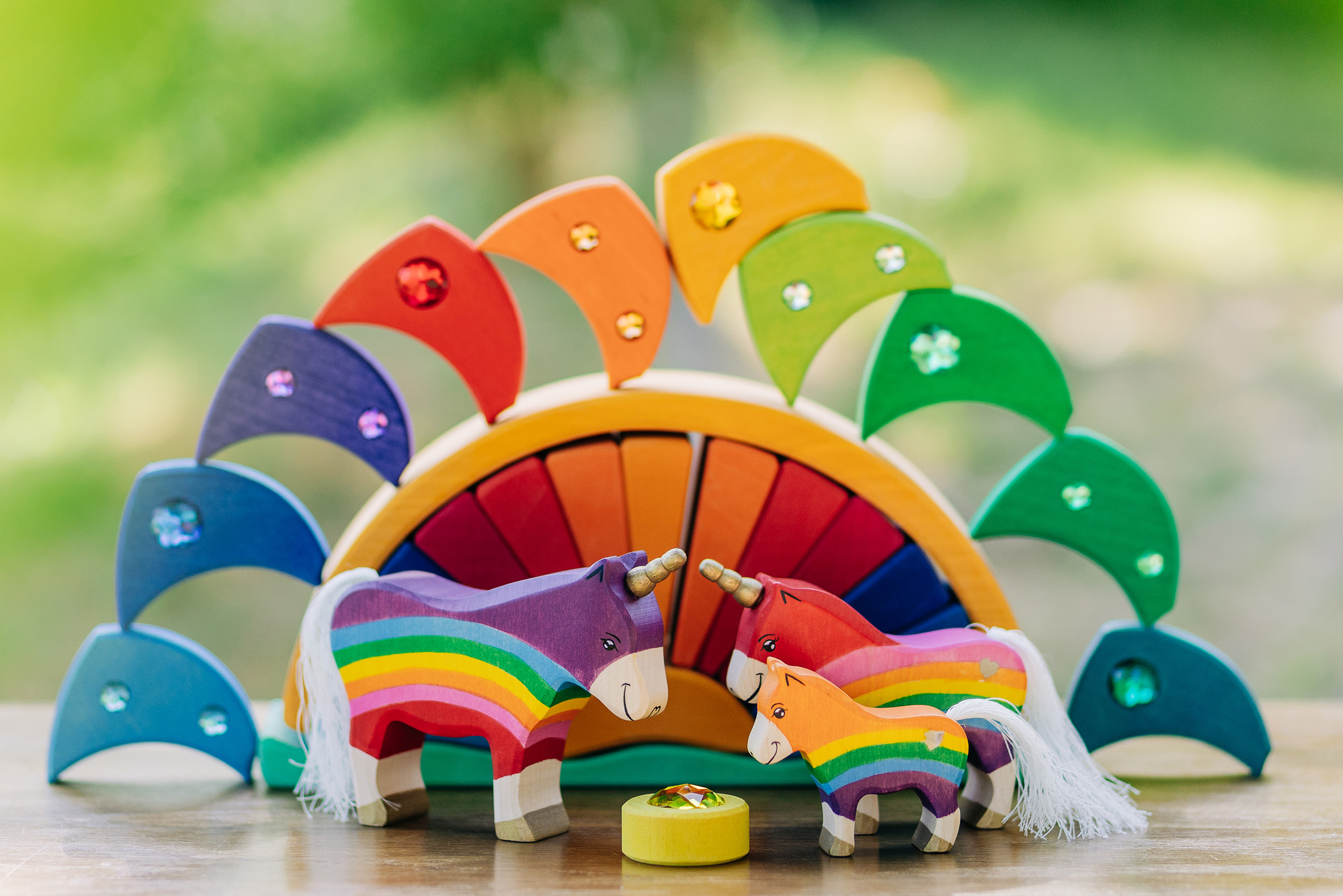 Es gibt Momente, in denen die Welt ein bisschen mehr Glanz und Farbe vertragen kann – und genau dafür sind unsere Regenbogen-Einhörner geschaffen! Hier treffen kräftige Regenbogenfarben auf sanfte Holzstrukturen, funkelnde Schmucksteine auf liebevoll handgemalte Details. Die Einhörner – vom stolzen Leitpferd bis zum fröhlichen Fohlen – bringen Magie ins Kinderzimmer und wecken die Fantasie der Kleinsten. Begleitet werden sie von einem strahlenden Regenbogenbogen, der nicht nur ein dekoratives Highlight ist, sondern auch zum Stapeln, Sortieren und Bauen einlädt. Die glitzernden Elemente fangen das Licht wie kleine Sonnenstrahlen ein und lassen die Szene erstrahlen – fast so, als wäre gerade ein Sommerregenbogen zum Greifen nah. Was diese Spielwelt so besonders macht: Fantasievoll & kreativ: Einhörner, Regenbögen und bunte Steine eröffnen unendliche Spielideen. Handarbeit mit Herz: Aus nachhaltigem Holz gefertigt und mit kindersicheren Farben bemalt. Magischer Glitzer: Kleine Schmucksteine verleihen dem Set das gewisse Funkeln. Spiel & Deko zugleich: Perfekt zum Spielen, aber auch ein echter Hingucker im Kinderzimmer. Ob wilde Einhornabenteuer über Regenbogenbrücken oder friedliche Märchenmomente im glitzernden Licht – dieses Set macht jedes Spiel zu einer Reise in eine magische Welt. Lass die Fantasie fliegen und hol dir den Regenbogenzauber nach Hause!