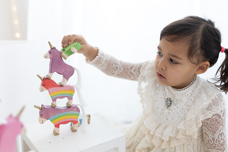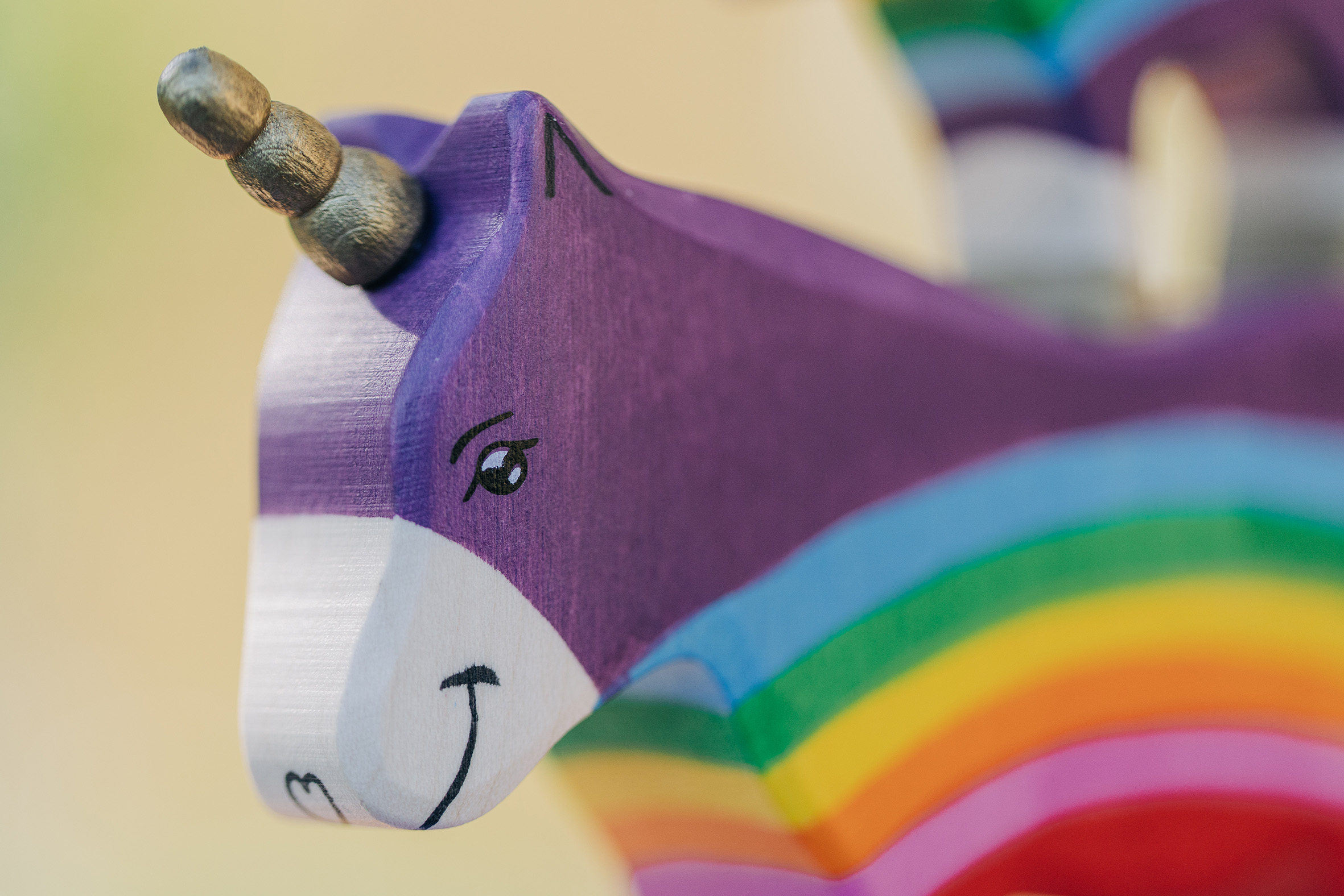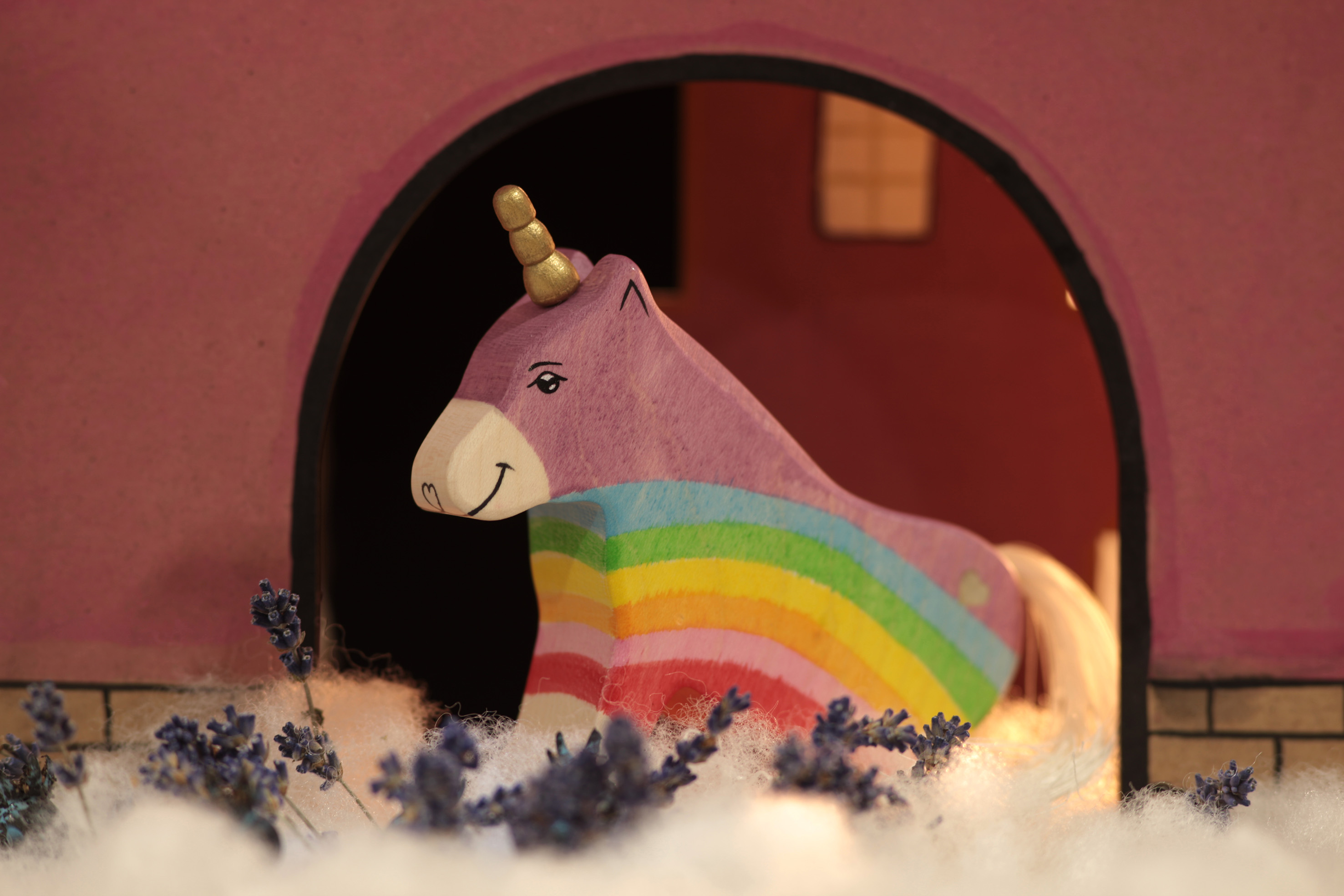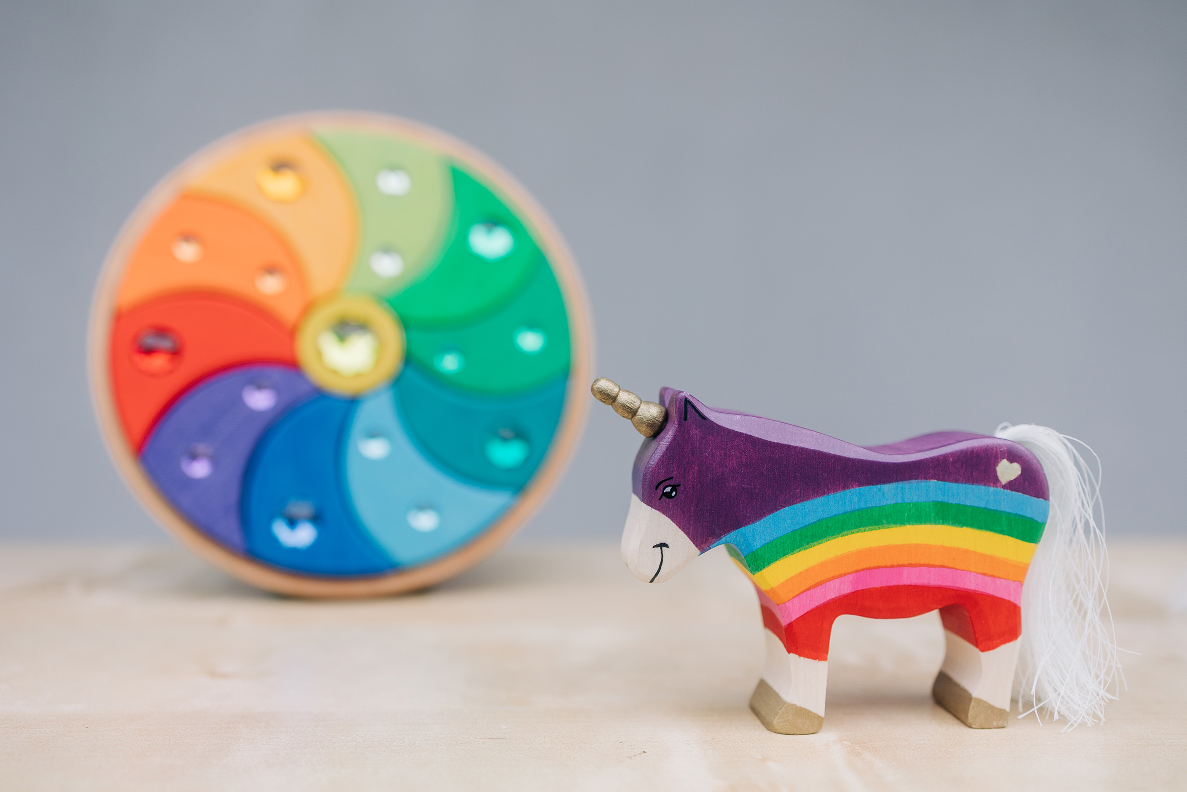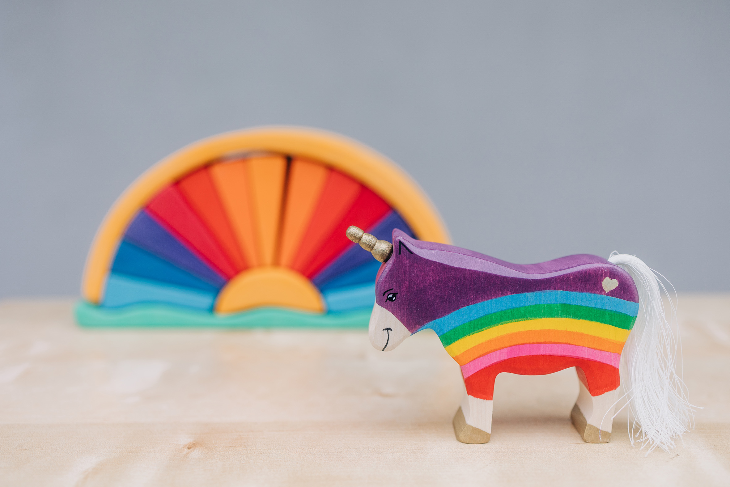 Es gibt Momente, in denen die Welt ein bisschen mehr Glanz und Farbe vertragen kann – und genau dafür sind unsere Regenbogen-Einhörner geschaffen! Hier treffen kräftige Regenbogenfarben auf sanfte Holzstrukturen, funkelnde Schmucksteine auf liebevoll handgemalte Details. Die Einhörner – vom stolzen Leitpferd bis zum fröhlichen Fohlen – bringen Magie ins Kinderzimmer und wecken die Fantasie der Kleinsten. Begleitet werden sie von einem strahlenden Regenbogenbogen, der nicht nur ein dekoratives Highlight ist, sondern auch zum Stapeln, Sortieren und Bauen einlädt. Die glitzernden Elemente fangen das Licht wie kleine Sonnenstrahlen ein und lassen die Szene erstrahlen – fast so, als wäre gerade ein Sommerregenbogen zum Greifen nah. Was diese Spielwelt so besonders macht: Fantasievoll & kreativ: Einhörner, Regenbögen und bunte Steine eröffnen unendliche Spielideen. Handarbeit mit Herz: Aus nachhaltigem Holz gefertigt und mit kindersicheren Farben bemalt. Magischer Glitzer: Kleine Schmucksteine verleihen dem Set das gewisse Funkeln. Spiel & Deko zugleich: Perfekt zum Spielen, aber auch ein echter Hingucker im Kinderzimmer. Ob wilde Einhornabenteuer über Regenbogenbrücken oder friedliche Märchenmomente im glitzernden Licht – dieses Set macht jedes Spiel zu einer Reise in eine magische Welt. Lass die Fantasie fliegen und hol dir den Regenbogenzauber nach Hause!