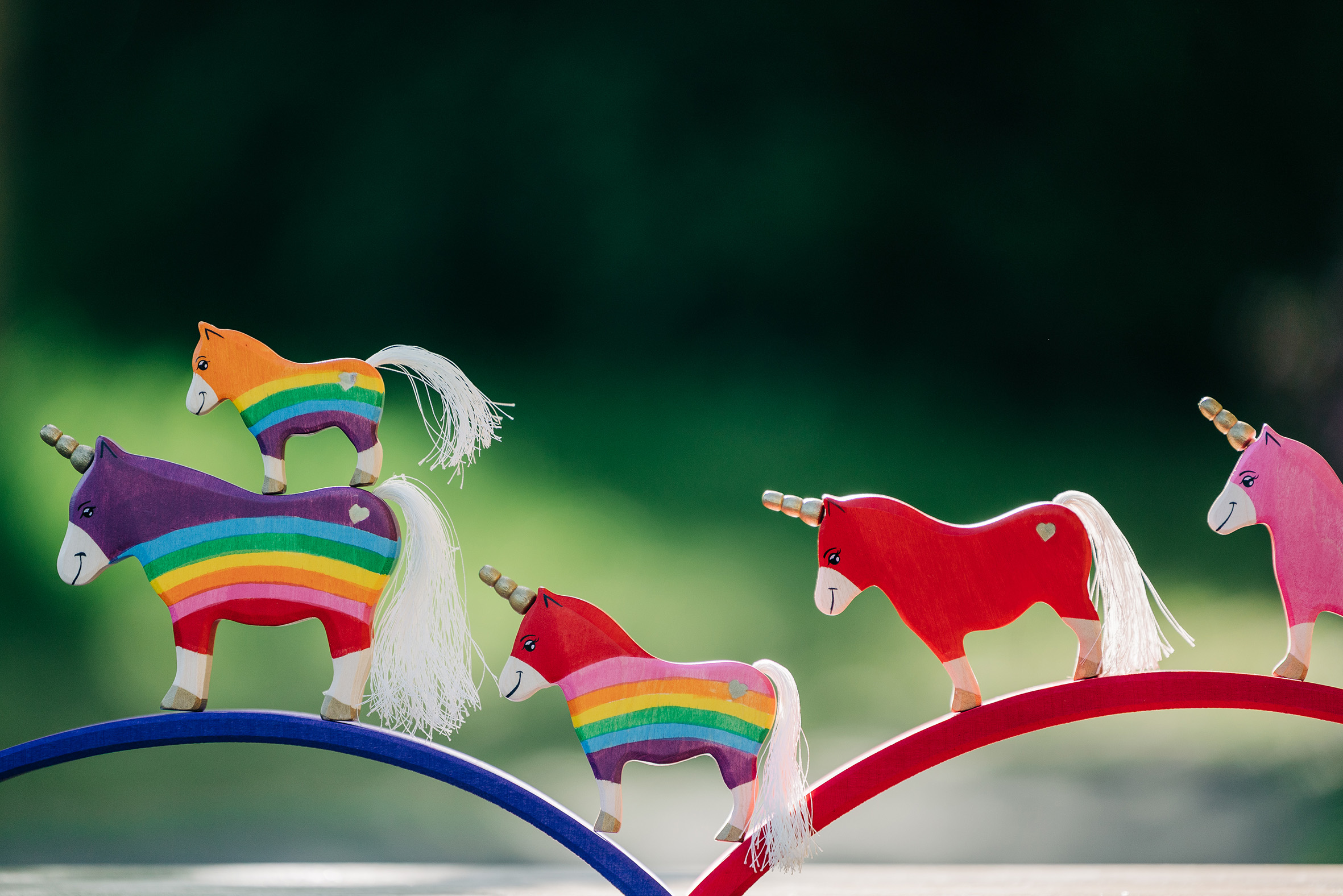 Es gibt Momente, in denen die Welt ein bisschen mehr Glanz und Farbe vertragen kann – und genau dafür sind unsere Regenbogen-Einhörner geschaffen! Hier treffen kräftige Regenbogenfarben auf sanfte Holzstrukturen, funkelnde Schmucksteine auf liebevoll handgemalte Details. Die Einhörner – vom stolzen Leitpferd bis zum fröhlichen Fohlen – bringen Magie ins Kinderzimmer und wecken die Fantasie der Kleinsten. Begleitet werden sie von einem strahlenden Regenbogenbogen, der nicht nur ein dekoratives Highlight ist, sondern auch zum Stapeln, Sortieren und Bauen einlädt. Die glitzernden Elemente fangen das Licht wie kleine Sonnenstrahlen ein und lassen die Szene erstrahlen – fast so, als wäre gerade ein Sommerregenbogen zum Greifen nah. Was diese Spielwelt so besonders macht: Fantasievoll & kreativ: Einhörner, Regenbögen und bunte Steine eröffnen unendliche Spielideen. Handarbeit mit Herz: Aus nachhaltigem Holz gefertigt und mit kindersicheren Farben bemalt. Magischer Glitzer: Kleine Schmucksteine verleihen dem Set das gewisse Funkeln. Spiel & Deko zugleich: Perfekt zum Spielen, aber auch ein echter Hingucker im Kinderzimmer. Ob wilde Einhornabenteuer über Regenbogenbrücken oder friedliche Märchenmomente im glitzernden Licht – dieses Set macht jedes Spiel zu einer Reise in eine magische Welt. Lass die Fantasie fliegen und hol dir den Regenbogenzauber nach Hause!