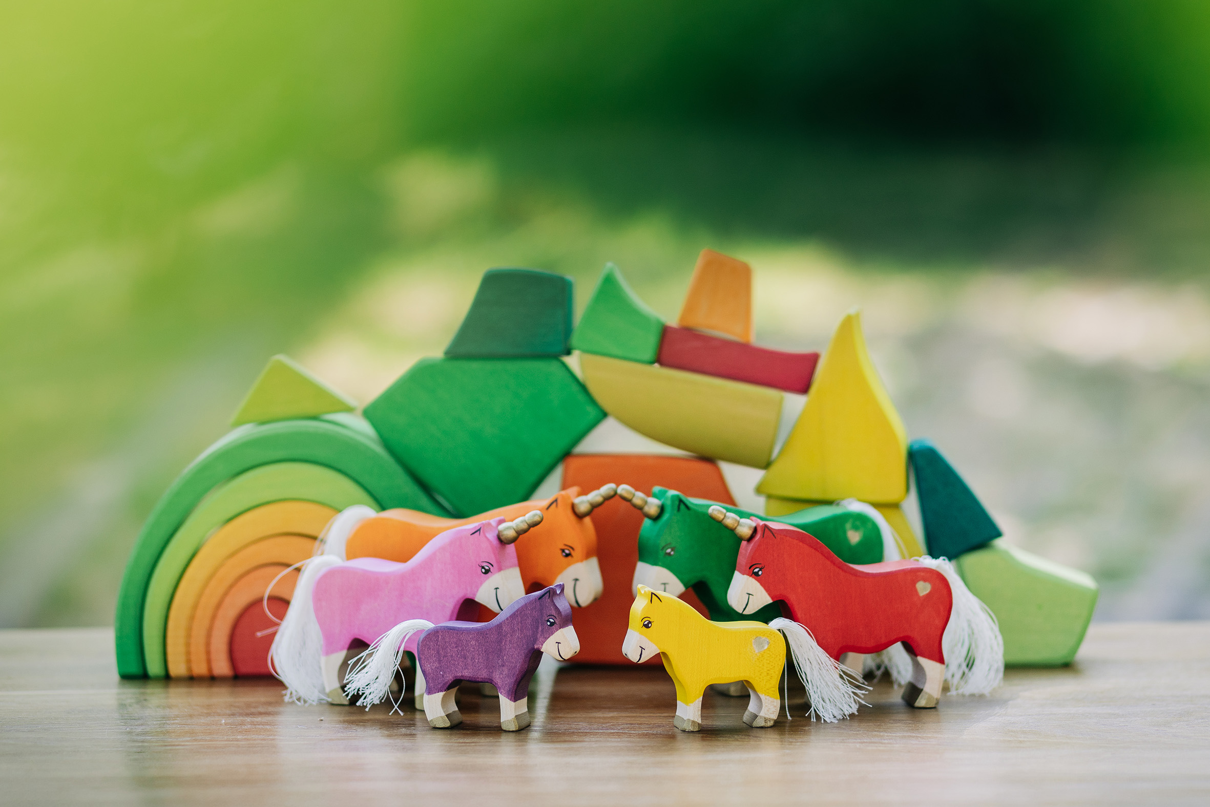 Willkommen in einer Welt voller Farben, Magie und unendlicher Fantasie! Unsere liebevoll handgefertigten Einhörner aus Holz laden Kinder dazu ein, in eine bunte Traumwelt einzutauchen, funkelnde Edelsteine und geheimnisvolle Abenteuer auf sie warten. Das stolze blaue Einhorn bewacht den Regenbogenpalast, während das goldene Einhorn neugierig durch die farbenfrohe Landschaft galoppiert. Und das zarte rosafarbene Einhorn bringt mit seiner Sanftheit eine Prise Zauber und Freundlichkeit in jede Geschichte. Begleitet werden die Fabelwesen von leuchtenden Holzbausteinen, die wie funkelnde Regenbogenkristalle wirken. Ob Türme, Regenbogenbrücken oder magische Höhlen – die bunten Elemente lassen sich immer wieder neu kombinieren und eröffnen unendliche Spielmöglichkeiten. Lass die Magie einziehen – entdecke jetzt unsere zauberhafte Einhorn-Welt!