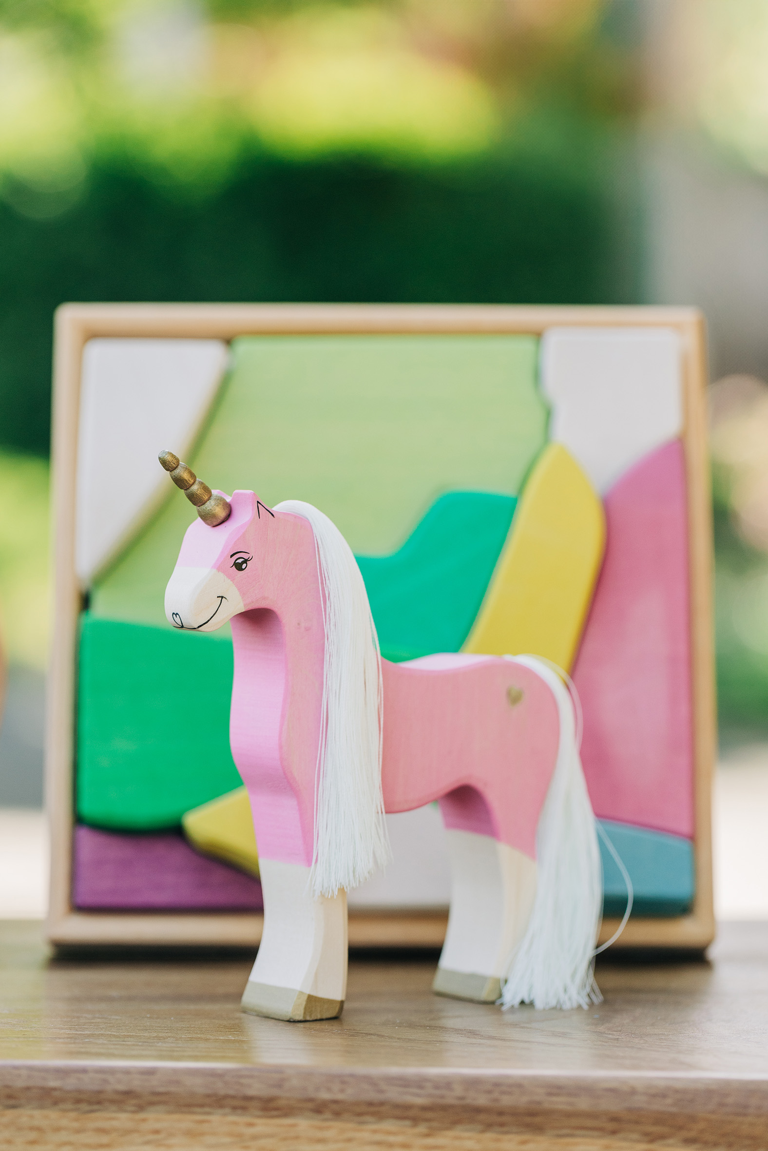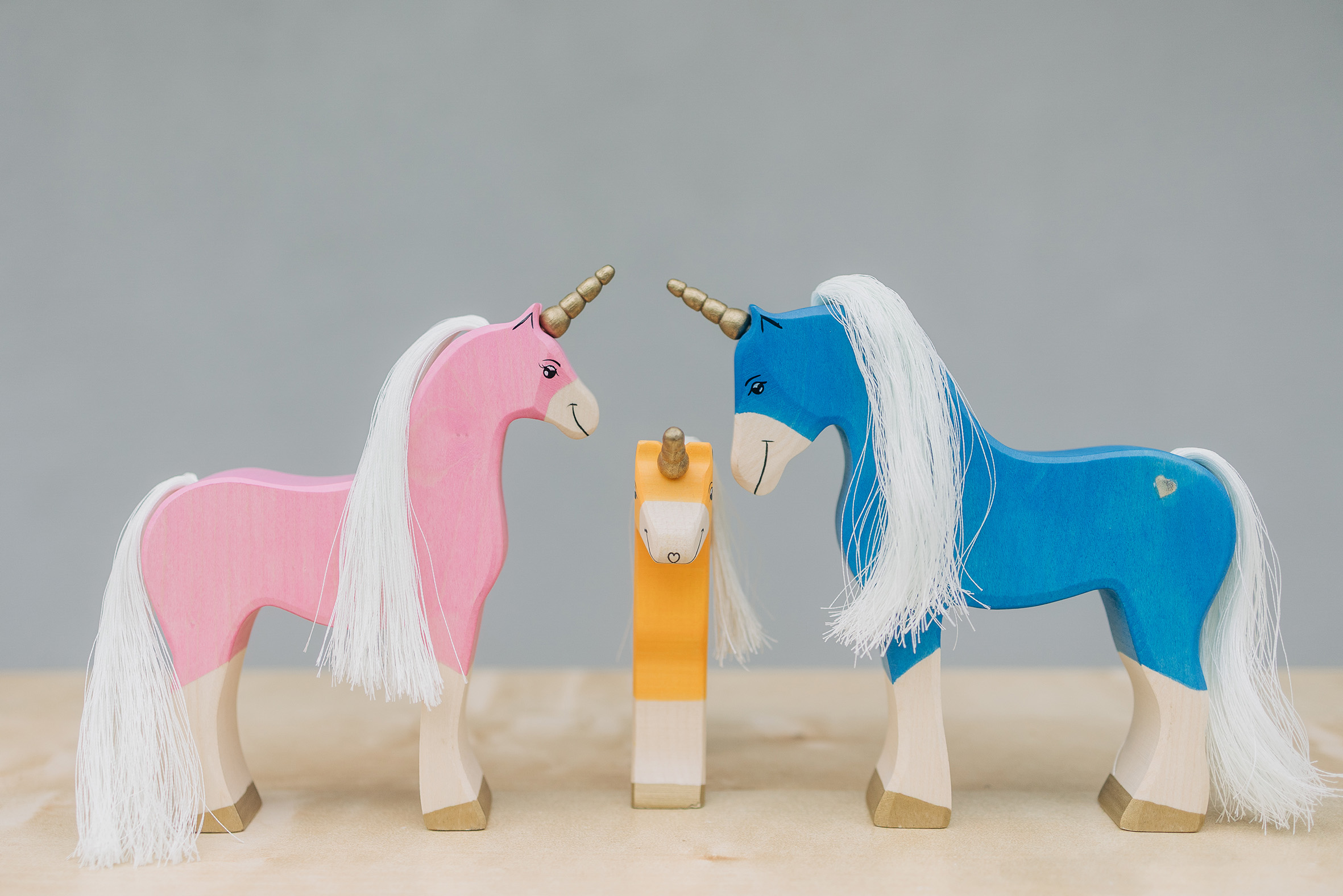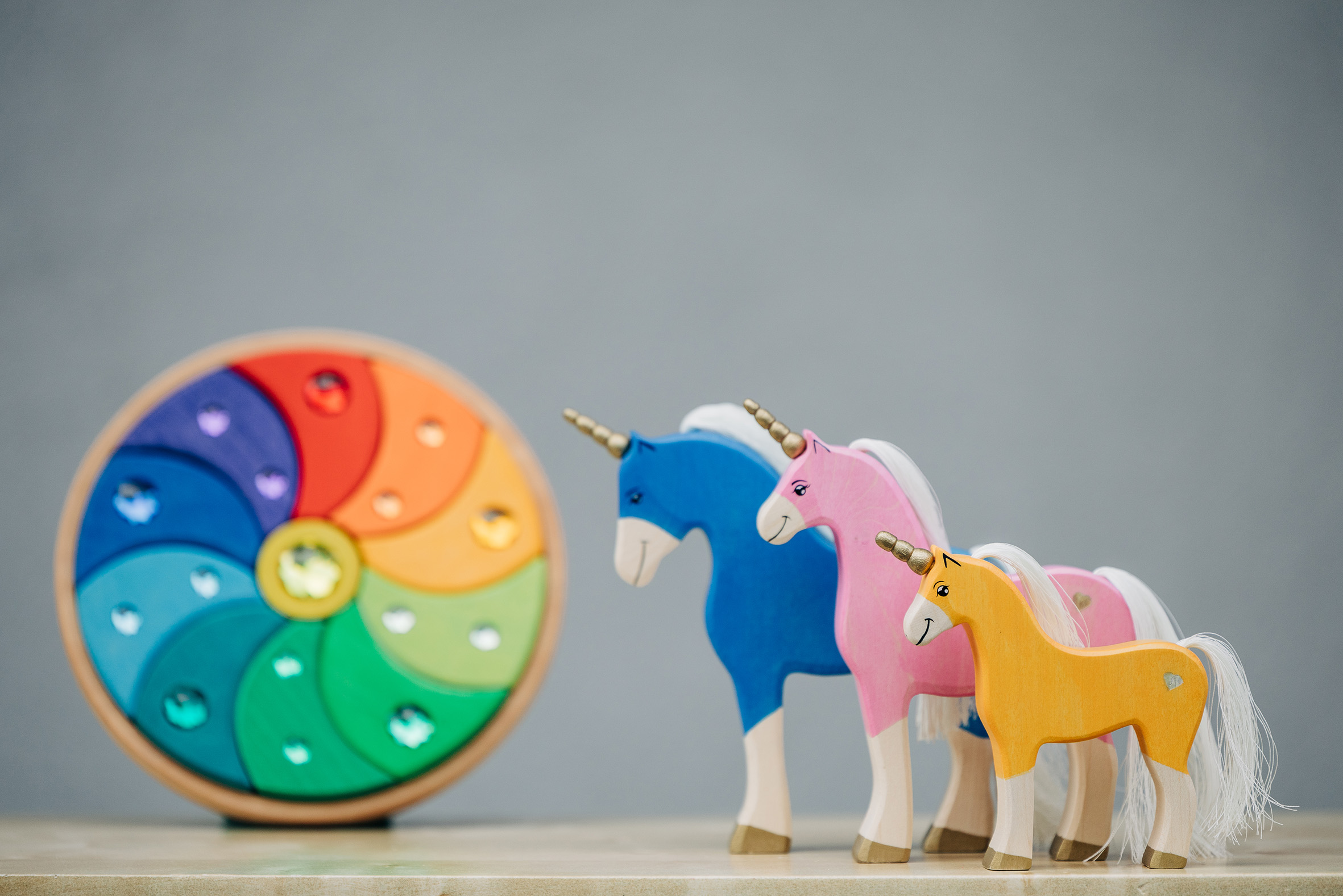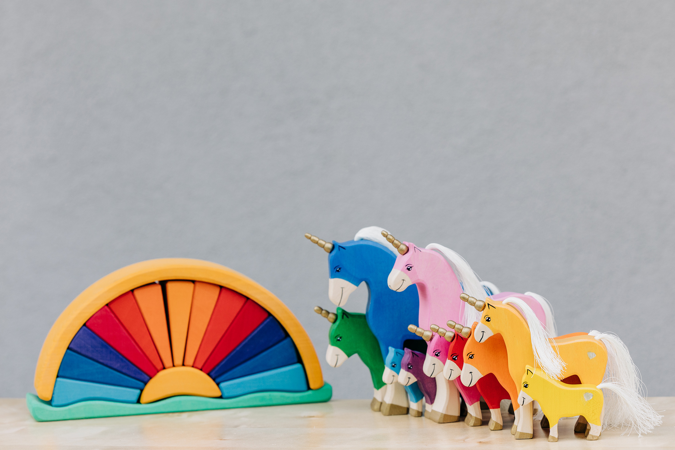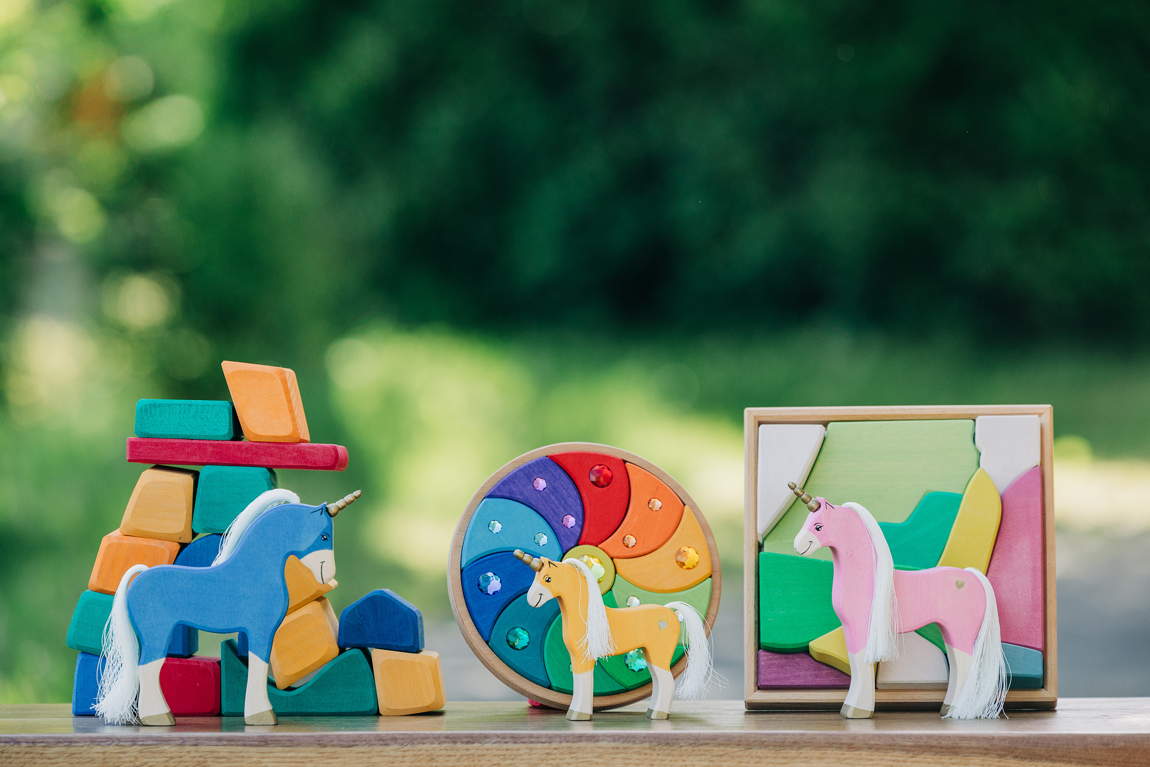 Willkommen in einer Welt voller Farben, Magie und unendlicher Fantasie! Unsere liebevoll handgefertigten Einhörner aus Holz laden Kinder dazu ein, in eine bunte Traumwelt einzutauchen, funkelnde Edelsteine und geheimnisvolle Abenteuer auf sie warten. Das stolze blaue Einhorn bewacht den Regenbogenpalast, während das goldene Einhorn neugierig durch die farbenfrohe Landschaft galoppiert. Und das zarte rosafarbene Einhorn bringt mit seiner Sanftheit eine Prise Zauber und Freundlichkeit in jede Geschichte. Begleitet werden die Fabelwesen von leuchtenden Holzbausteinen, die wie funkelnde Regenbogenkristalle wirken. Ob Türme, Regenbogenbrücken oder magische Höhlen – die bunten Elemente lassen sich immer wieder neu kombinieren und eröffnen unendliche Spielmöglichkeiten. Lass die Magie einziehen – entdecke jetzt unsere zauberhafte Einhorn-Welt!