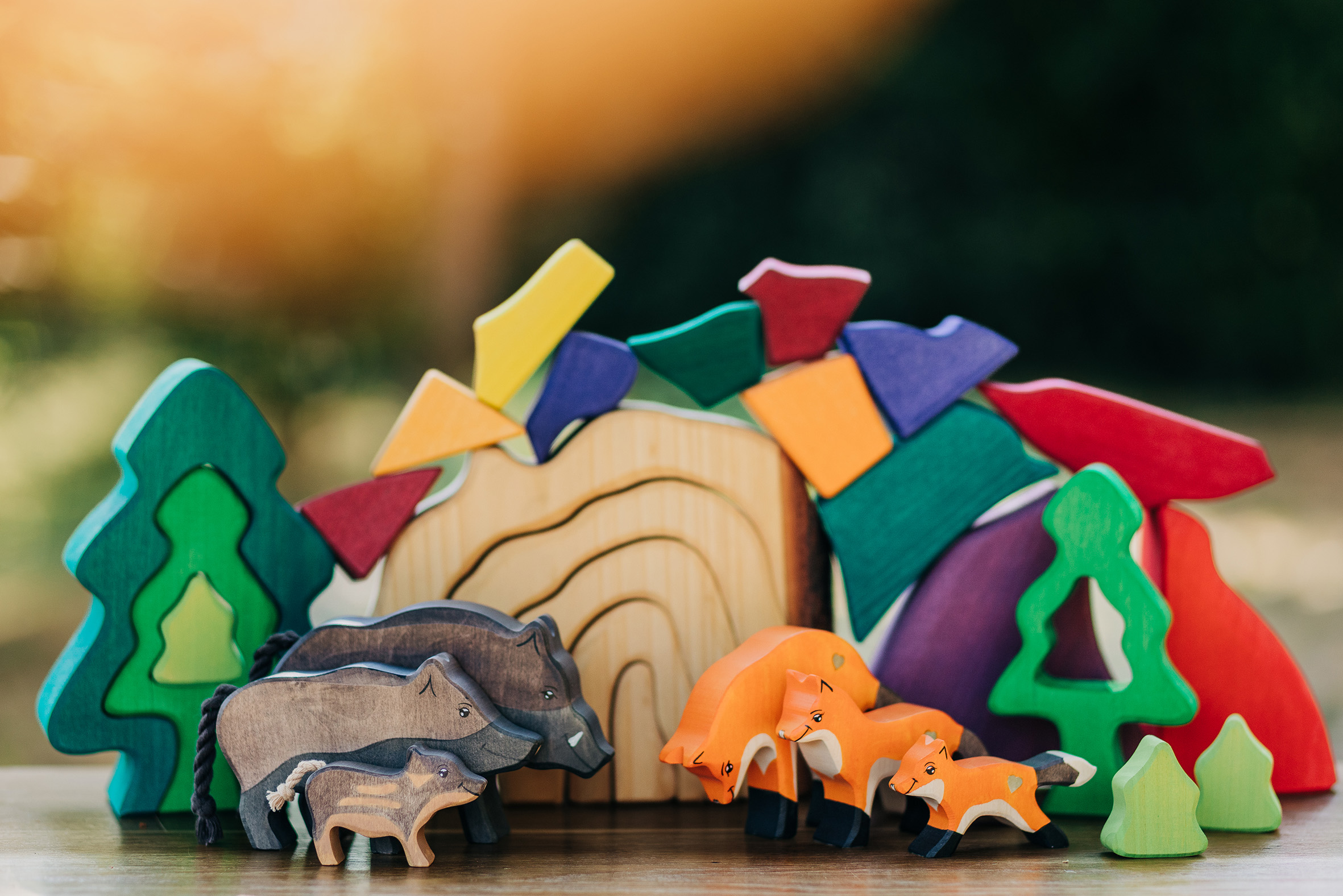 Zwischen goldenen Blättern und raschelndem Moos streifen die leuchtend orangefarbenen Füchse durch den Wald, immer auf der Suche nach einem neuen Abenteuer. In der Ferne grunzt die Wildschwein-Familie – stark, mutig und doch so sanft, wie nur eine Familie sein kann. Gemeinsam erkunden sie die bunte Landschaft aus handgefertigten Holzbausteinen, die sich mal als geheimnisvolle Höhle, mal als herbstliche Waldlichtung zeigen. Jedes einzelne Element – von der sanft geschwungenen Form bis zur intensiven Farbnuance – wird mit viel Liebe aus nachhaltigem Holz gefertigt und mit kindersicheren Farben bemalt. So entsteht nicht nur ein langlebiges Spielzeug, sondern ein Stück Natur, das Generationen überdauert.