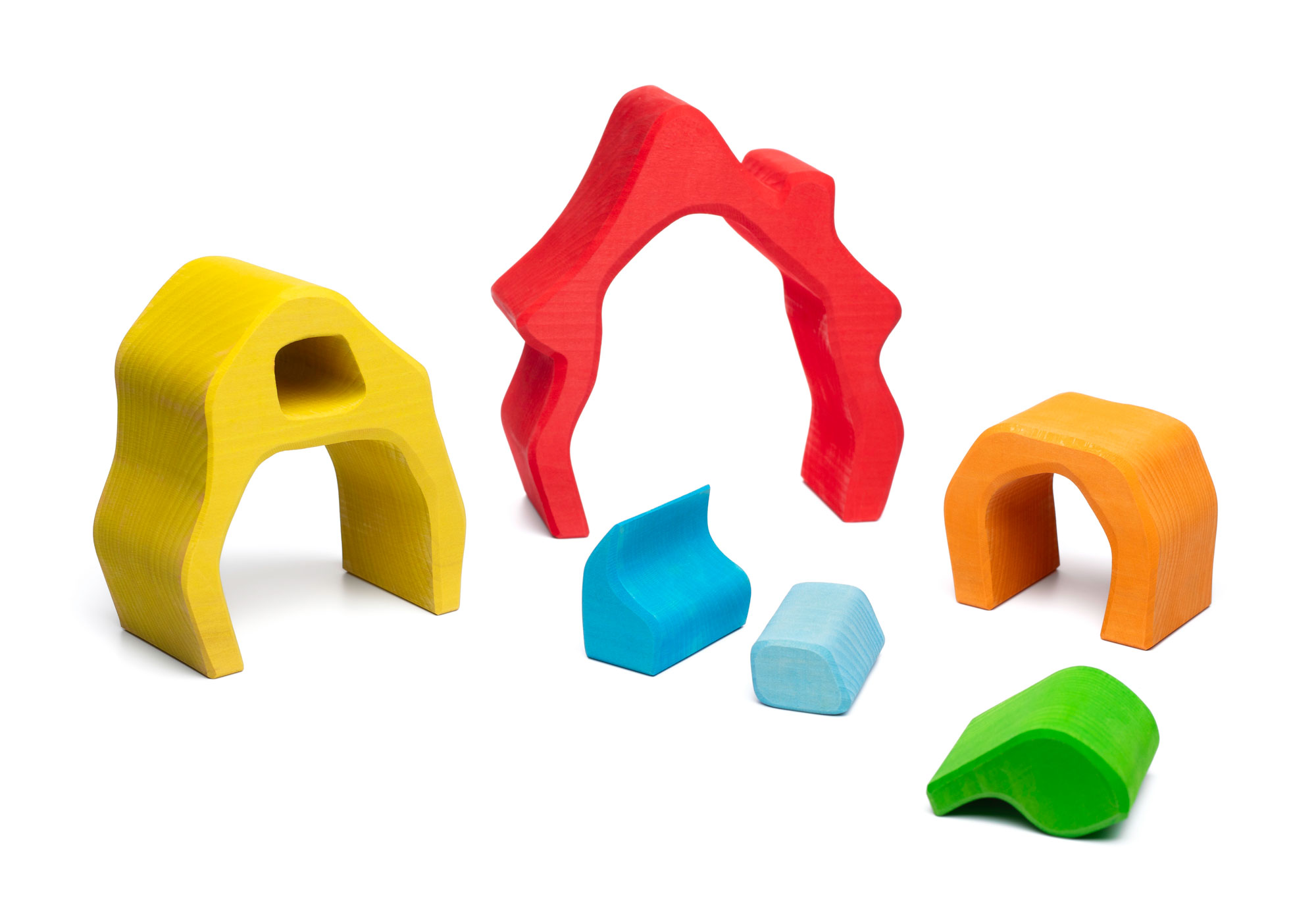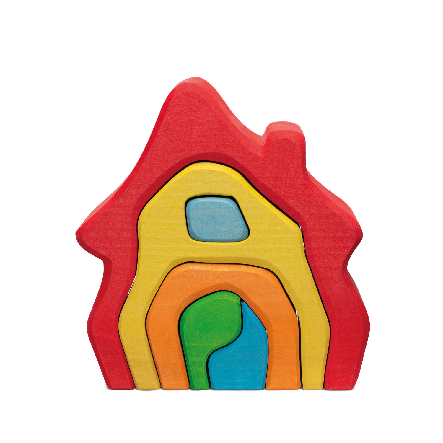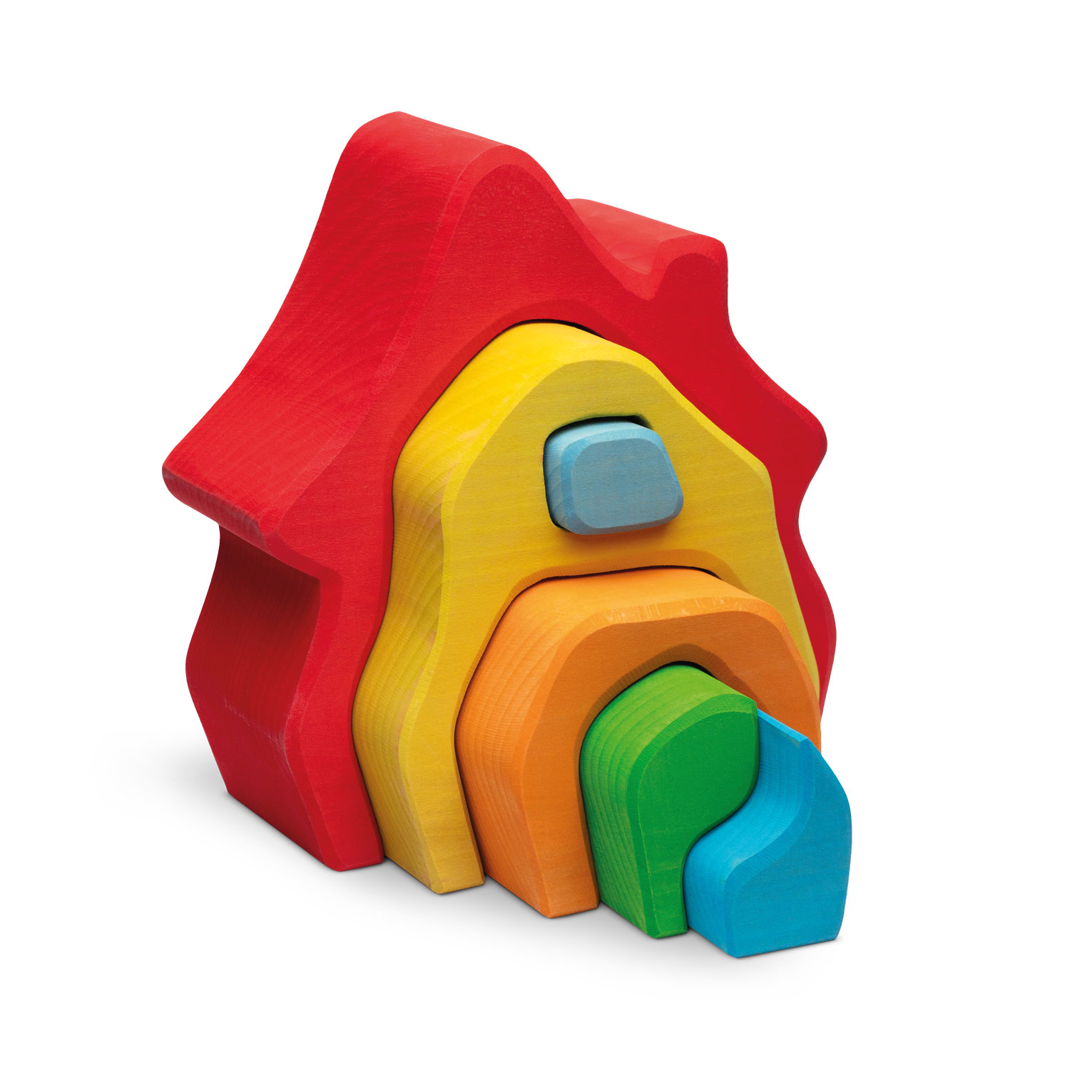 Prinzessin, Hexe oder Zwergenvolk? In dieses Häuslein würde wohl jeder gerne einziehen. Das aus 6 Teilen bestehende, von Hand aufwendig abgerundete Formenspiel ist in wunderschön leuchtenden Farben gebeizt. Wie ein Puzzle kann es auseinandergenommen und wieder zusammengefügt werden. Aus den einzelnen Bauteilen und Bögen kann aber auch etwas ganz Neues entstehen. So wird ein besonders kreativer, freier Bau-Impuls im Kind gefördert. Das Raue der unlackierten Holzoberflächen, durch welche die Maserung des Holzes durchscheint, lässt die einzelnen Formen sehr gut aufeinander haften und wirkt haptisch sehr natürlich und ansprechend. Die Glückskäfer-Formenspiele aus massivem Lindenholz wirken sich wohltuend und anregend auf die Fantasiekräfte der Kinder aus. Farblich wunderschön gestaltet und harmonisch-rund geformt, wird hier das Freie im Spiel der Kinder pädagogisch sanft gefördert und dem kraftvollen Impuls des Erschaffens aus der eigenen Fantasie Raum gegeben. Ganze Spielewelten entstehen so zusammen mit Figuren, Püppchen und Naturmaterialien.