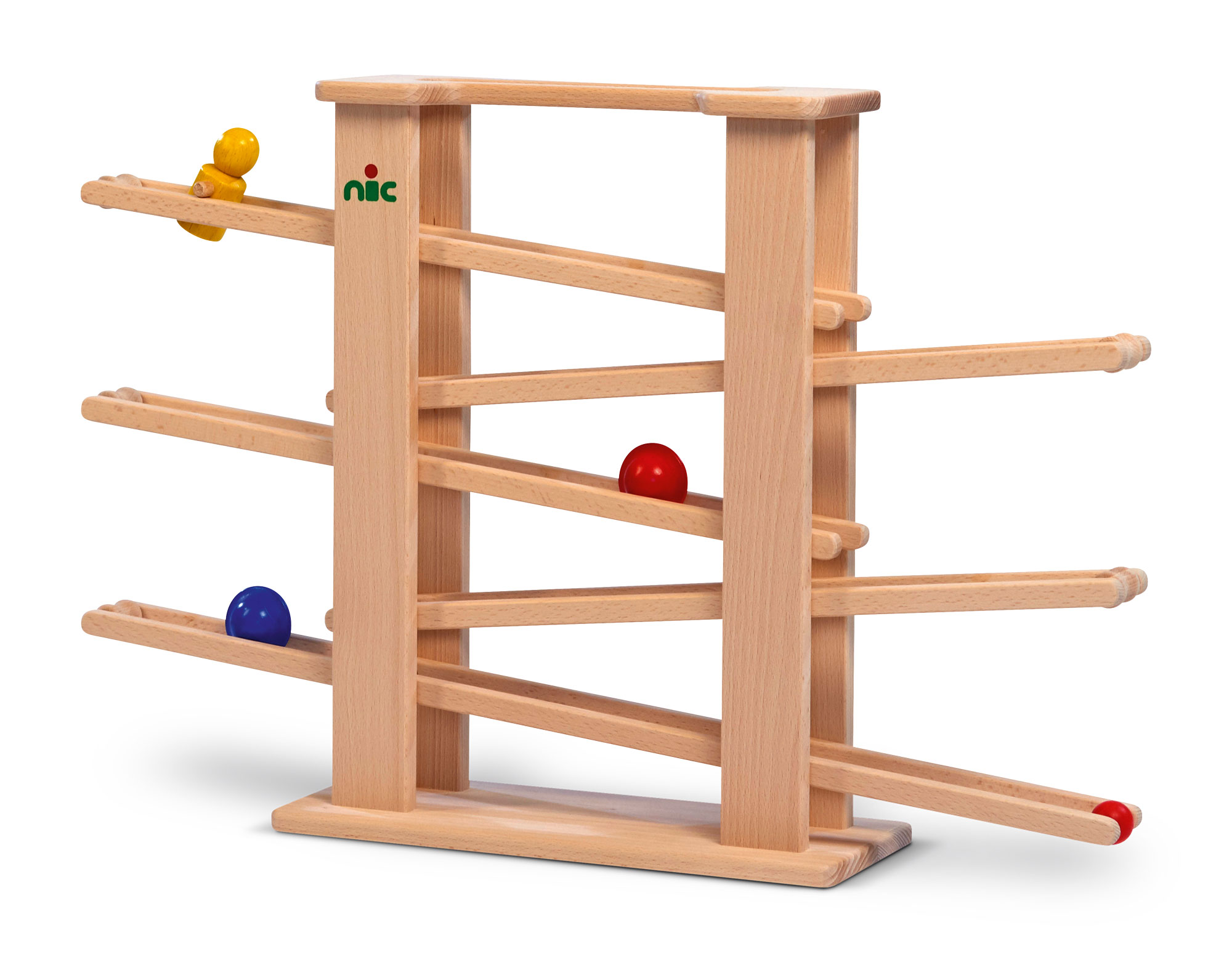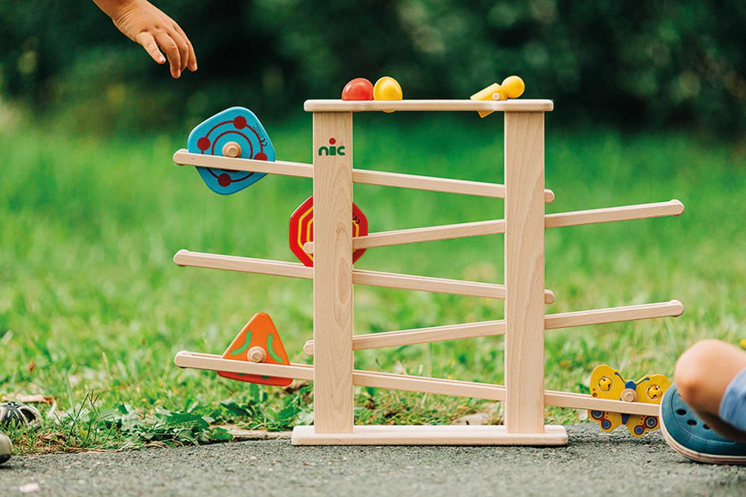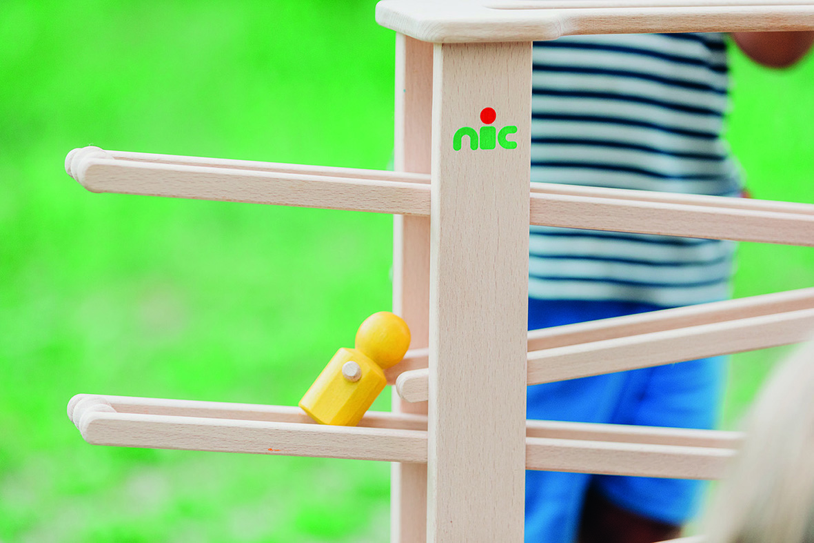 Die nic Multibahn ist seit Jahrzehnten ein echter Klassiker unter den Holzkugelbahnen und steht für allerhöchste Qualitätsansprüche. Sie wird aus massivem Buchenholz mit großer Sorgfalt und unter Berücksichtigung sämtlicher Sicherheitsnormen gefertigt. Alle Ecken dieses pädagogisch sehr wertvollen Kinderspielzeugs sind sorgsam abgerundet, so dass sich das Kleinkind nicht daran verletzen kann. Eine nic Multibahn ist ein zeitloses und dauerhaft wertvolles Geschenk, das mit Bedacht und liebevoller Achtsamkeit ausgewählt wird, wenn man einem kleinen Kind etwas ganz Besonderes mitgeben möchte. Die 3 Laufteile sind schlicht gehalten und genau richtig für die ersten Wahrnehmungen von Kleinkindern in Bezug auf Grundfarben und Rollverhalten der Zubehörteile in unserer Bahn. Die nic Multibahn ist ein wahrer Klassiker unter den Holzspielzeugen für Kinder zwischen einem und ca. sechs Jahren und hat einen sehr hohen, pädagogischen Spielwert. Sobald Babys sicher auf ihren Füßen stehen können und die Feinmotorik in den Händen üben, kann man das freudige, glucksende Lachen im Spiel mit der Multibahn vernehmen, wenn die – entweder noch von den Eltern oder selbständig – in die Bahn eingelegten Laufteile in ihren unterschiedlichen Geschwindigkeiten und individuellen Bewegungen die Bahnen hinunterfahren. Ältere Kinder lieben dann die größeren Multibahnen, die auch mit sehr verschiedenen Laufteilen bespielt werden können. Und die noch Größeren haben irgendwann Freude daran, selber Laufteile zu basteln bzw. sich eigene Hürden und Hindernisse für die Bahn auszudenken. So können qualitativ hochwertige, robuste und mit pädagogischer Bedacht hergestellte Kugelbahnen wie die nic Multibahn Kinder von der Babyzeit bis zum Ende der Kindergartenzeit treu begleiten – und dann in guter, freudvoller Erinnerung an die nächste Generation weitergegeben werden.