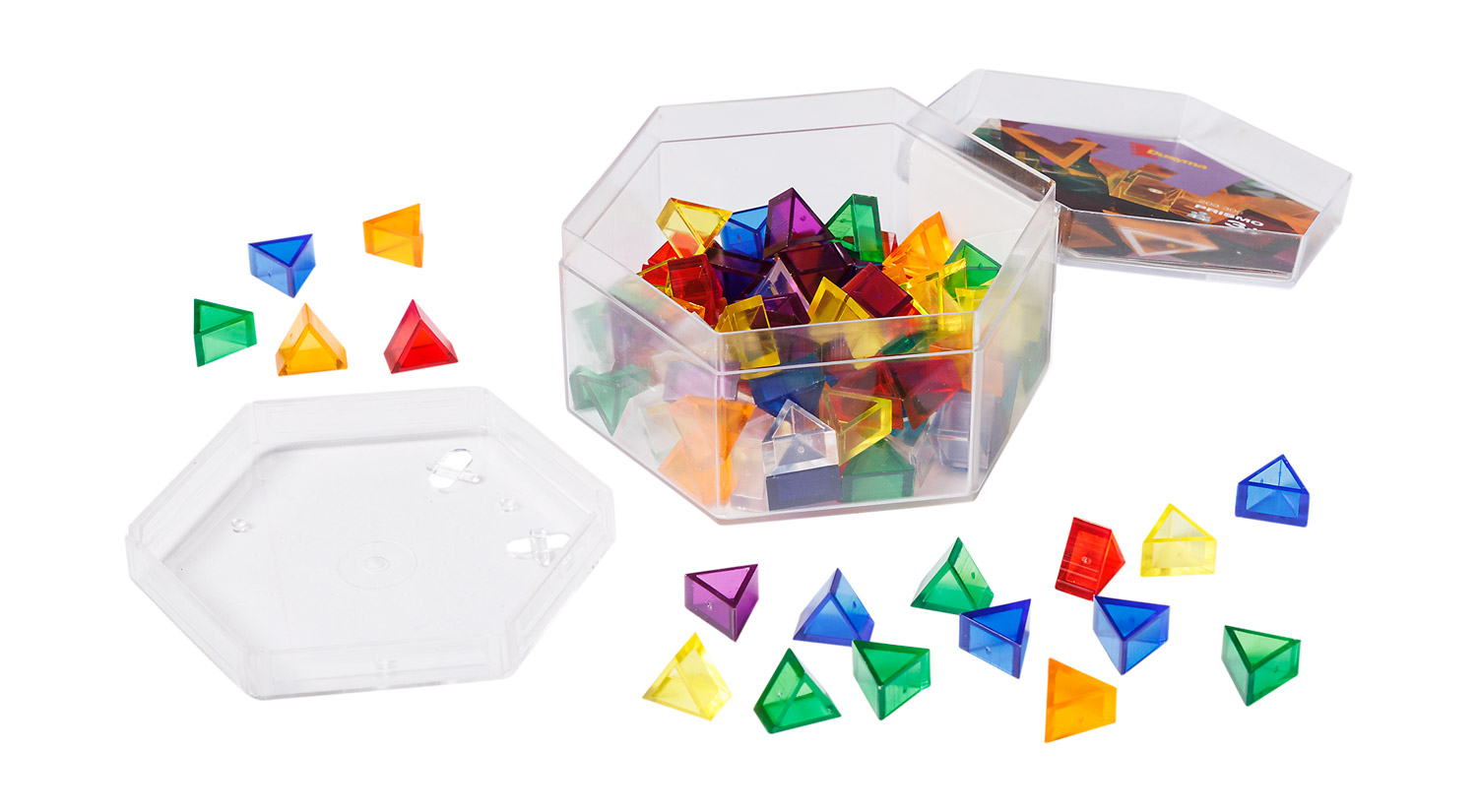 Inhalt: ca. 100 Prismos (in 7 Farben sortiert, Seitenlänge 1,7 cm, 1 cm dick), 1 kleiner Legerahmen transparent (Ø 11,0 cm), inklusive Motivvorlagen