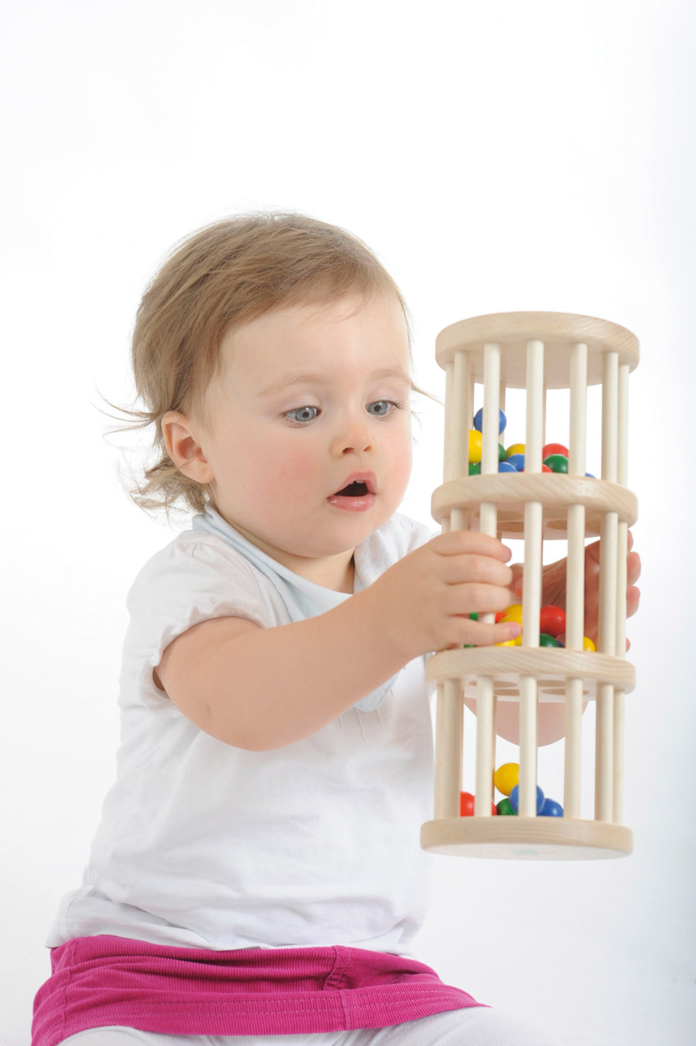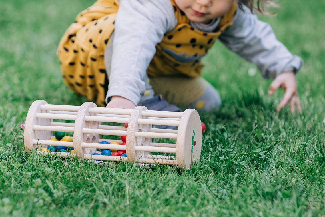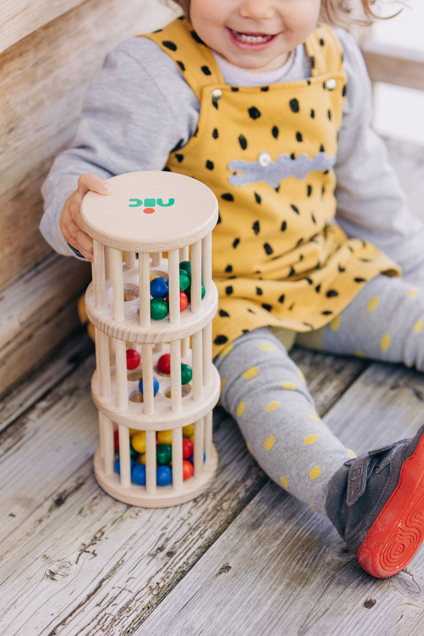 Der große Rasselturm mit drei Ebenen aus wunderschönem, massivem Buchenholz ist ein ganz besonderes Holzspielzeug für Babys bzw. Kleinkinder zwischen ca. 10 Monaten und zwei Jahren. Das tolle Babyspielzeug spricht alle Sinne des kleinen Kindes an. Haptisch wird der wunderbare Werkstoff Holz gut erfühlt. Seine Wärme und Natürlichkeit kann ertastet und gegriffen werden. Optisch erfreuen die bunten Farben und das fein gemaserte Buchenholz sowie die lustig und unermüdlich durch die Löcher plumpsenden Holzkugeln die Augen der Allerkleinsten. Und die Ohren werden aufmerksam, wenn die vielen Holzkugeln beim Umdrehen oder Rollen des Holzspielzeugs lustig klackern, rasseln und kullern. Das ganz besondere Rasselgeräusch entsteht dadurch, dass die Kugeln durch die Konstruktion des Rasselturms über die Etagen langsam nach unten kullern. Das Geräusch hat gleichzeitig etwas Interessantes, das die Aufmerksamkeit der Kleinkinder fesselt, und etwas Beruhigendes wie ein Regenmacher. Da der große nic Rasselturm zudem wunderbar auf dem Fußboden mitgerollt werden kann, ist er auch in der Zeit, in der Babys damit beginnen mobil zu werden, ein fröhlicher Begleiter. Stabil, sicher und in gewohnt hochwertiger Qualität wurde das Baby- und Kleinkindspielzeug mit viel Liebe zum Detail aufwendig von Hand gefertigt.