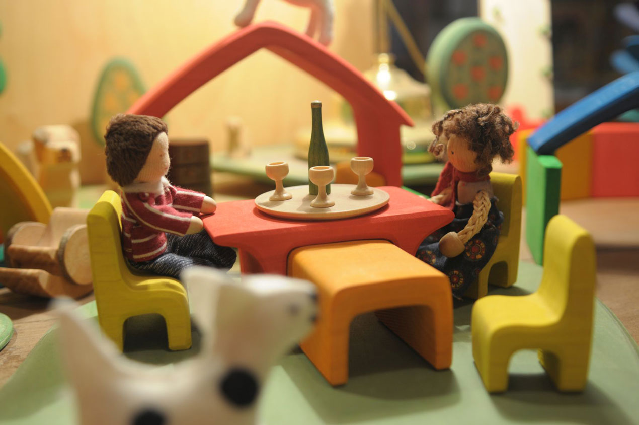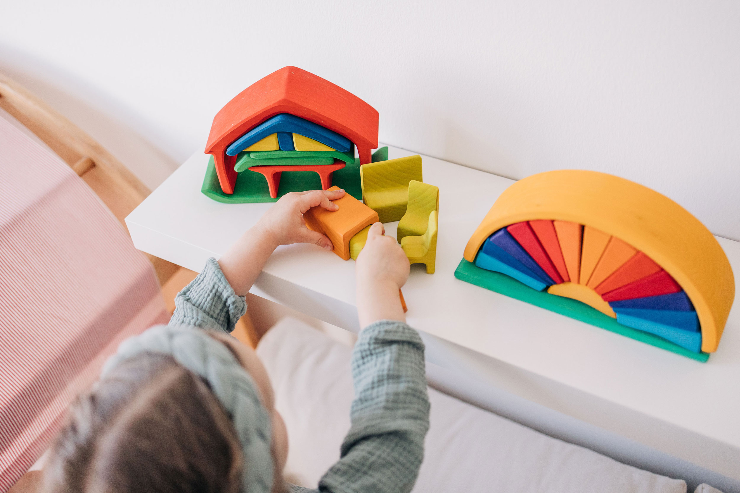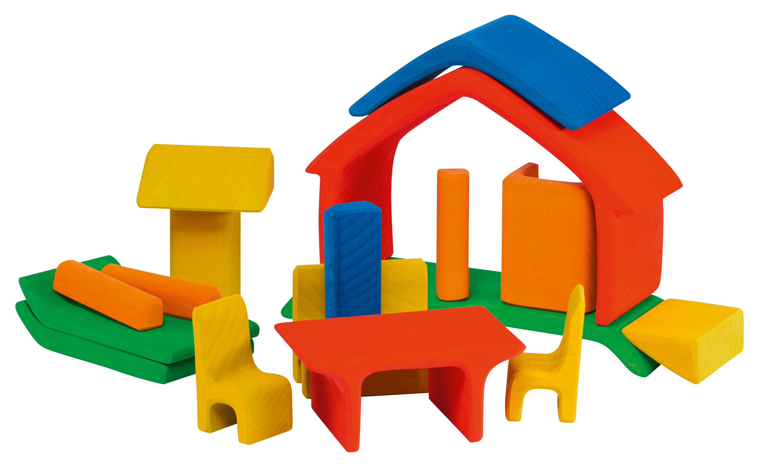 Das wunderschön harmonisch in seiner Form- und Farbgebung gestaltete Glückskäfer-Möbelhaus ist ein Kinderspielzeug von hohem pädagogischem Spielwert. In der „kleinen Welt“ haben Kinder die Möglichkeit, die Erfahrungen, die sie in ihrem Alltag machen, spielerisch nachzuempfinden und sanft zu verarbeiten. Einfache Möbelstücke wie Tisch, Stühle, Bett und Haus werden Spielpüppchen oder Tieren aus Filz oder Holz zum Zuhause. Dort erleben die Spielfiguren, was die Kinder auch erleben: im Familienalltag, in der Kinderkrippe, im Kindergarten. So wird aus dem Möbelhaus zusammen mit einer guten Portion kindlicher Fantasie schnell eine ganze Puppenstube. Und das Beste an diesem zusammensteckbaren Häuslein ist: man kann es ganz leicht überallhin zum Spielen mitnehmen. Das Raue der unlackierten Holzoberfläche, durch welche die schöne Maserung des Holzes durchscheint, lässt die Formenteile sehr gut aufeinander „haften“. Daher wird ein ganz besonders kreativer, freier Bau-Impuls im Kind gefördert. Die Kinder erfahren im Spiel mit den großen, griffigen Lindenholz-Formenteilen zudem optisch und haptisch sehr unmittelbar den wohltuend natürlichen Werkstoff Holz. Hochwertige, sorgfältig hergestellte Holzbausteine und Formenspiele aus guten Naturmaterialien sind ein pädagogisch sehr wertvolles und zeitloses Holzspielzeug für Kinder. Im fantasievollen, ruhigen Spiel der Kinder kann so aus den freien Formen immer Neues entstehen. Ganze Spielewelten, die zusammen mit Holztieren, Figuren und Püppchen, Dekorationstüchern und Naturmaterialien ausgebaut und kreativ erschaffen werden. Entgegen den Spielzeugen, denen ein fester Spielsinn bereits eingeschrieben ist, wird hier das Freie im Spiel der Kinder pädagogisch sanft gefördert und so dem kraftvollen Impuls des Erschaffens aus der eigenen Fantasie Raum gegeben.