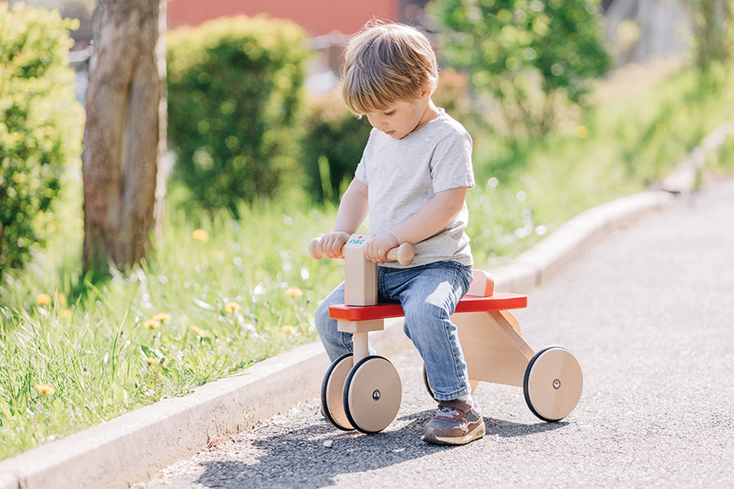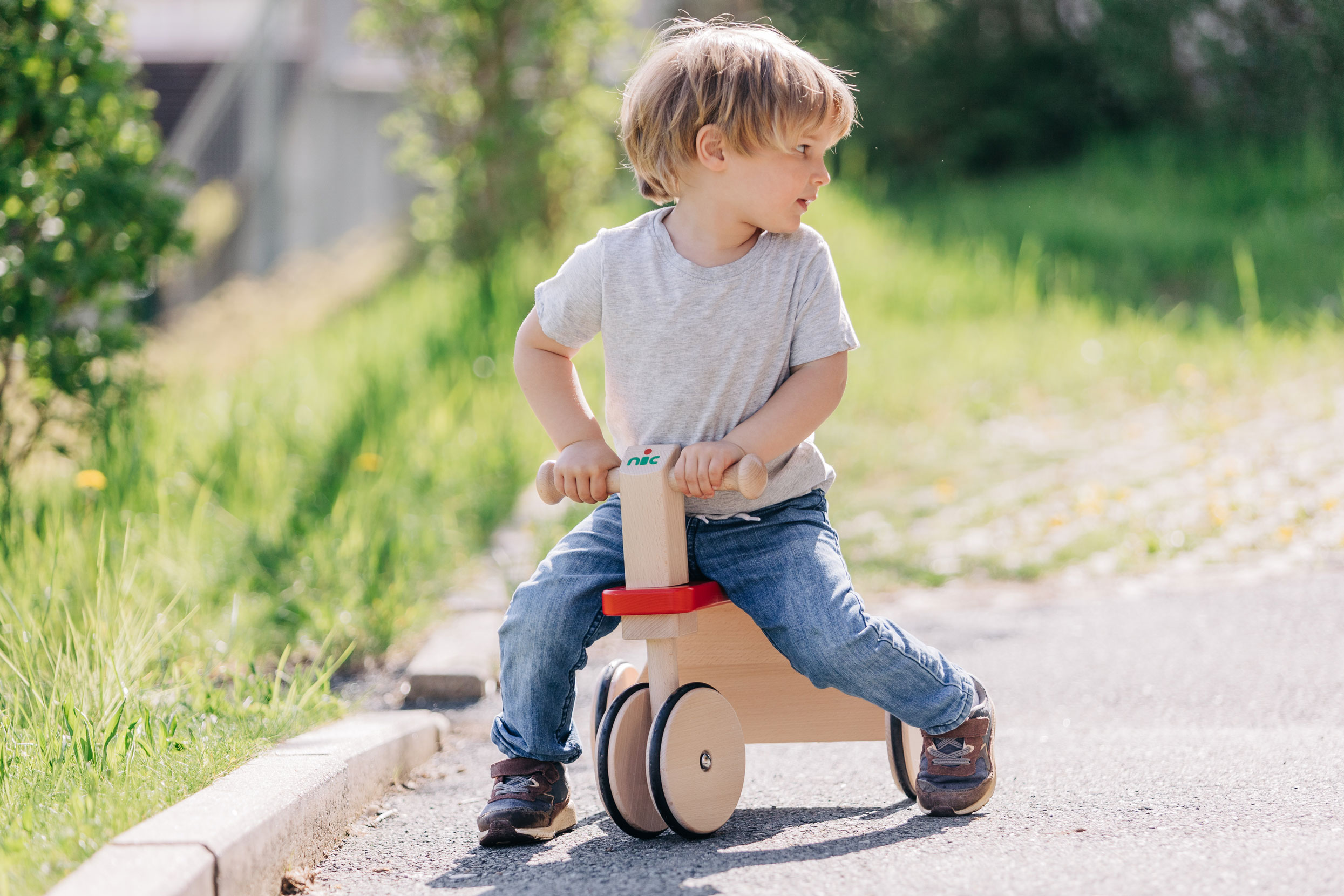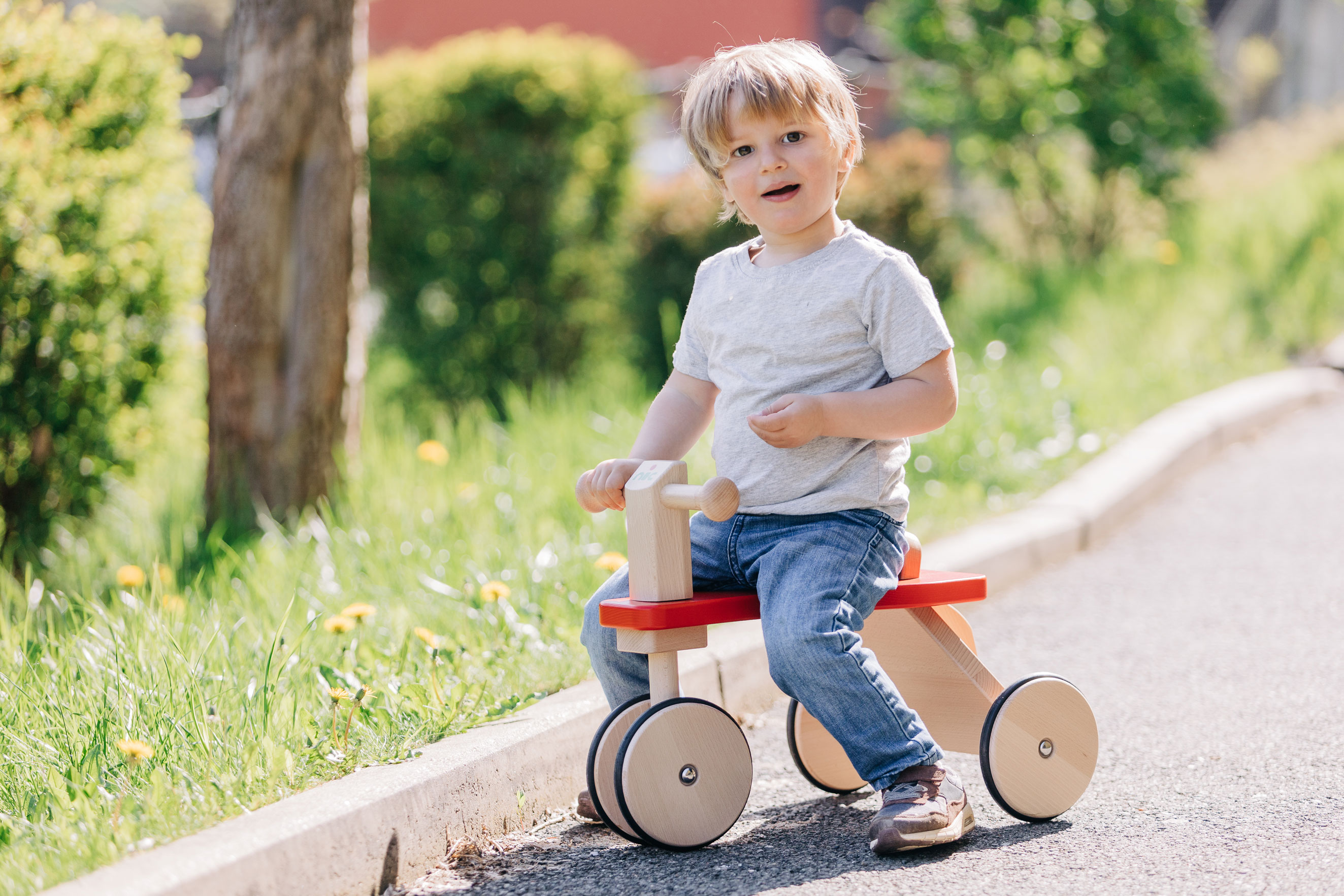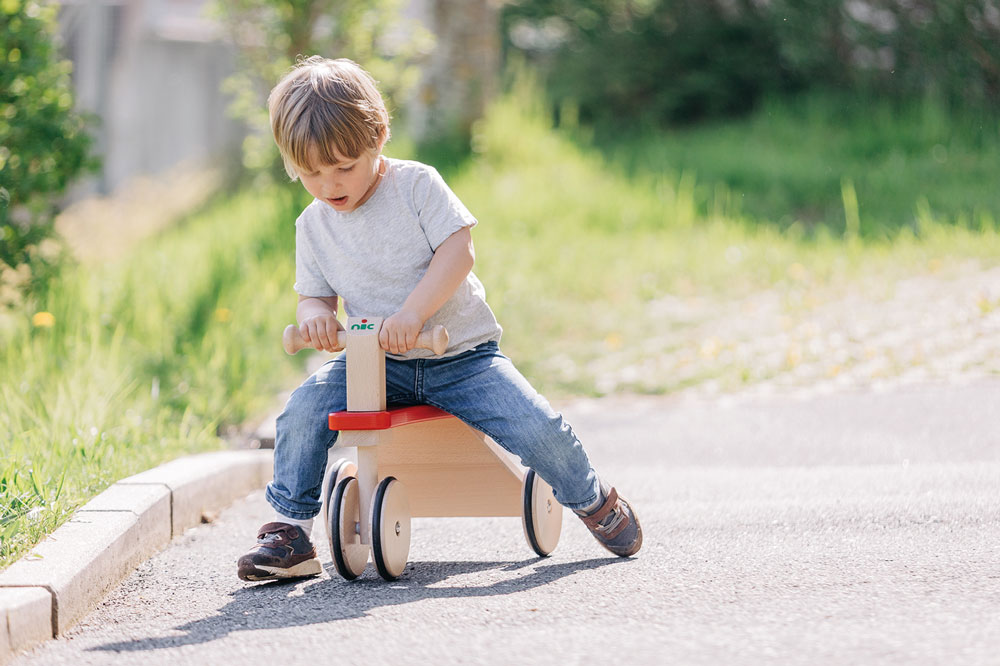 Robuster, zuverlässiger und sicherer Kinder-Rutscher mit Holzrädern, PE-Reifen für die Laufruhe sowie stabilen Stahlachsen. Der sportlich-klassische Kinder-Flitzer mit dem griffigen, weich abgerundeten, kindgerechten Lenkergriffen, ist aus massivem Buchenholz in aufwendiger und sorgfältiger Handarbeit gefertigt. Stabile Fahrzeuge aus gutem Massivholz sind beliebte und zugleich zeitlose Klassiker der Kindheit. Sobald Babys bzw. Kleinkinder selbständig auf- und absteigen können, ist die Zeit der Holz-Rutscher gekommen. Dann wird mit den Füßen Schwung genommen und die ersten Fahrten steigern sich rasch zu kleinen Rennen durch die Wohnung. Eine sehr gute, hochwertige Qualität der Kinder-Holzfahrzeuge sorgt dafür, dass diese kippsicher, stabil und unfallvermeidend sind. Die ersten Kinderfahrzeuge können Kinder jahrelang begleiten – solange, bis die Beine endgültig zu lang gewachsen sind. (Und selbst dann hat unsere Erfahrung gezeigt, dass große Geschwister sich manchmal noch ganz schön klein machen können, um wieder die Holzfahrzeuge ihrer frühen Kindheit in Betrieb zu nehmen. Gut, wenn die Holzfahrzeuge das durch ihre unverwüstliche Qualität und Stabilität „aushalten“ können.)