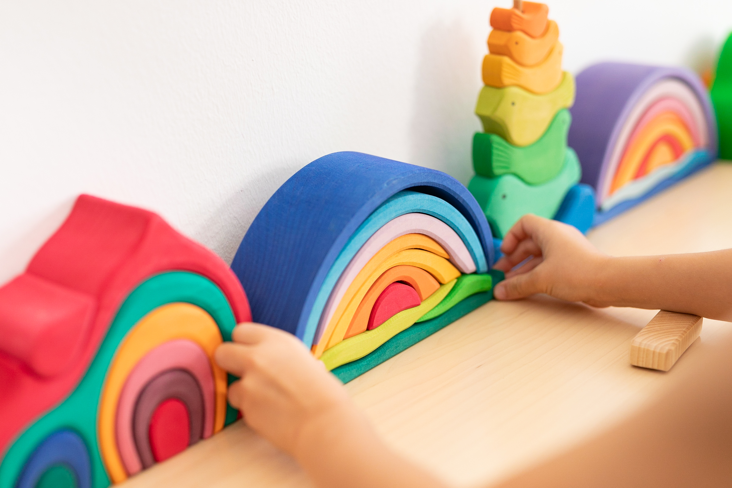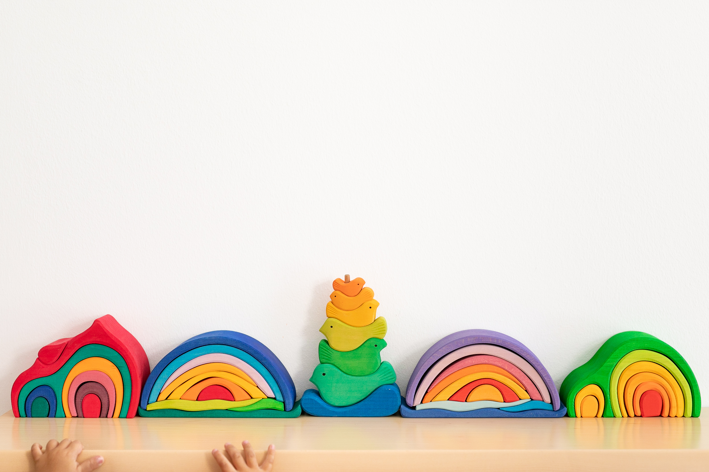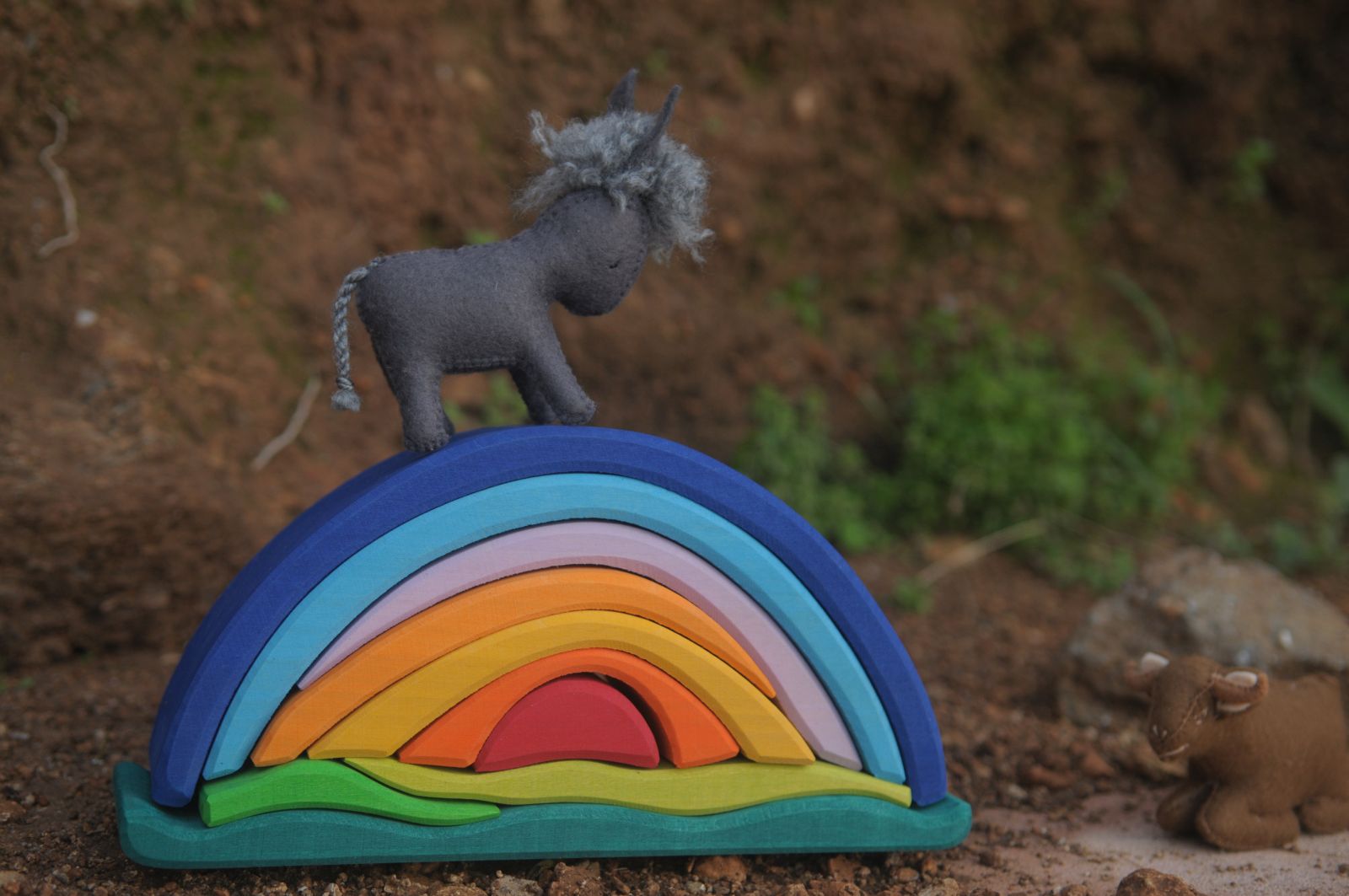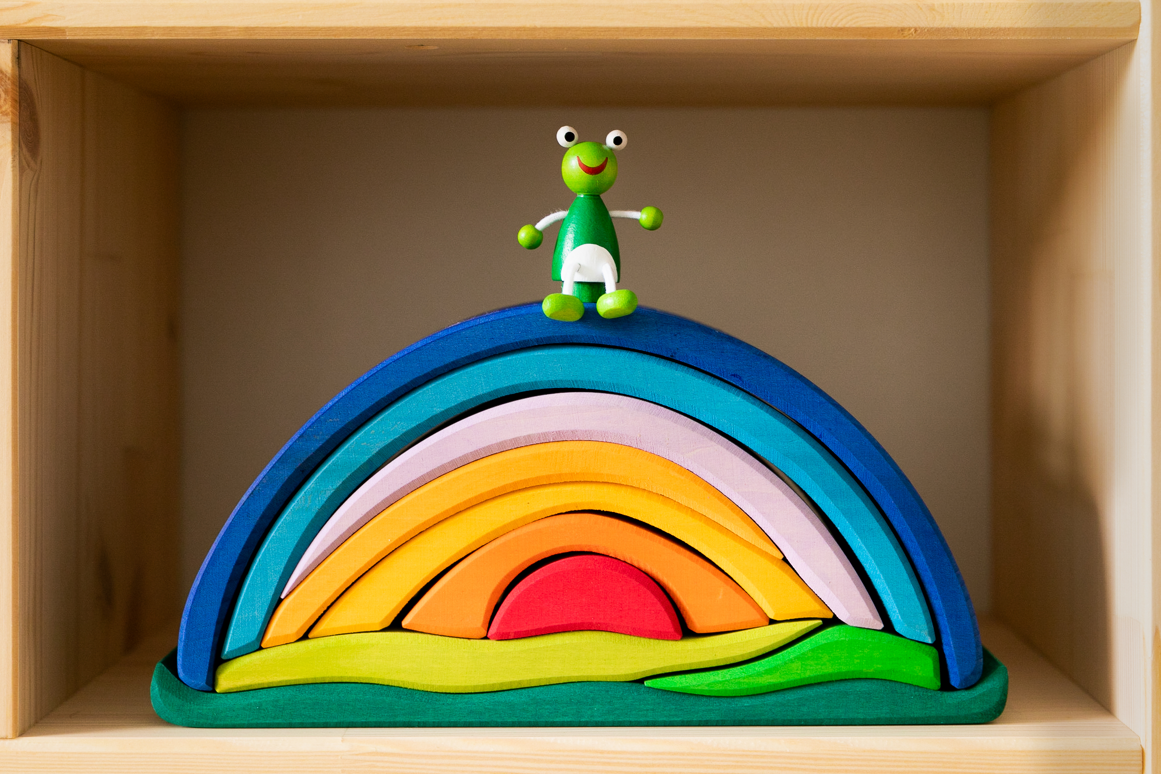 Der Sonnenaufgang über dem Horizont ist ein Moment, der uns innehalten und staunen lässt. Das prächtige Farbenspiel von Blau- und Violett-Farbtönen über grünen Hügeln, die sich über Orange und Gelb bis hin zu einem intensiven Rot entwickeln, kann uns bis ins Innerste berühren. Dazu die atemberaubende Schönheit unserer Welt, die gewaltige Schöpfungskraft und das Glück, gerade diesen Moment staunend erleben zu dürfen. Von diesem tiefen Eindruck inspiriert, ist das wunderschöne Formenspiel in seinen leuchtenden Farben entstanden.Das sorgfältig gearbeitete, liebevoll gestaltete Holzspielzeug trägt die leuchtend-frischen Farben der aufgehenden Sonne und zugleich des blauen Sommerhimmels in sich. Die einzelnen Holzteile des Formenspiels dürfen ganz freilassend und kreativ ins Spiel der Kinder hineinfinden. Oder aber wie ein Holz-Puzzle wieder zusammengebaut werden.Auch als Dekoration für den Jahreszeitentisch oder den bunten Kinderfeste-Tisch zaubern die bunten Bogen- und Formenspiele aus Holz sehr schöne, stimmungsvolle Bilder. Zum Beispiel, wenn man sie liebevoll mit Blumen, Püppchen, Holztieren, Kerzen und Naturmaterialien neben Kuchen und duftendes Gebäck einbettet. Hochwertige, sorgfältig hergestellte Holzbausteine und Formenspiele aus guten Naturmaterialien sind ein pädagogisch sehr wertvolles und zeitloses Holzspielzeug für Kinder. Im fantasievollen, ruhigen Spiel der Kinder kann so aus den freien Formen immer Neues entstehen. Ganze Spielewelten, die zusammen mit Holztieren, Figuren und Püppchen, Dekorationstüchern und Naturmaterialien ausgebaut und kreativ erschaffen werden. Entgegen den Spielzeugen, denen ein fester Spielsinn bereits eingeschrieben ist, wird hier das Freie im Spiel der Kinder pädagogisch sanft gefördert und so dem kraftvollen Impuls des Erschaffens aus der eigenen Fantasie Raum gegeben. Und wenn einmal die Zeit gekommen ist, in der Kinder die ersten Holzspielzeuge hinter sich lassen, so sind die wunderschön gestalteten Formenspiele auch im Regal oder einem anderen geeigneten Platz eine warme, liebevolle Reminiszenz an die frühe Kindheit. Und erfreuen das Auge der Betrachtenden durch ihre wohltuende Farbgestaltung und harmonische Formgebung.