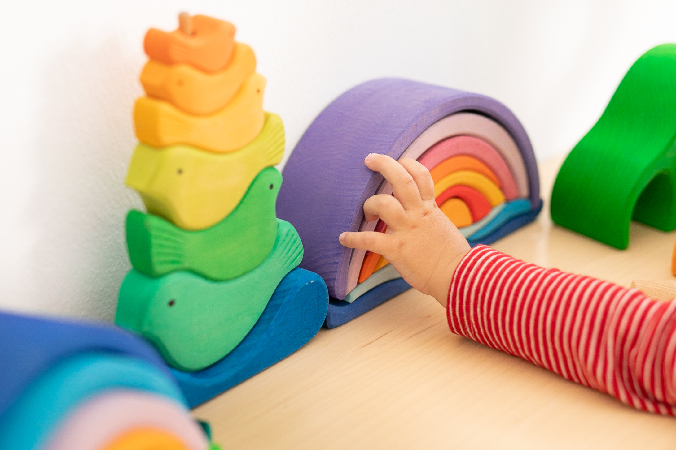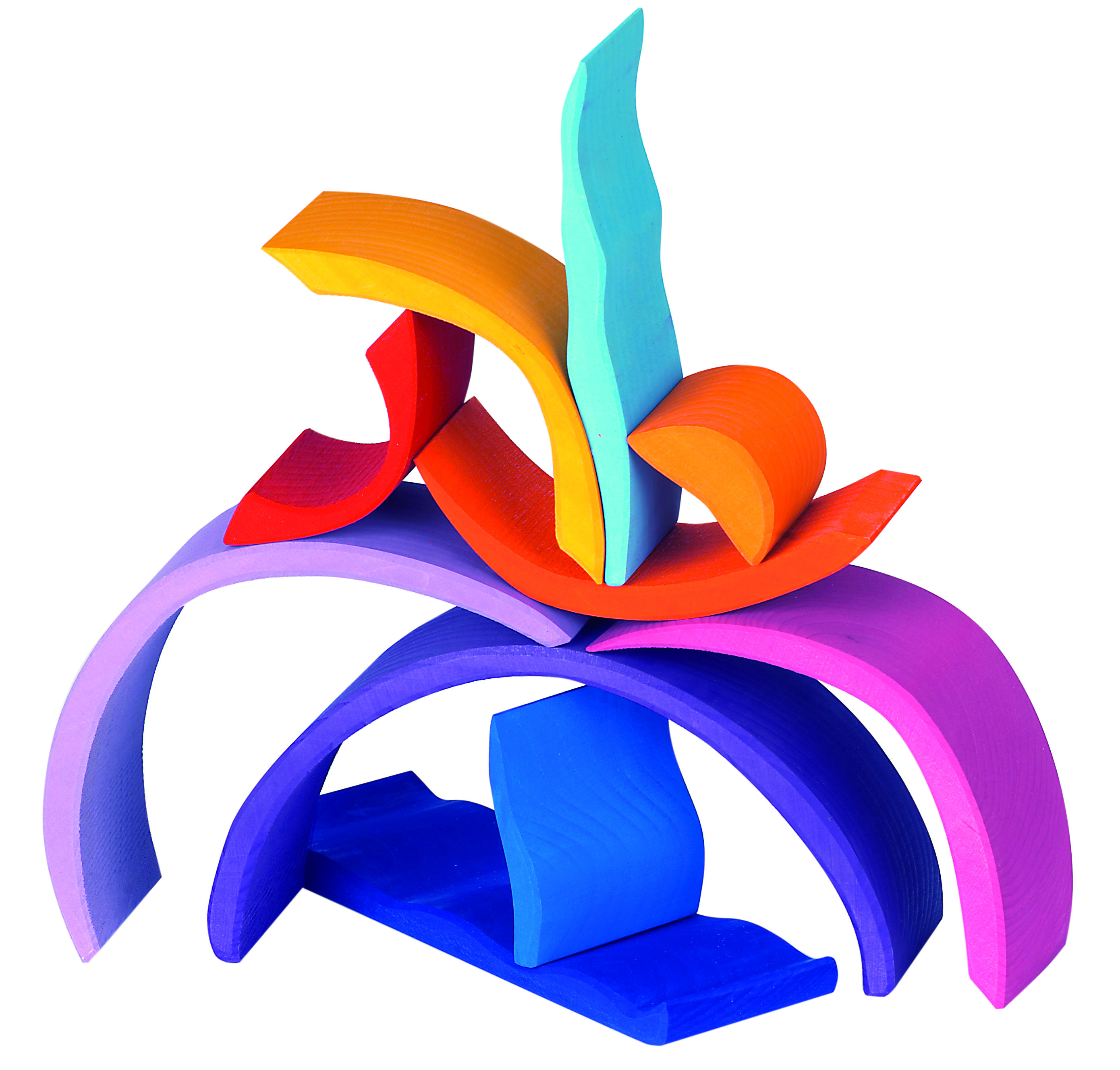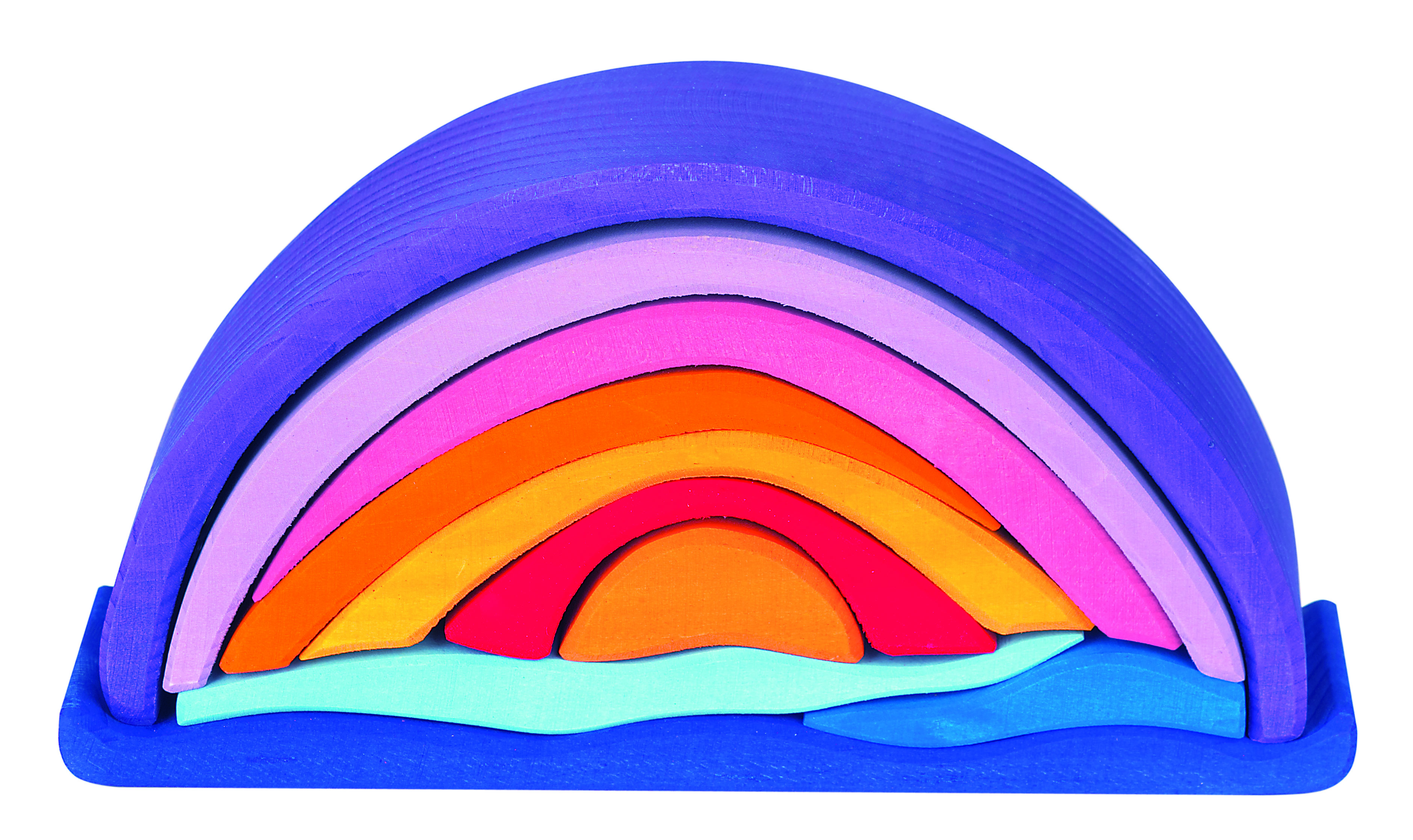 Der Sonnenuntergang über dem Meer ist ein Moment, der uns innehalten und staunen lässt. Das prächtige Farbenspiel von Blau- und Violett-Farbtönen, die sich über Orange und Gelb bis hin zu einem intensiven Rot entwickeln, kann uns bis ins Innerste berühren. Dazu die atemberaubende Schönheit unserer Welt, die gewaltige Schöpfungskraft und das Glück, gerade diesen Moment staunend erleben zu dürfen. Von diesem tiefen Eindruck inspiriert, ist das wunderschöne Formenspiel in seinen leuchtenden Farben entstanden. Das sorgfältig gearbeitete, liebevoll gestaltete Holzspielzeug trägt die leuchtend-warmen Farben der untergehenden Sonne und zugleich die der sommerlich-blauen Nachthülle in sich. Die einzelnen Holzteile des Formenspiels dürfen ganz freilassend und kreativ ins Spiel der Kinder hineinfinden. Oder aber wie ein Holz-Puzzle wieder zusammengebaut werden. Auch als Dekoration für den Jahreszeitentisch oder den bunten Kinderfeste-Tisch zaubern die bunten Bogen- und Formenspiele aus Holz sehr schöne, stimmungsvolle Bilder. Zum Beispiel, wenn man sie liebevoll mit Blumen, Püppchen, Holztieren, Kerzen und Naturmaterialien neben Kuchen und duftendes Gebäck einbettet.Hochwertige, sorgfältig hergestellte Holzbausteine und Formenspiele aus guten Naturmaterialien sind ein pädagogisch sehr wertvolles und zeitloses Holzspielzeug für Kinder. Im fantasievollen, ruhigen Spiel der Kinder kann so aus den freien Formen immer Neues entstehen. Ganze Spielewelten, die zusammen mit Holztieren, Figuren und Püppchen, Dekorationstüchern und Naturmaterialien ausgebaut und kreativ erschaffen werden. Entgegen den Spielzeugen, denen ein fester Spielsinn bereits eingeschrieben ist, wird hier das Freie im Spiel der Kinder pädagogisch sanft gefördert und so dem kraftvollen Impuls des Erschaffens aus der eigenen Fantasie Raum gegeben.Und wenn einmal die Zeit gekommen ist, in der Kinder die ersten Holzspielzeuge hinter sich lassen, so sind die wunderschön gestalteten Formenspiele auch im Regal oder einem anderen geeigneten Platz eine warme, liebevolle Reminiszenz an die frühe Kindheit. Und erfreuen das Auge der Betrachtenden durch ihre wohltuende Farbgestaltung und harmonische Formgebung.