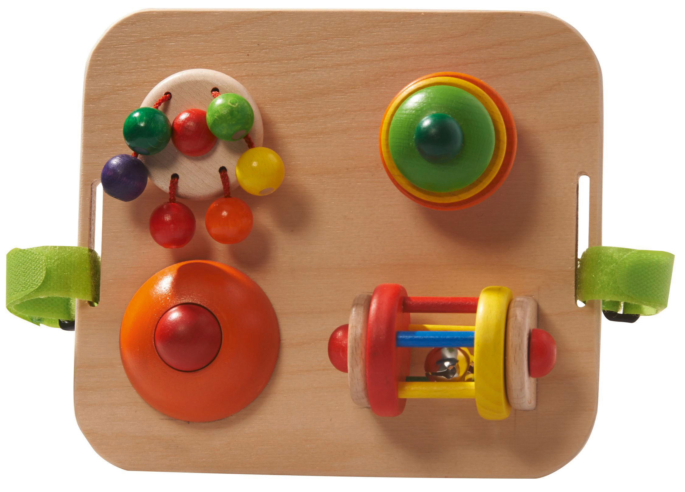 Ob klappern, hupen, drehen, greifen oder betrachten. Die wertigen Baby-Holzgreiflinge regen durch die harmonische Formgebung und kindgerechte Farbgestaltung sanft die Sinne der kleinen Kinder ab ca. 3 Monaten an. Das Ahornholz, aus dem das Baby-Spielzeug gefertigt wurde, ist liebevoll und sorgfältig abgerundet und fein abgeschliffen. So können alle „Funktionen“ und Formen gut mit den Händen erkundet werden. Die Spiel-Tafel kann mit den seitlichen Befestigungsbändern aufgehängt werden, oder man legt sie einfach ohne Befestigung auf die Krabbeldecke. Maße der Spiel-Tafel: 20 x 17,5 x 7,5 cm Babys entdecken die Welt, die sie umgibt mit großer Offenheit und Neugier. Liebevolle, kindgerechte und vor allem sichere Baby-Spielzeuge, die unsere Kinder Schritt für Schritt hinein ins Leben begleiten, sind eine echte Zuwendung. Und ermöglichen es schon den ganz kleinen Kindern, mit allen Sinnen zu begreifen. Unsere Holzspielzeuge sind alle in sorgfältiger Handarbeit entstanden. Sie sind aus hochwertigen Massivhölzern gefertigt, robust und sicher verarbeitet. Dabei haben wir neben dem pädagogischen Spielwert und der Sinnhaftigkeit unserer Holzspielzeuge immer auch auf eine langlebige, solide Qualität geachtet. Die Baby-Spiel-Tafel ist aus bestem Ahornholz gefertigt und mit speichelechten Farben auf Wasserbasis liebevoll gestaltet. Die Holzgreiflinge sind sicher und fest auf der Platte montiert.