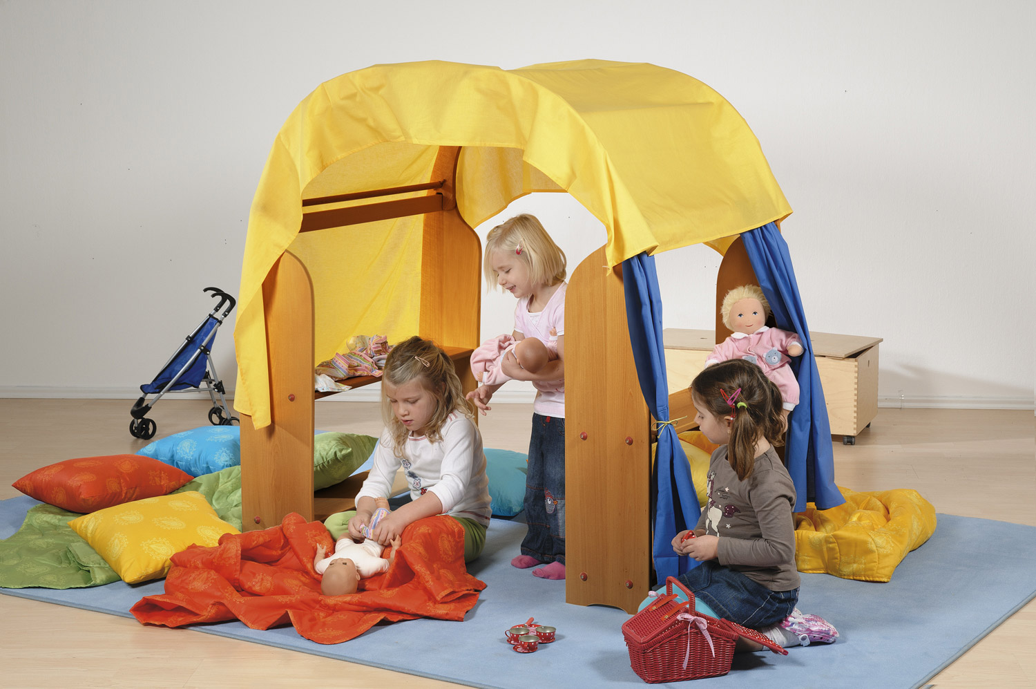 Kinder bauen sich ihre Welt am liebsten selbst. Mit unseren großen, robusten und stabil gebauten Spielmöbeln aus massivem Lindenholz können kleine wie große Kinder ihrer Kreativität und Fantasie freien Lauf lassen. Das große Spielhaus ist ein sehr wertvolles und wunderschönes Geschenk für Kinder. Denn es lässt sich im Spiel und im Leben mit Kindern über die Jahre immer wieder neu gestalten. Als gemütlich eingerichteter Rückzugsort und Kuschelnest kann es den Kindern kleine Pausen und Auszeiten ermöglichen, in denen sie sich einfach einmal zurückziehen können. Zusammen mit einer Kinderküche aus Holz wird das Häuschen zu einem richtigen Familienhaus, in dem gekocht, gewohnt, geschlafen wird. Oder aber es zieht ein tüchtiger Kaufmann samt Laden in das Spielhaus hinein und die seitlichen Spielständer werden zur Verkaufstheke. Auch ein Puppentheater kann hier entstehen, bei dem ebenfalls einer der beiden seitlichen Spielständer mit einem Vorhang oder Spieltüchern in eine Bühne verwandelt wird. Eine Kinderpost kann hier eröffnen oder ein Detektivbüro – je nachdem, was in der wunderbaren Fantasie der Kinder entsteht. Das liebevoll und mit großer Sorgfalt gearbeitete Spielhaus aus wertvollem, geöltem Lindenmassivholz besteht aus 2 Spielständern, 2 Dachbögen und 2 Verbindungselementen, die auch auseinandergenommen und einzeln verwendet werden können. Die Breite ist zwischen 130 und 140 cm verstellbar, die Höhe beträgt ca. 150 cm und die Tiefe 90 cm.