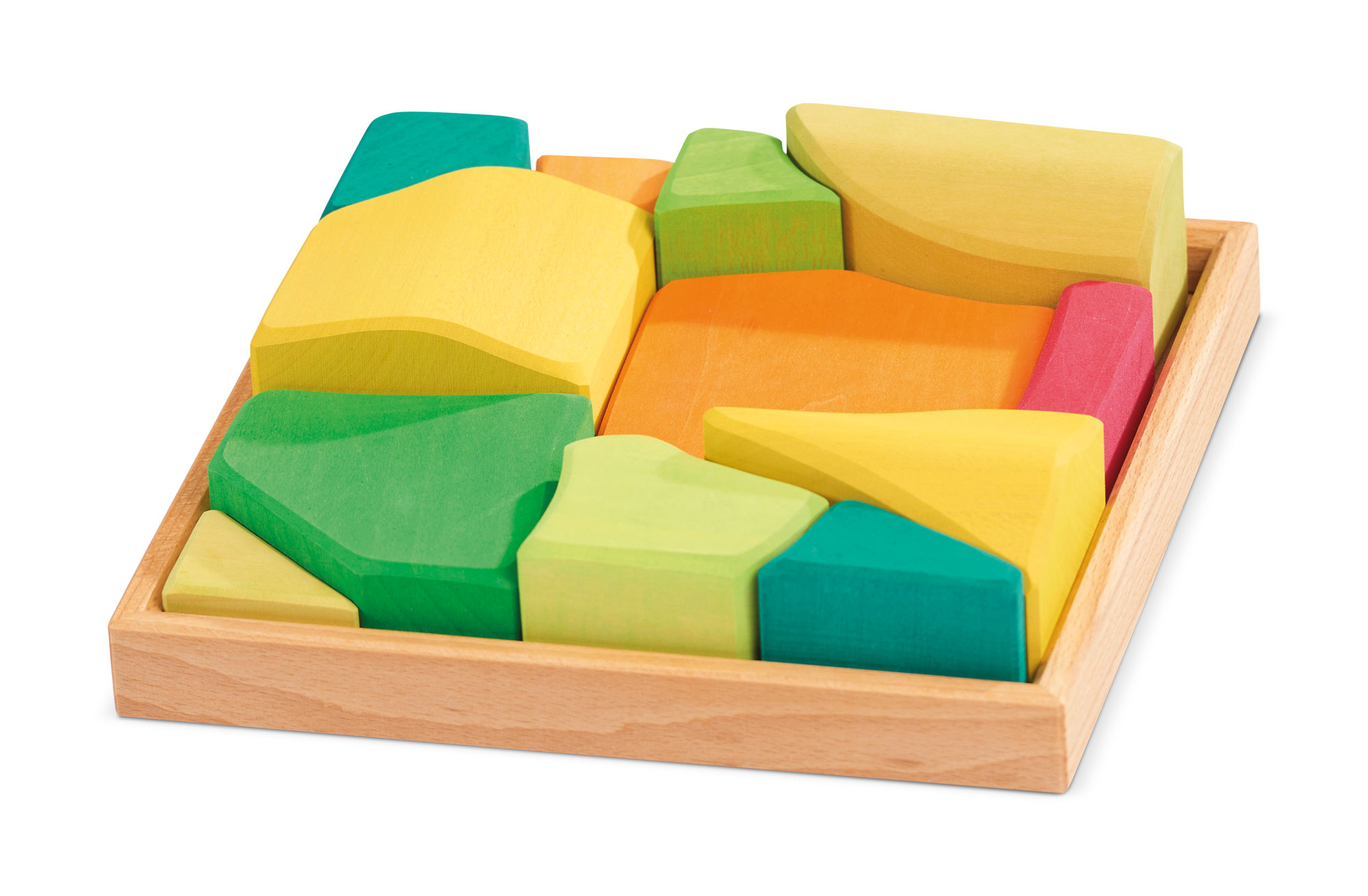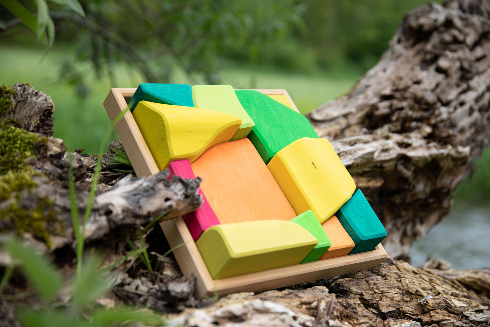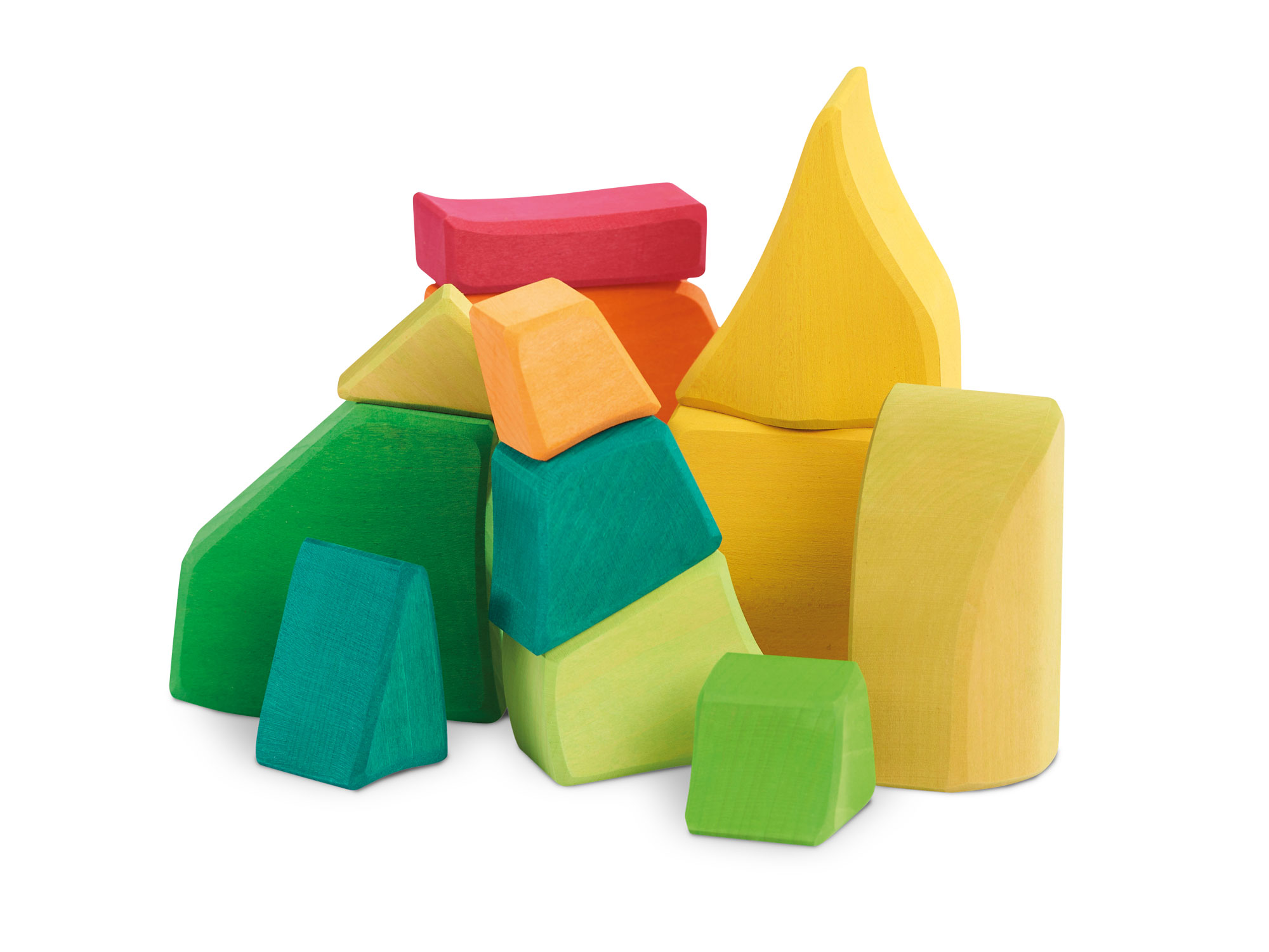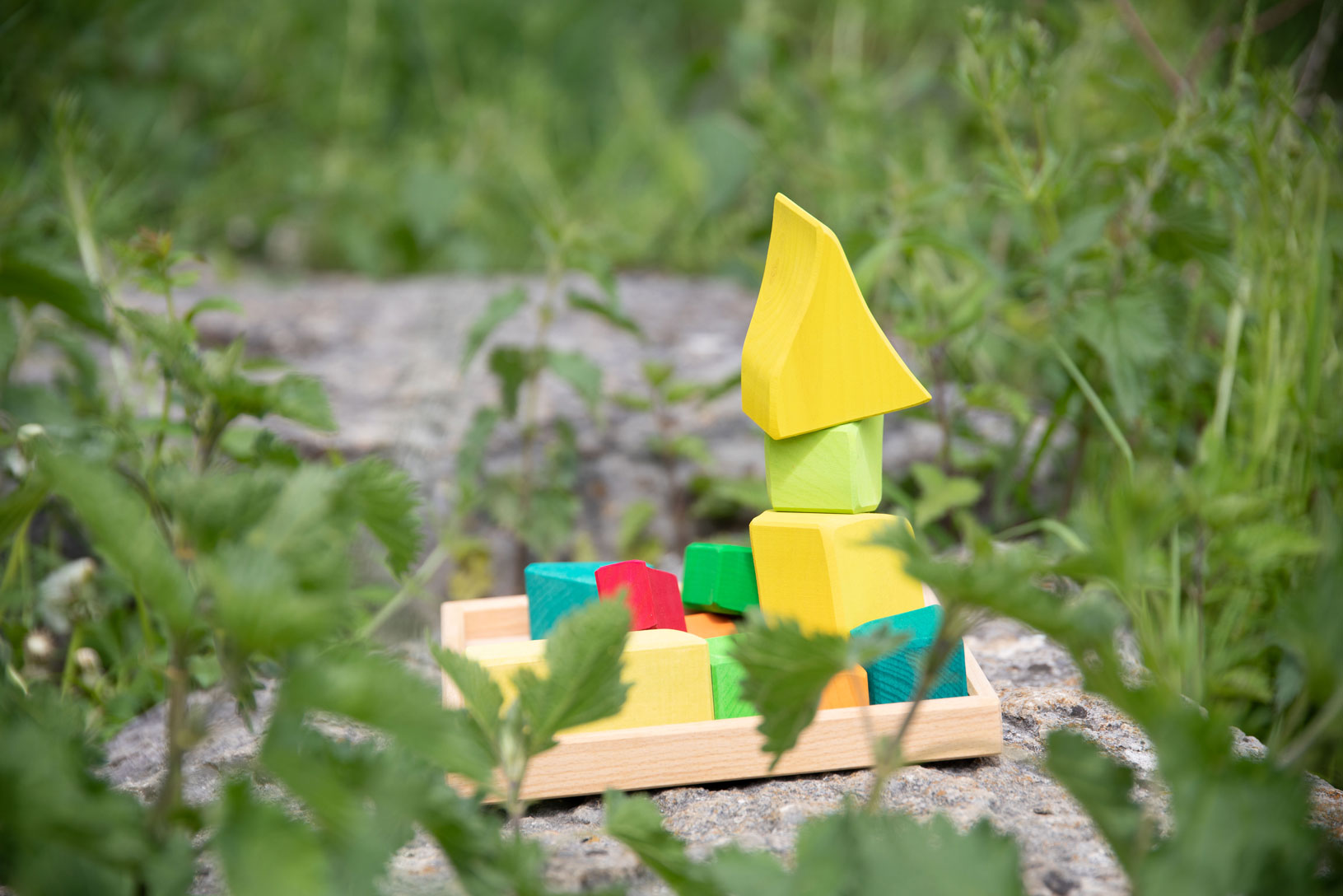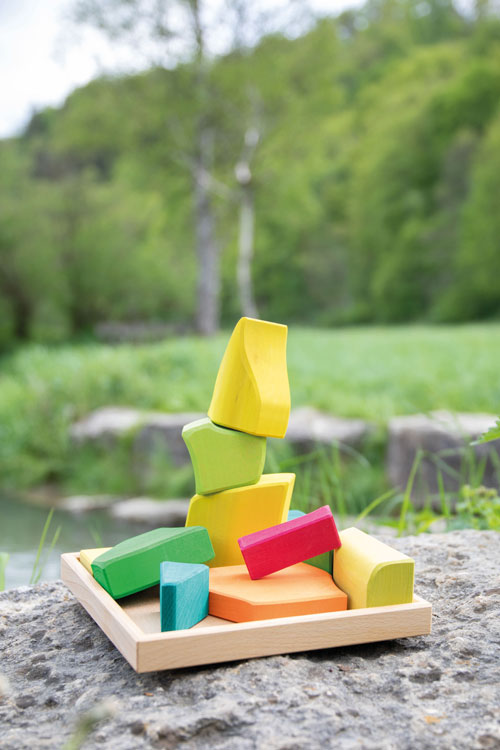 Lachend und leuchtend wird es, wenn der prächtige Sommer Einzug hält. Da sind die Farben getränkt von Sonne und Wärme, das goldene Gelb der Kornfelder, das sommerlich-satte Grün der Bäume, Wiesen und Büsche und das strahlende, tiefe Leuchten der Sommerblüten in vielen bunten Farben. Die wunderschönen Jahreszeiten-Holzbausteine von Glückskäfer sind von einer ganz besonderen Anziehungskraft. Das in den Farben der jeweiligen Jahreszeit harmonisch lasierte Lindenholz hat sanft abgerundete bzw. angefaste Ecken und Ränder. Die Formen der Holzbausteine sind gerundet und sehr schön geschwungen – aber es sind keine regelmäßigen Formen wie Würfel zu finden. Das Raue der unlackierten Holzoberfläche, durch welche die schöne Maserung des Holzes durchscheint, lässt die Bauklötze sehr gut aufeinander „haften“. Daher wird mit den Jahreszeiten-Bauklötzen ein ganz besonders kreativer, freier Bau-Impuls im Kind gefördert. Hochwertige, sorgfältig hergestellte Holzbausteine aus guten Naturmaterialien sind ein pädagogisch sehr wertvolles und zeitloses Holzspielzeug für Kinder. Im fantasievollen, ruhigen Spiel der Kinder kann so aus den freien Formen immer Neues entstehen. Ganze Spielewelten, die zusammen mit Holztieren, Figuren und Püppchen, Dekorationstüchern und Naturmaterialien ausgebaut und kreativ erschaffen werden. Entgegen den Spielzeugen, denen ein fester Spielsinn bereits eingeschrieben ist, wird hier das Freie im Spiel der Kinder pädagogisch sanft gefördert und so dem kraftvollen Impuls des Erschaffens aus der eigenen Fantasie Raum gegeben. In diesem Rahmen ist es auch so wichtig, dem Spiel der Kinder den notwendigen Raum und die Ruhe zu gewähren. Nur wo Kinder ganz eintauchen können in ihr Schaffen, kann sich die große Kraft des kindlichen Spiels ganz entfalten. Und unsere Kinder in ihrer Entwicklung stärken und festigen.