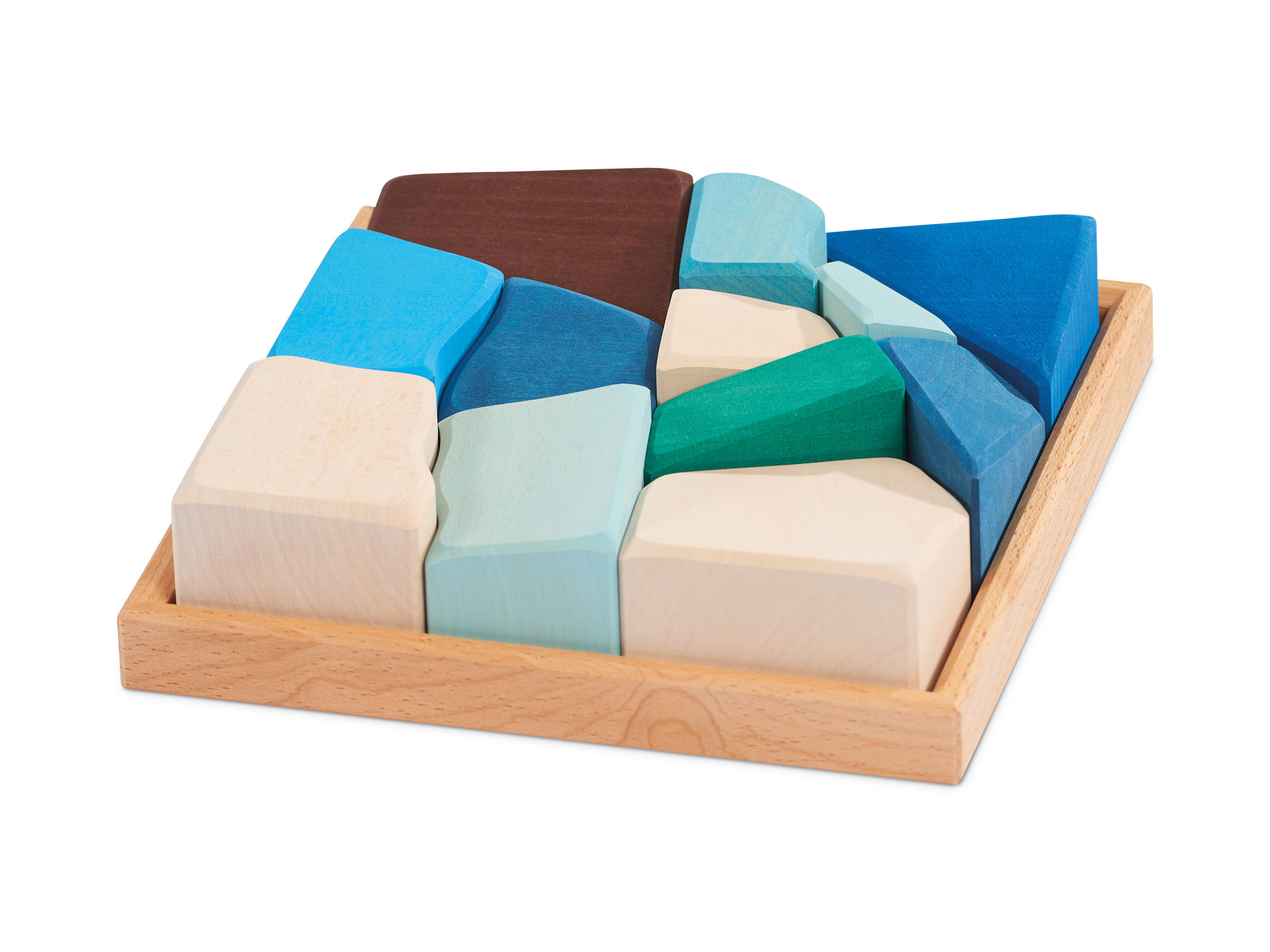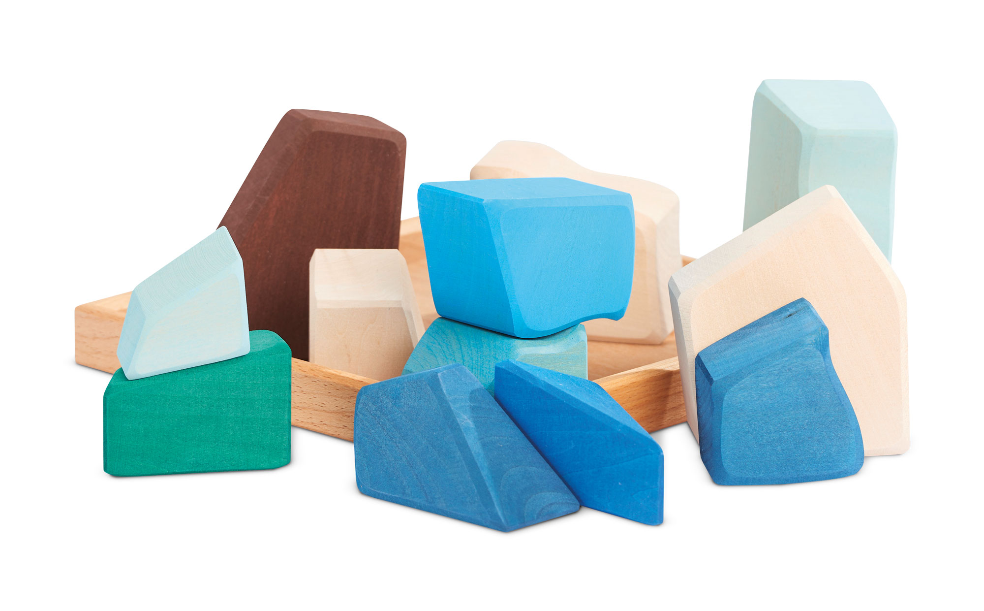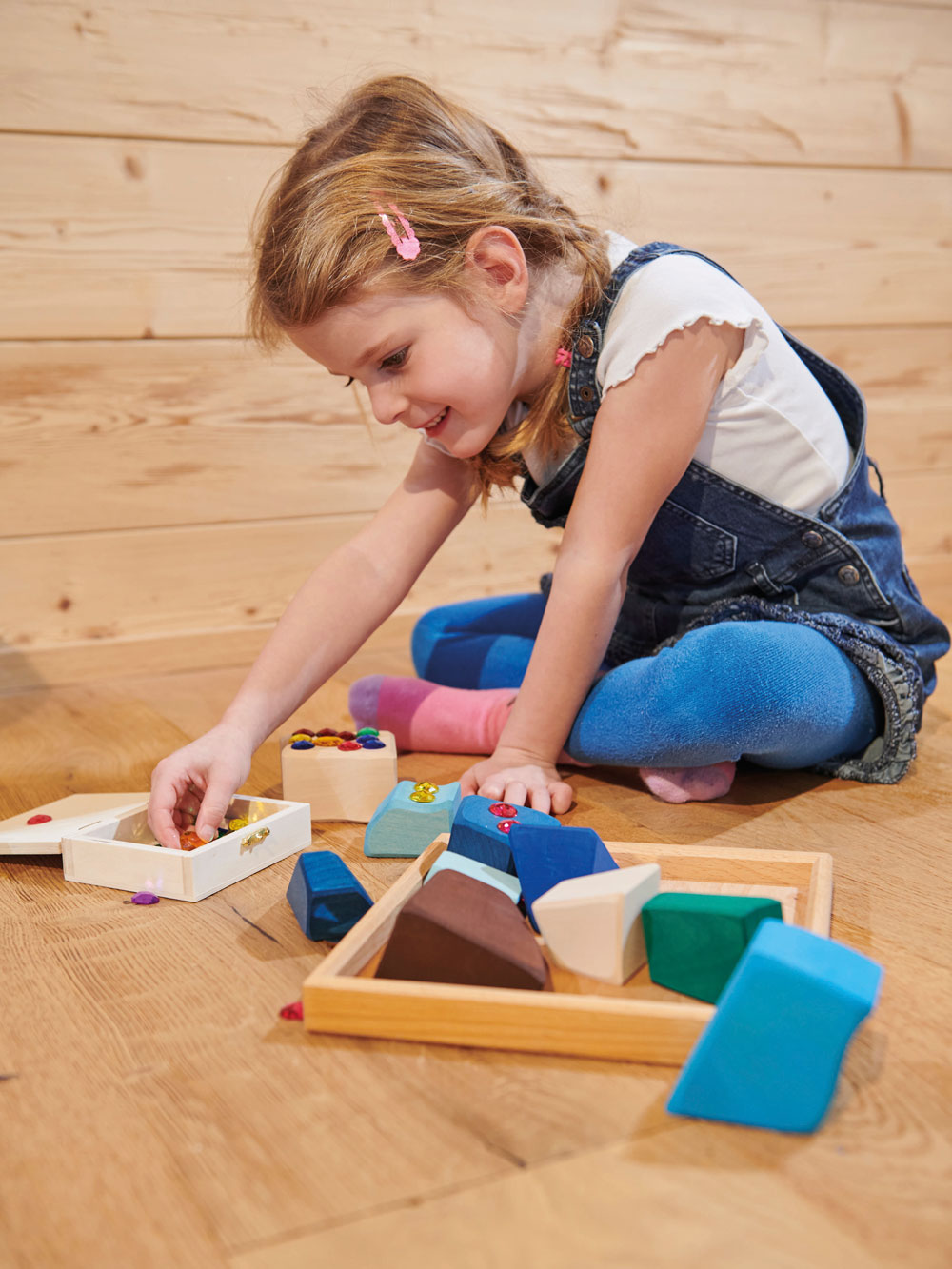 So kommt der Winter in seiner Pracht daher. In hellen, weißen Schnee- und Nebelschwaden, strahlend und eisig blau, manchmal ein wenig ins Grüne sich wendend und wo die Erde sich zeigt, ist sie noch ganz braun. Die wunderschönen Jahreszeiten-Holzbausteine von Glückskäfer sind von einer ganz besonderen Anziehungskraft. Das in den Farben der jeweiligen Jahreszeit harmonisch lasierte Lindenholz hat sanft abgerundete bzw. angefaste Ecken und Ränder. Die Formen der Holzbausteine sind gerundet und sehr schön geschwungen – aber es sind keine regelmäßigen Formen wie Würfel zu finden. Das Raue der unlackierten Holzoberfläche, durch welche die schöne Maserung des Holzes durchscheint, lässt die Bauklötze sehr gut aufeinander „haften“. Daher wird mit den Jahreszeiten-Bauklötzen ein ganz besonders kreativer, freier Bau-Impuls im Kind gefördert. Hochwertige, sorgfältig hergestellte Holzbausteine aus guten Naturmaterialien sind ein pädagogisch sehr wertvolles und zeitloses Holzspielzeug für Kinder. Im fantasievollen, ruhigen Spiel der Kinder kann so aus den freien Formen immer Neues entstehen. Ganze Spielewelten, die zusammen mit Holztieren, Figuren und Püppchen, Dekorationstüchern und Naturmaterialien ausgebaut und kreativ erschaffen werden. Entgegen den Spielzeugen, denen ein fester Spielsinn bereits eingeschrieben ist, wird hier das Freie im Spiel der Kinder pädagogisch sanft gefördert und so dem kraftvollen Impuls des Erschaffens aus der eigenen Fantasie Raum gegeben. In diesem Rahmen ist es auch so wichtig, dem Spiel der Kinder den notwendigen Raum und die Ruhe zu gewähren. Nur wo Kinder ganz eintauchen können in ihr Schaffen, kann sich die große Kraft des kindlichen Spiels ganz entfalten. Und unsere Kinder in ihrer Entwicklung stärken und festigen.