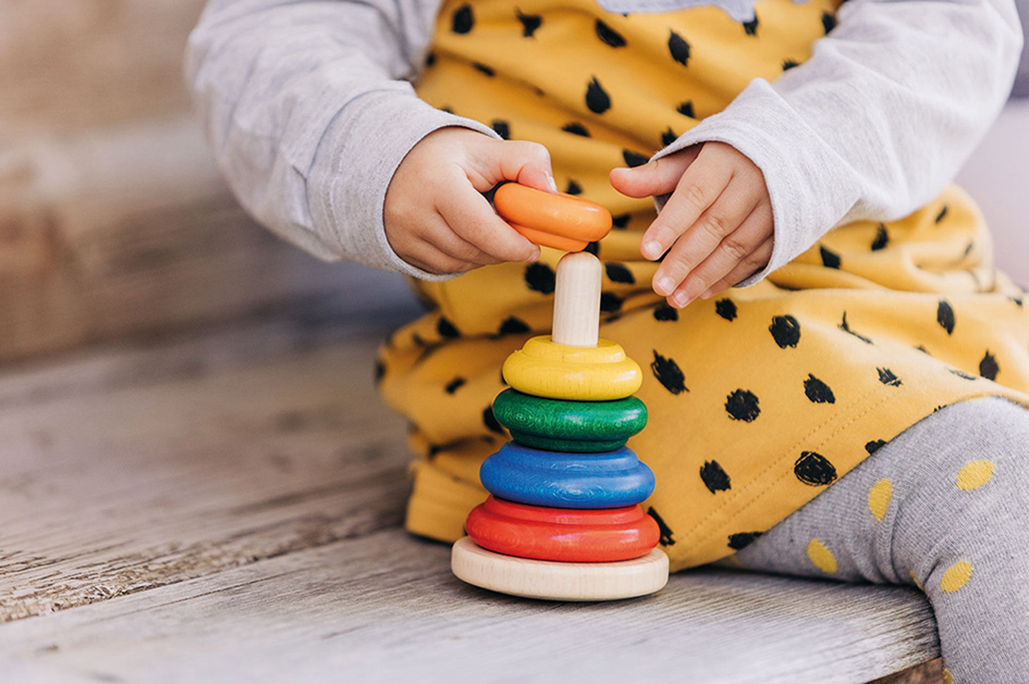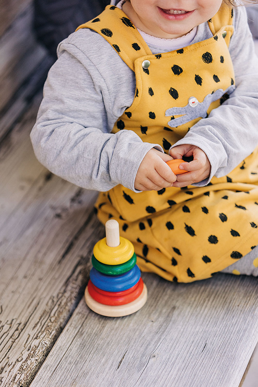 Die Stecksäule ist ein zeitloser Klassiker unter den Baby-Holzspielzeugen. Die Sinne der Allerkleinsten werden durch die wunderschönen Farben, den warmen Werkstoff Holz und seine sanften Maserungen, die natürliche Haptik und die abgerundeten, weichen Formungen im Sehen, Fühlen und Tasten sanft angeregt. So werden von den Babys zunächst die unterschiedlich farbigen Steckteile entdeckt und erkundet, bevor später die motorischen Fähigkeiten durch das Auf- und Abstecken der Formenteile auf den Naturholz-Sockel geübt werden können. Die fünf Formen sind weich abgerundet und mit Farben auf Wasserbasis speichelecht lackiert. Der abgerundete Natur-Holzsockel sorgt für sicheres Spielen.