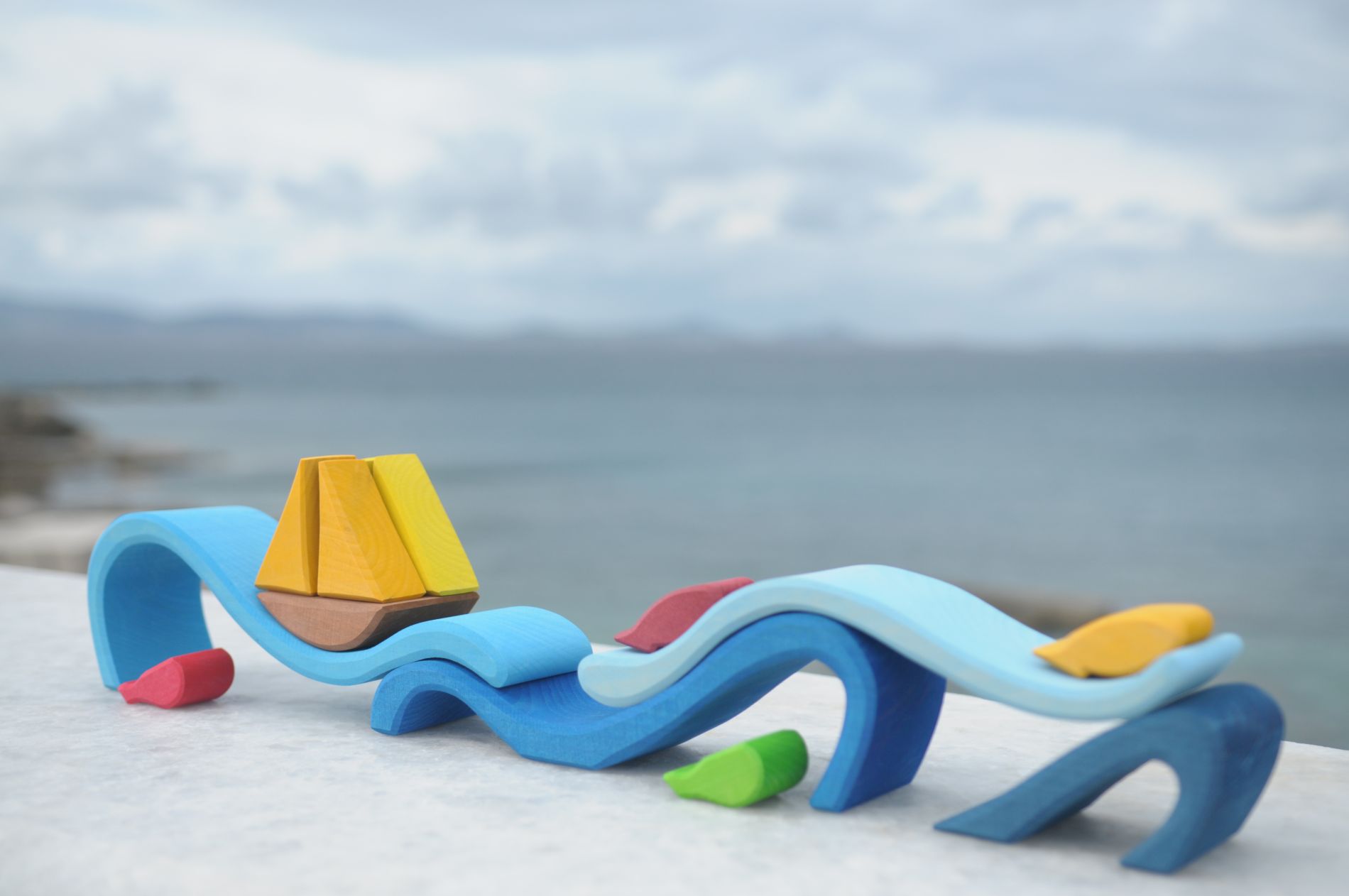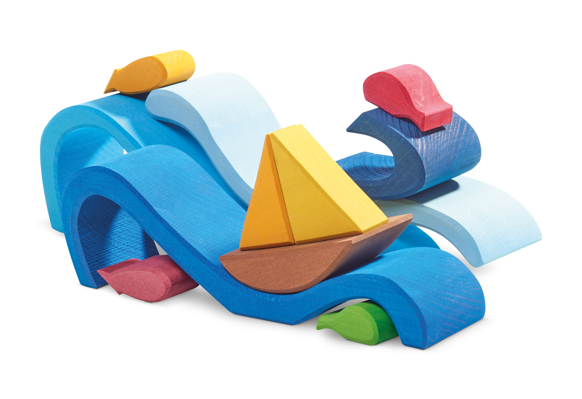 Mit vollen Segeln stolz gebläht vom Wind, fährt das Segelschiff kühn über die hohen Meereswogen. Über die Weiten des Ozeans immer dem Horizont und neuen Abenteuern entgegen… Das sorgfältig gearbeitete, liebevoll gestaltete Holzspielzeug trägt die leuchtend-warmen Farben bunter Fischlein und eines fröhlich dahinsegelnden Schiffes und zugleich die der sommerlich-blauen Meereswellen in sich. Die einzelnen Holzteile des Formenspiels dürfen ganz freilassend und kreativ ins Spiel der Kinder hineinfinden. Oder aber wie ein Holz-Puzzle wieder zusammengebaut werden. Im Spielen erfahren die Kinder haptisch mit ihren Händen ganz unmittelbar den wunderschönen, wertvollen Werkstoff Holz. Das verwendete Lindenholz wurde sorgfältig von Hand an Ecken und Rändern bearbeitet, sodass keine spitzen Kanten vorhanden sind. Das Raue der unlackierten Holzoberfläche lässt die einzelnen Formenteile zudem sehr gut aufeinander „haften“. Daher kann mit den Holzformen auch ganz frei gespielt werden und ein ganz besonders kreativer, freier Impuls wird im Kind gefördert. Auch als Dekoration für den Jahreszeitentisch oder den bunten Kinderfeste-Tisch zaubern die bunten Bogen- und Formenspiele aus Holz sehr schöne, stimmungsvolle Bilder. Zum Beispiel, wenn man sie liebevoll mit Blumen, Püppchen, Holztieren, Kerzen und Naturmaterialien neben Kuchen und duftendes Gebäck einbettet. Hochwertige, sorgfältig hergestellte Holzbausteine und Formenspiele aus guten Naturmaterialien sind ein pädagogisch sehr wertvolles und zeitloses Holzspielzeug für Kinder. Im fantasievollen, ruhigen Spiel der Kinder kann so aus den freien Formen immer Neues entstehen. Ganze Spielewelten, die zusammen mit Holztieren, Figuren und Püppchen, Dekorationstüchern und Naturmaterialien ausgebaut und kreativ erschaffen werden. Entgegen den Spielzeugen, denen ein fester Spielsinn bereits eingeschrieben ist, wird hier das Freie im Spiel der Kinder pädagogisch sanft gefördert und so dem kraftvollen Impuls des Erschaffens aus der eigenen Fantasie Raum gegeben. Und wenn einmal die Zeit gekommen ist, in der Kinder die ersten Holzspielzeuge hinter sich lassen, so sind die wunderschön gestalteten Formenspiele auch im Regal oder einem anderen geeigneten Platz eine warme, liebevolle Reminiszenz an die frühe Kindheit. Und erfreuen das Auge der Betrachtenden durch ihre wohltuende Farbgestaltung und harmonische Formgebung.